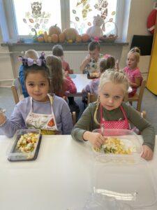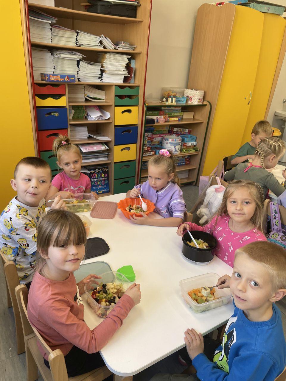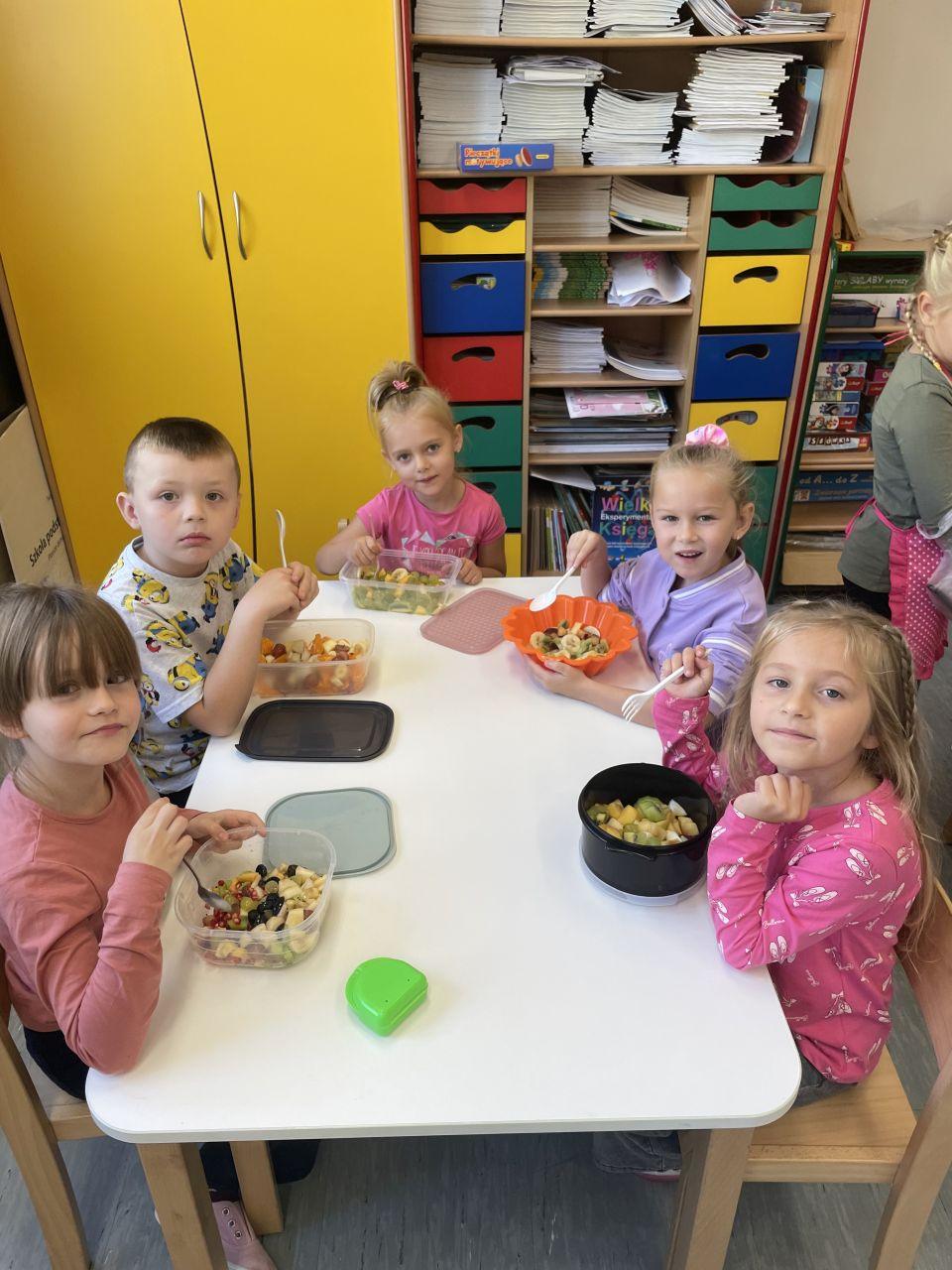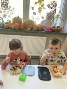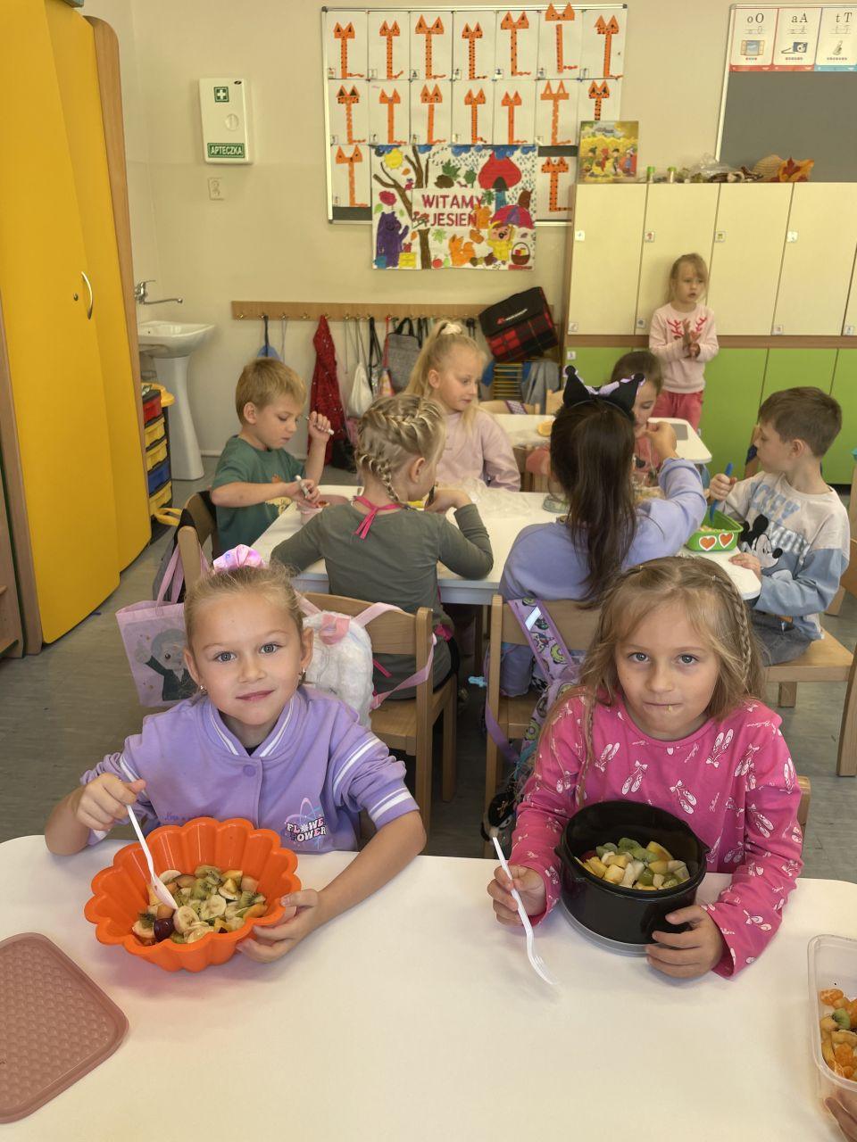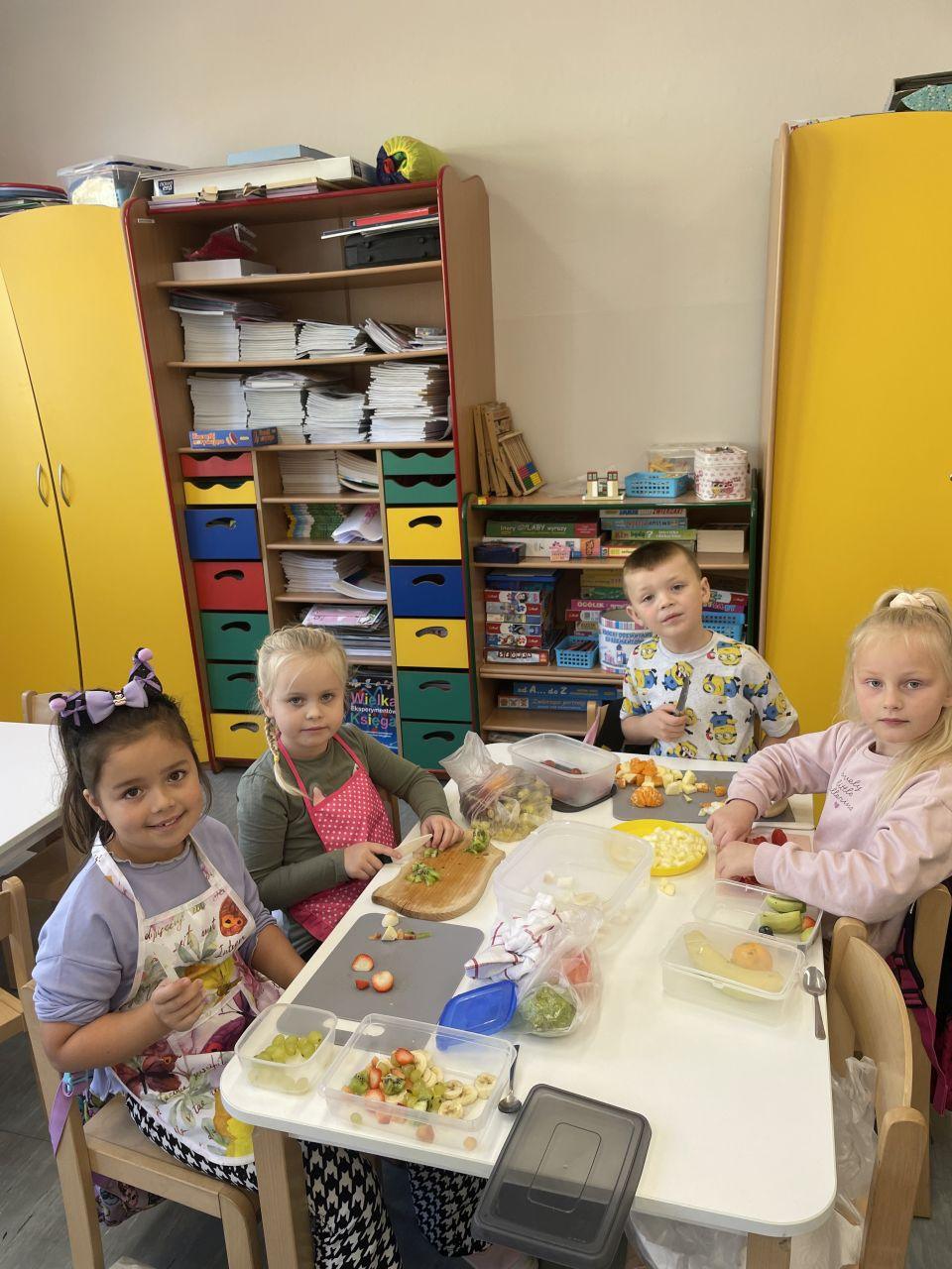 z zamkniętymi oczami rozpoznawały owoce za pomocą zmysłu smaku. Następnie przedszkolaki dokładnie umyły ręce i zabrały się do pracy. Dzieci samodzielnie kroiły ulubione owoce. Na koniec odbyła się degustacja, wszystkie dzieci przyznały, że sałatka była PYSZNA.
