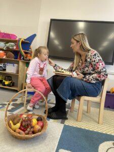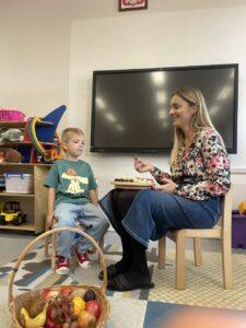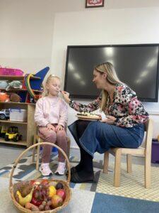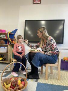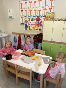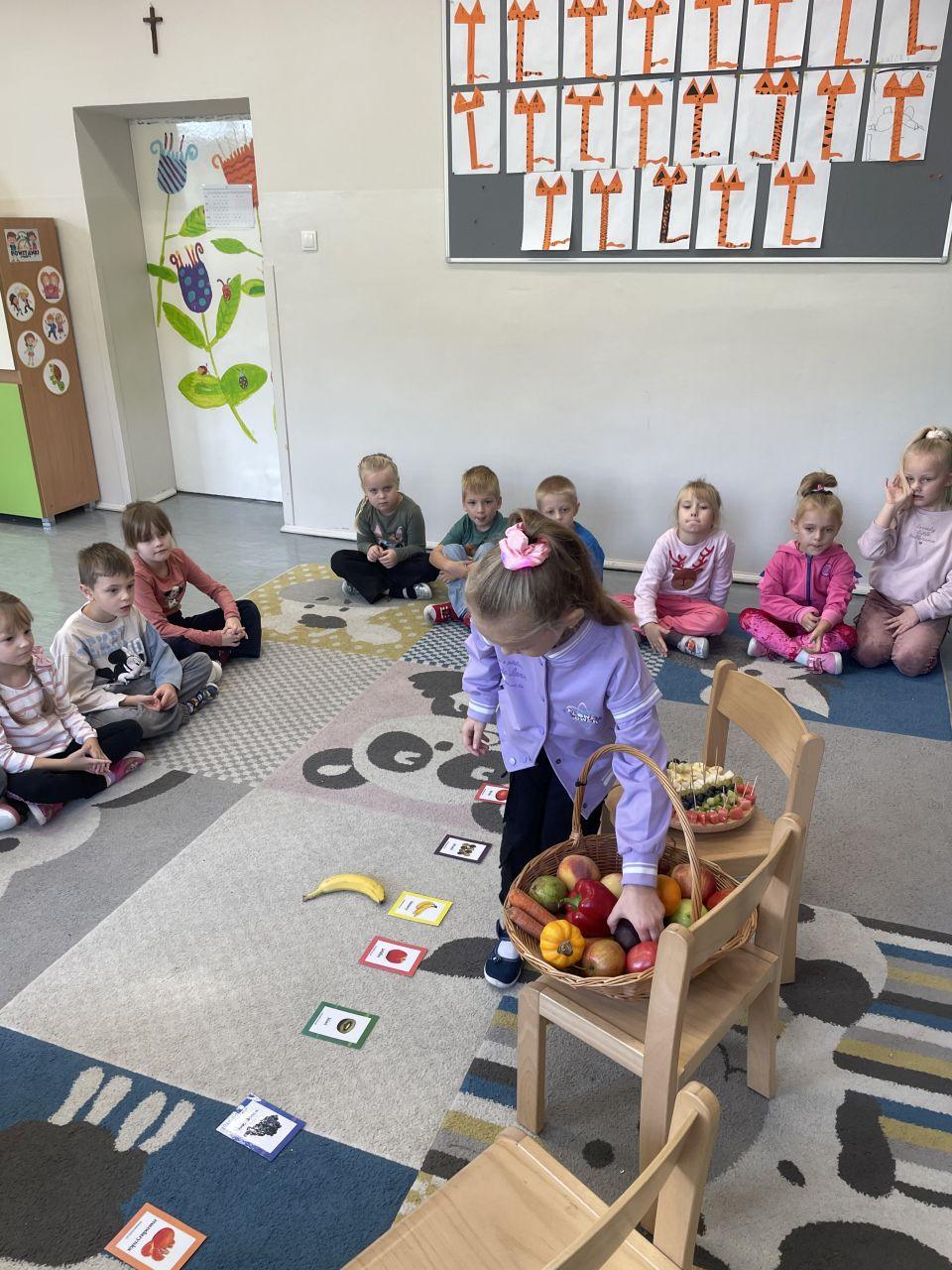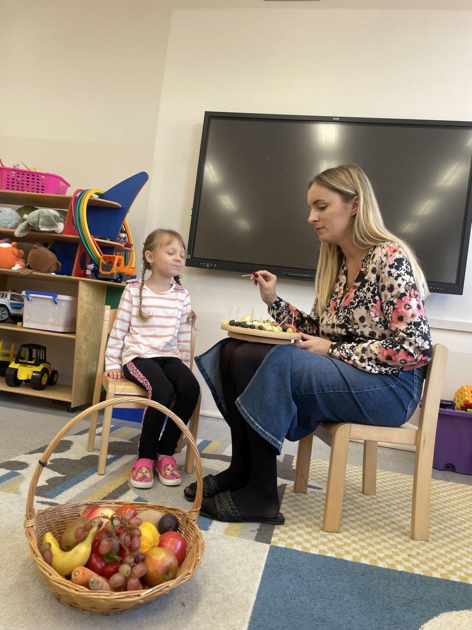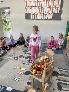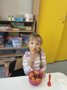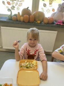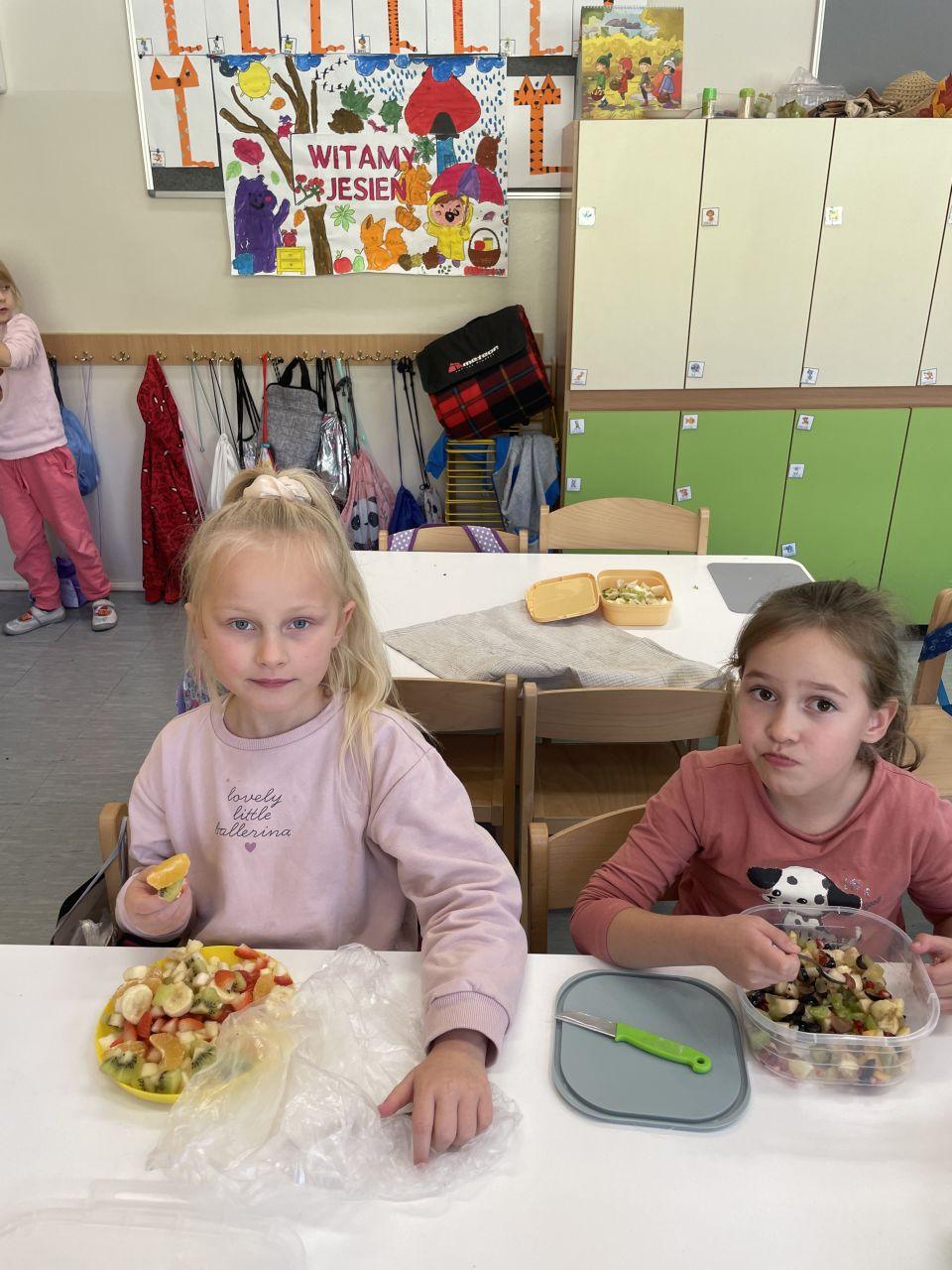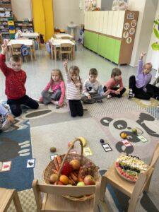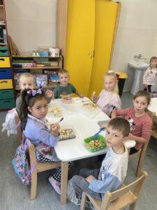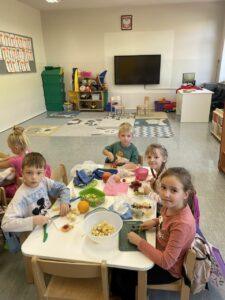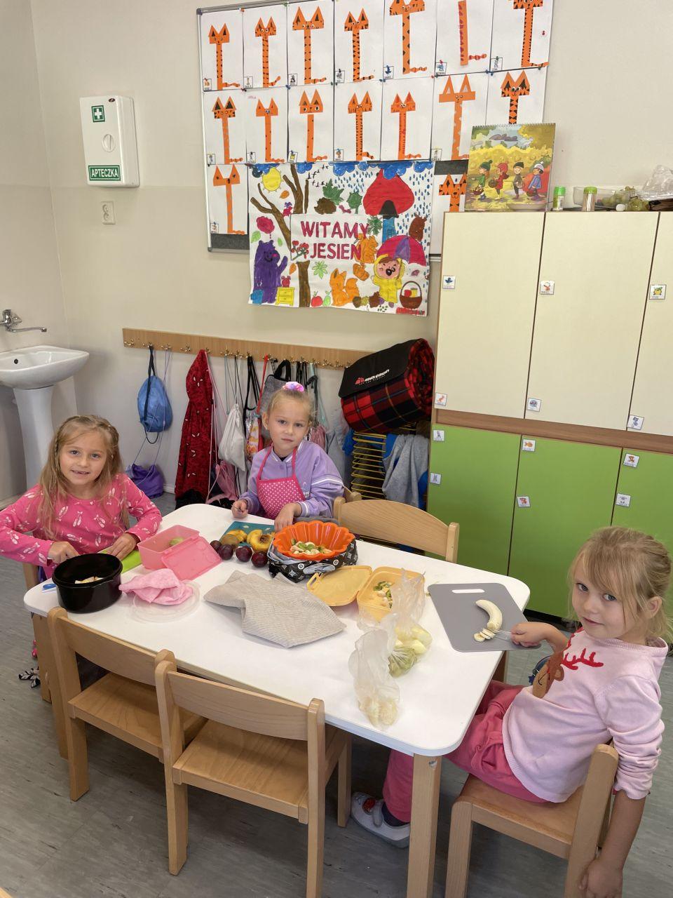 z zamkniętymi oczami rozpoznawały owoce za pomocą zmysłu smaku. Następnie przedszkolaki dokładnie umyły ręce i zabrały się do pracy. Dzieci samodzielnie kroiły ulubione owoce. Na koniec odbyła się degustacja, wszystkie dzieci przyznały, że sałatka była PYSZNA.