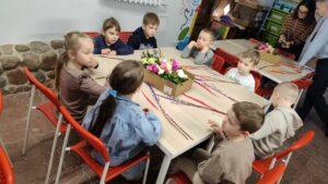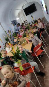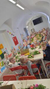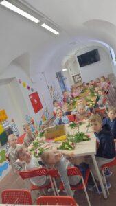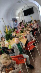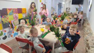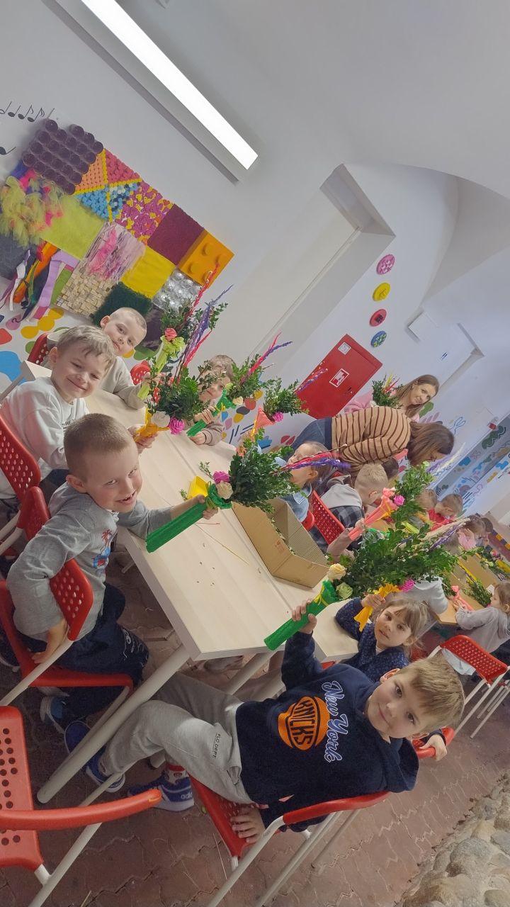 Podczas zajęć warsztatowych przedszkolaki samodzielnie wykonywały kolorowe, barwne palmy wielkanocne. Dzieci od podstaw tworzyły swoje prace, dobierając kolory, układając elementy i ozdabiając palmy według własnych pomysłów. Każda palma była inna, wyjątkowa i odzwierciedlała kreatywność małych twórców. Dzieci pracowały z ogromnym zaangażowaniem, a efekt końcowy zachwycił zarówno prowadzących, jak i opiekunów.