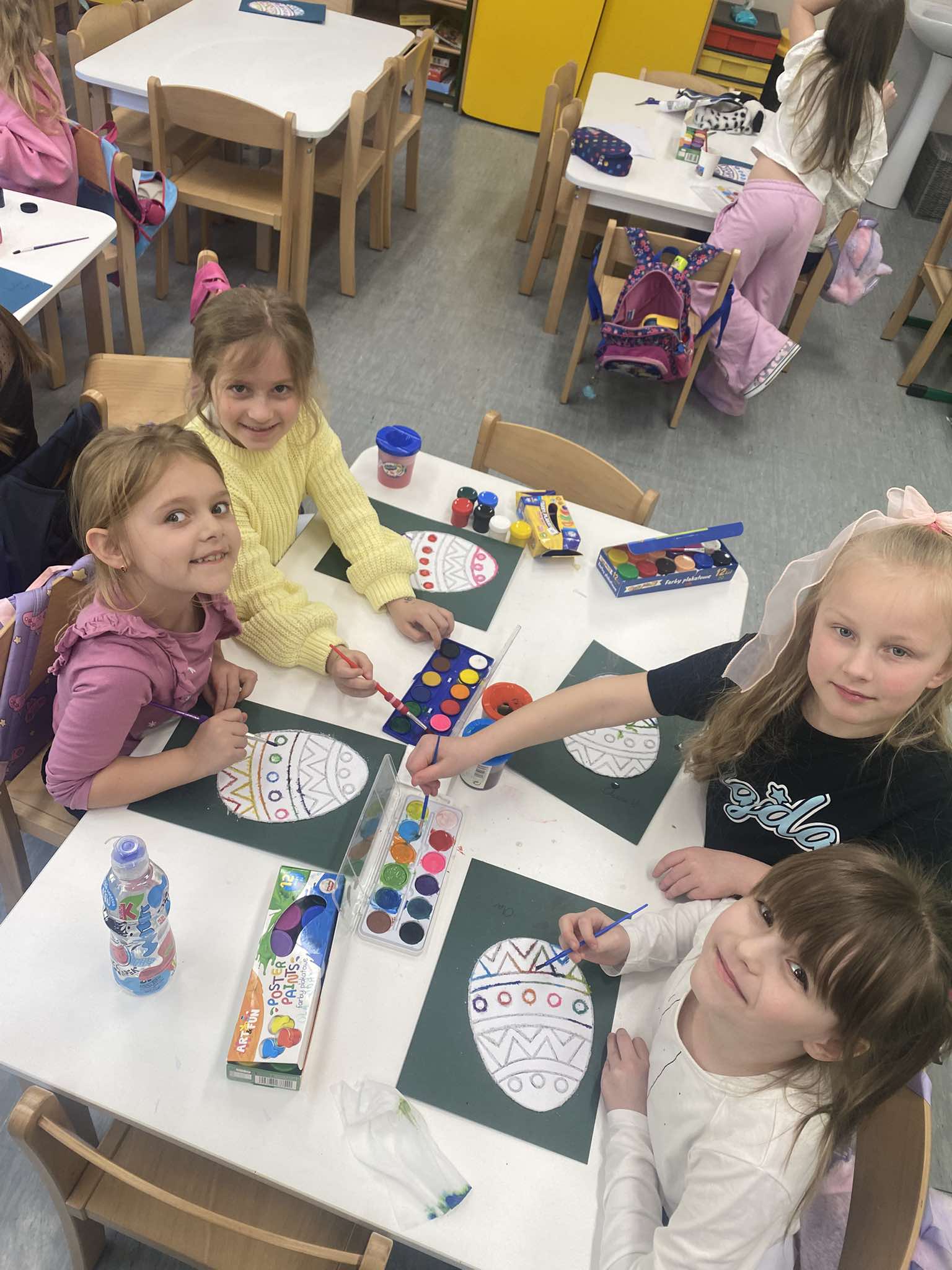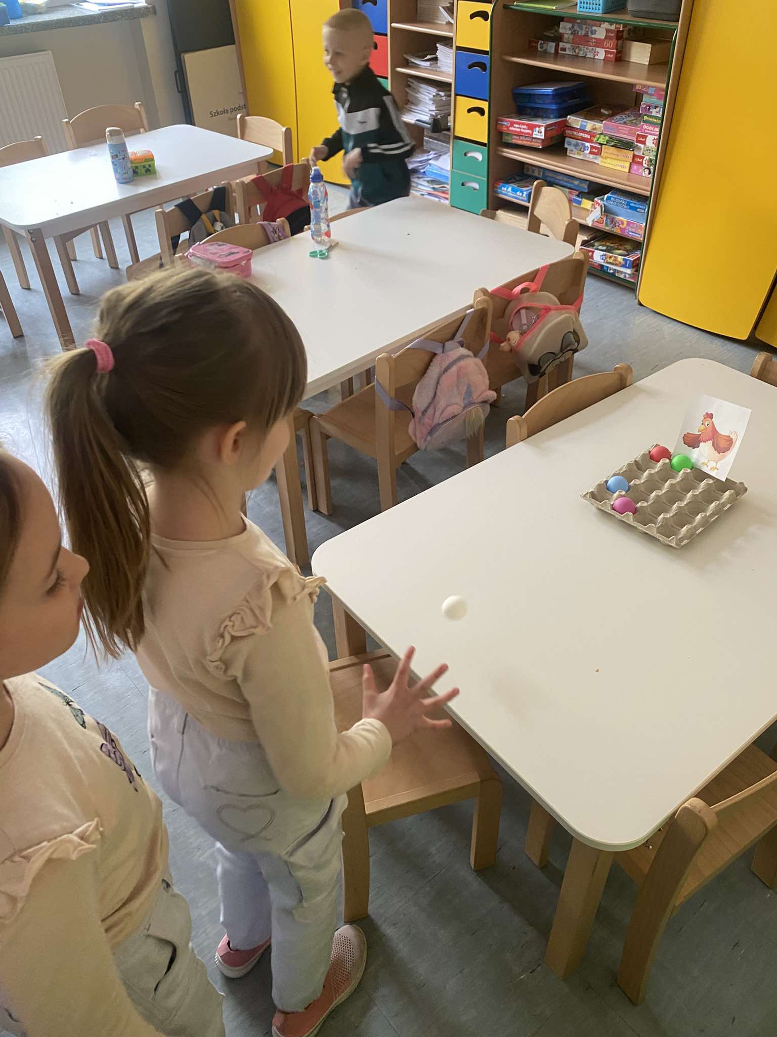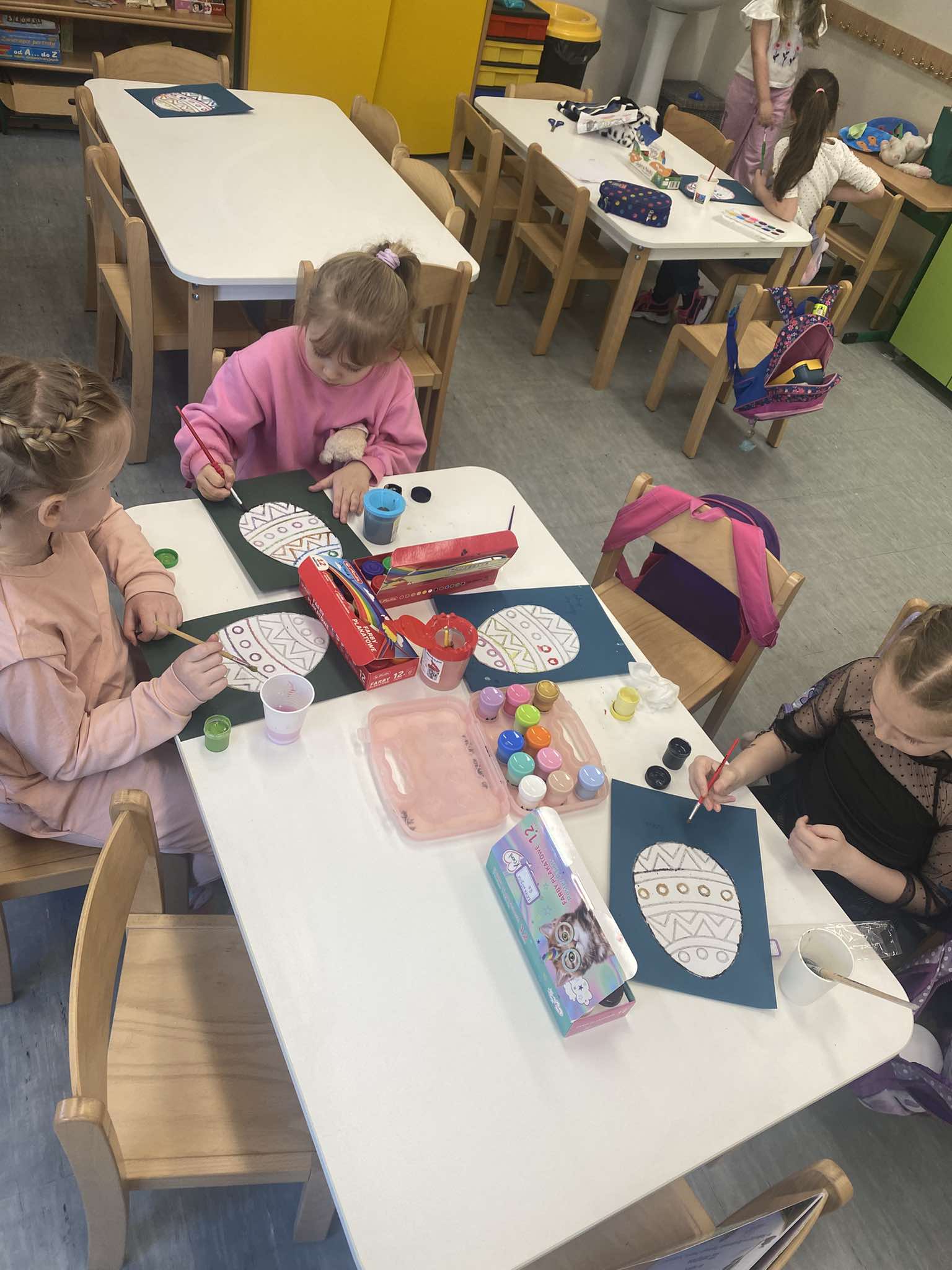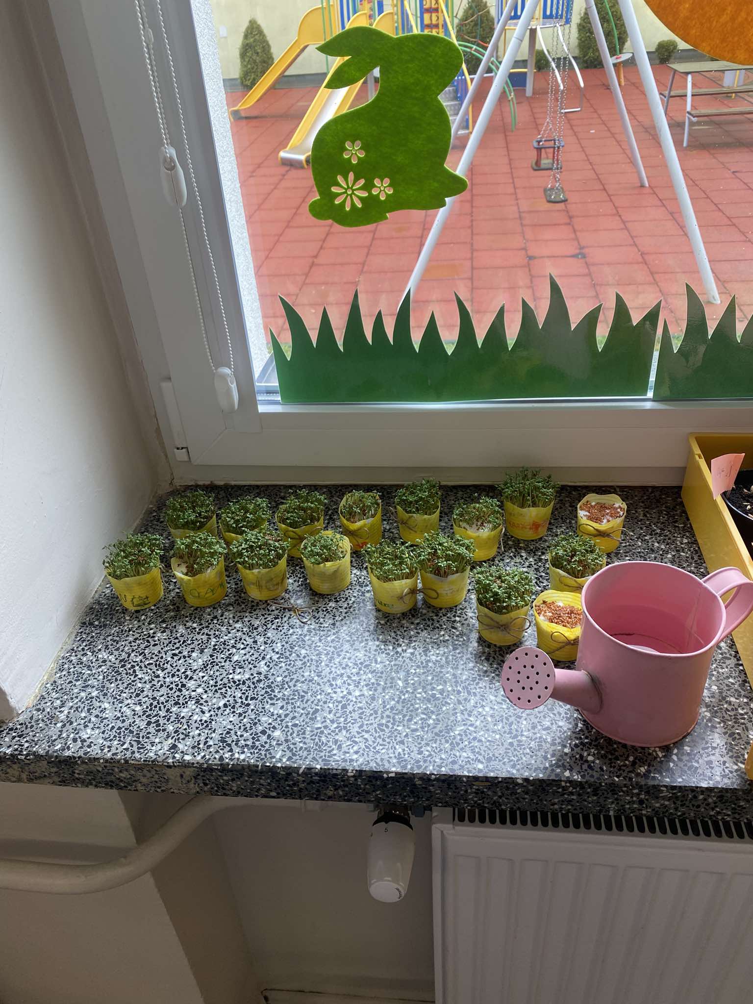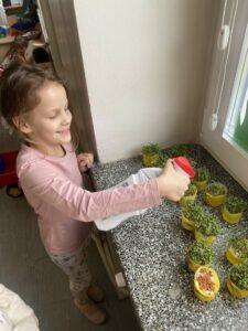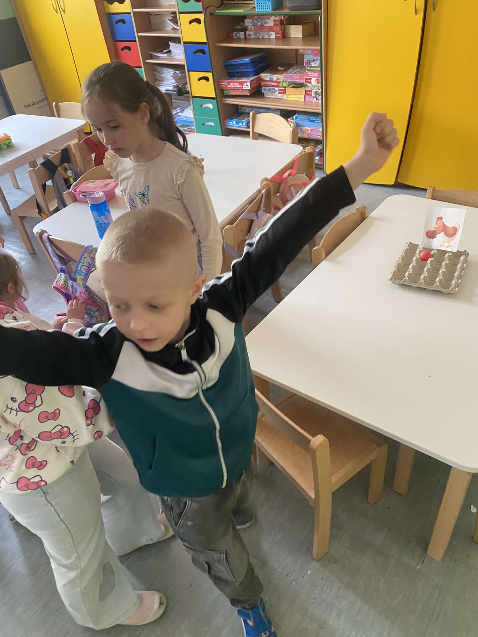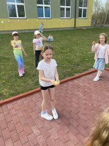 Z okazji zbliżających się Świąt Wielkanocnych w naszej zerówce zapanowała wyjątkowa, świąteczna atmosfera. Dzieci z radością tworzyły prace plastyczne: kolorowe pisanki oraz kurczaczki wykluwające się z jajek. Każda praca była wyjątkowa i odzwierciedlała dziecięcą wyobraźnię oraz wiosenny nastrój. Wspólnie założyliśmy także nasz mały ogródek, dzieci siały rzeżuchę, a następnie z dużym zaangażowaniem codziennie ją podlewały i obserwowały, jak rośnie. To była świetna lekcja cierpliwości i odpowiedzialności. Nie zabrakło również zabaw i aktywności ruchowych, zorganizowaliśmy wesołą konkurencję: która kura zbierze więcej jajek, co dostarczyło dzieciom mnóstwo śmiechu i pozytywnych emocji. W ramach nauki przez zabawę układaliśmy wyrazy z liter związanych ze zwyczajami wielkanocnymi, rozwijając przy tym umiejętności językowe i logiczne myślenie. Nie zapomnieliśmy również o tradycji wielkanocnego śmigusa-dyngusa, oczywiście w kontrolowanej, bezpiecznej wersji! Było trochę lania wodą, dużo śmiechu i jeszcze więcej radości. Na zakończenie wspólnymi siłami stworzyliśmy ogromną, kolorową pisankę, która stała się piękną dekoracją naszej sali i symbolem wspólnie spędzonego czasu. To były wyjątkowe chwile, pełne kreatywności, tradycji i dobrej zabawy!