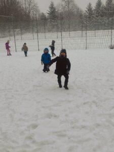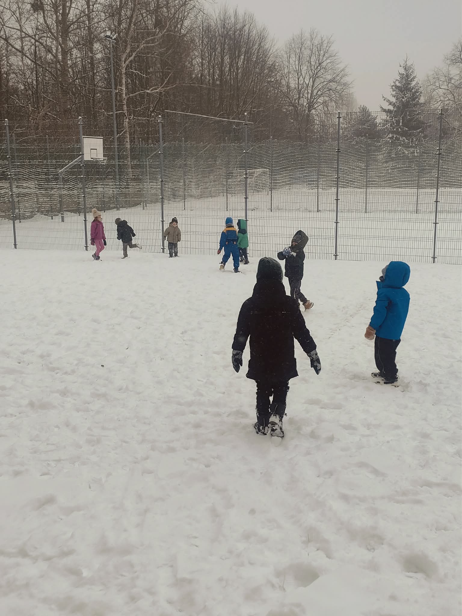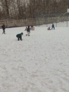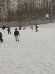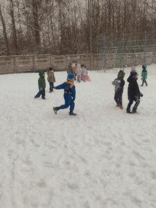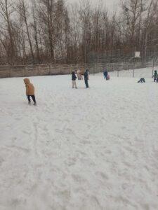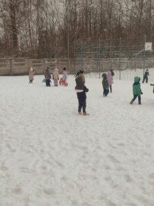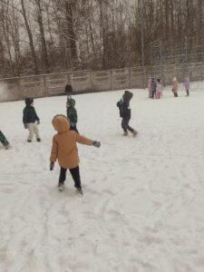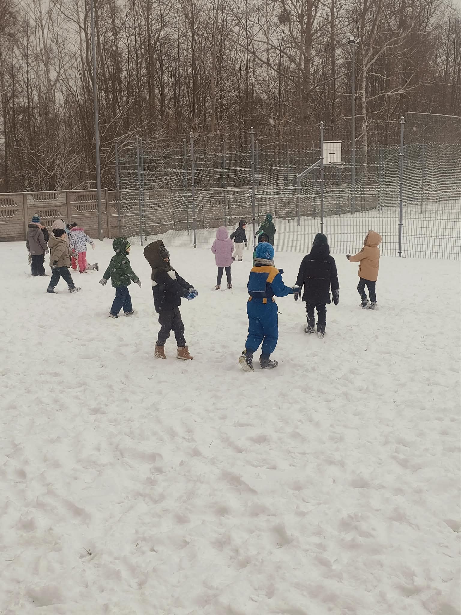 Najpierw pojawiły się śnieżki – małe, duże, krzywe, a czasem tak perfekcyjne, że aż szkoda było nimi rzucać. Ostatecznie jednak wszystkie wylądowały tam, gdzie powinny… czyli wszędzie. Śmiechu było tyle, że nawet śnieg wydawał się bardziej miękki.