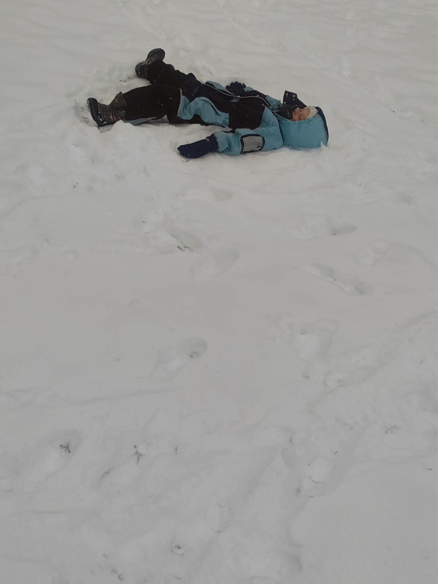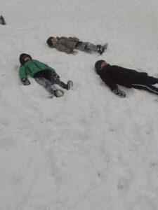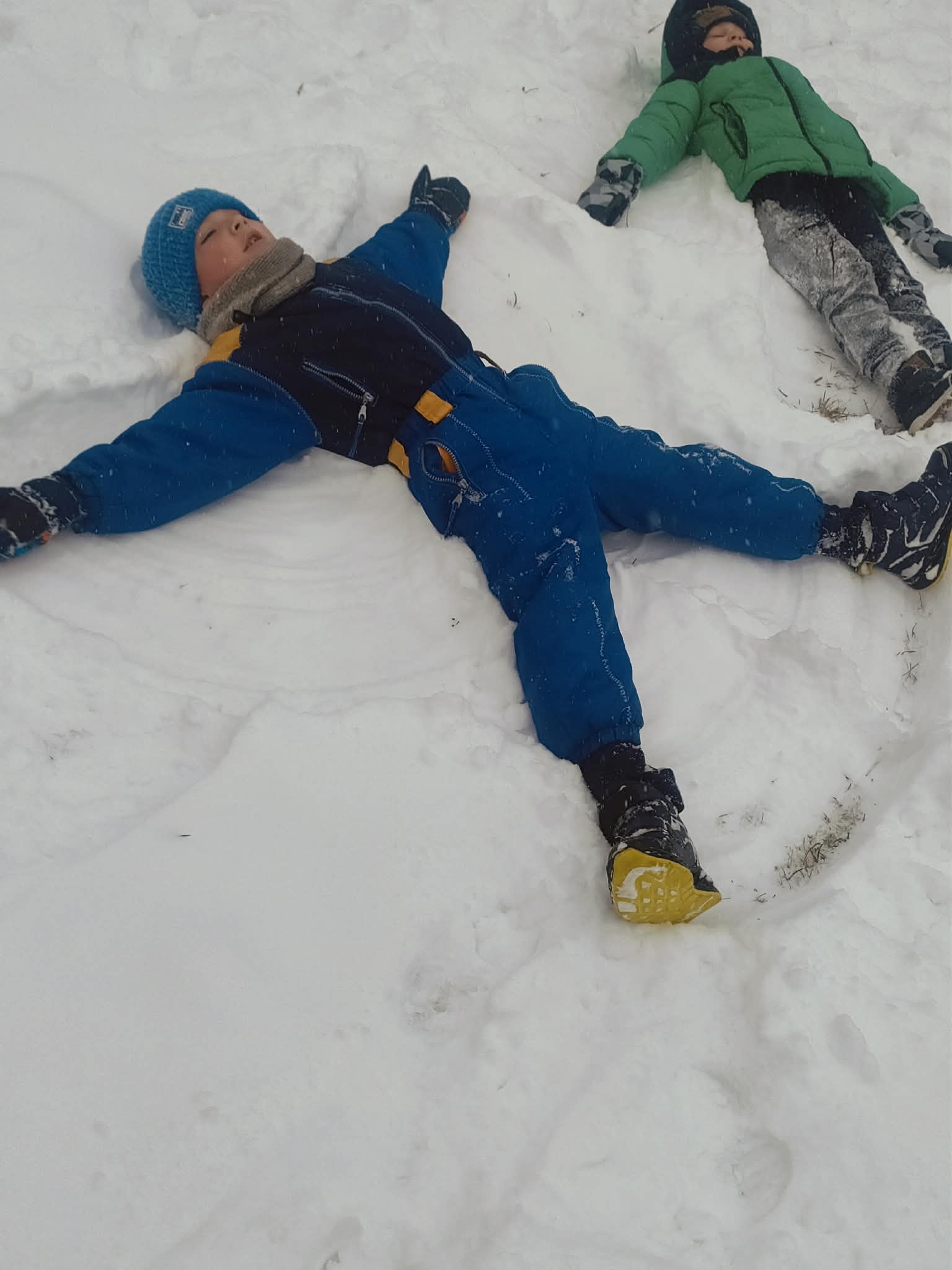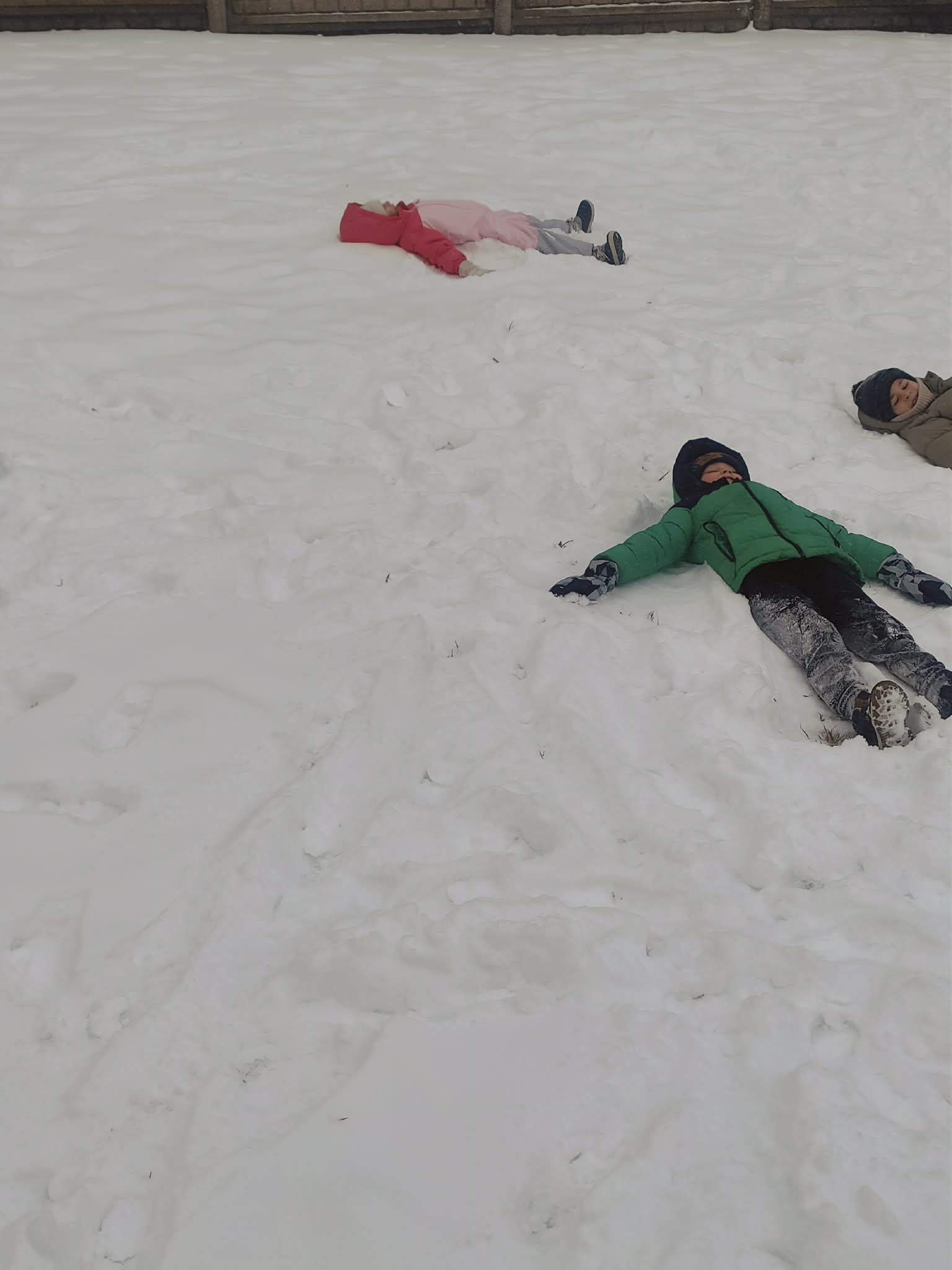 Potem dzieci odkryły, że śnieg to nie tylko amunicja, ale też świetne płótno. Na ziemi zaczęły pojawiać się śnieżne aniołki, każdy inny, każdy wyjątkowy. Niektóre wyglądały jak aniołki, inne jak aniołki po ciężkim dniu, ale wszystkie powstały z ogromną radością.