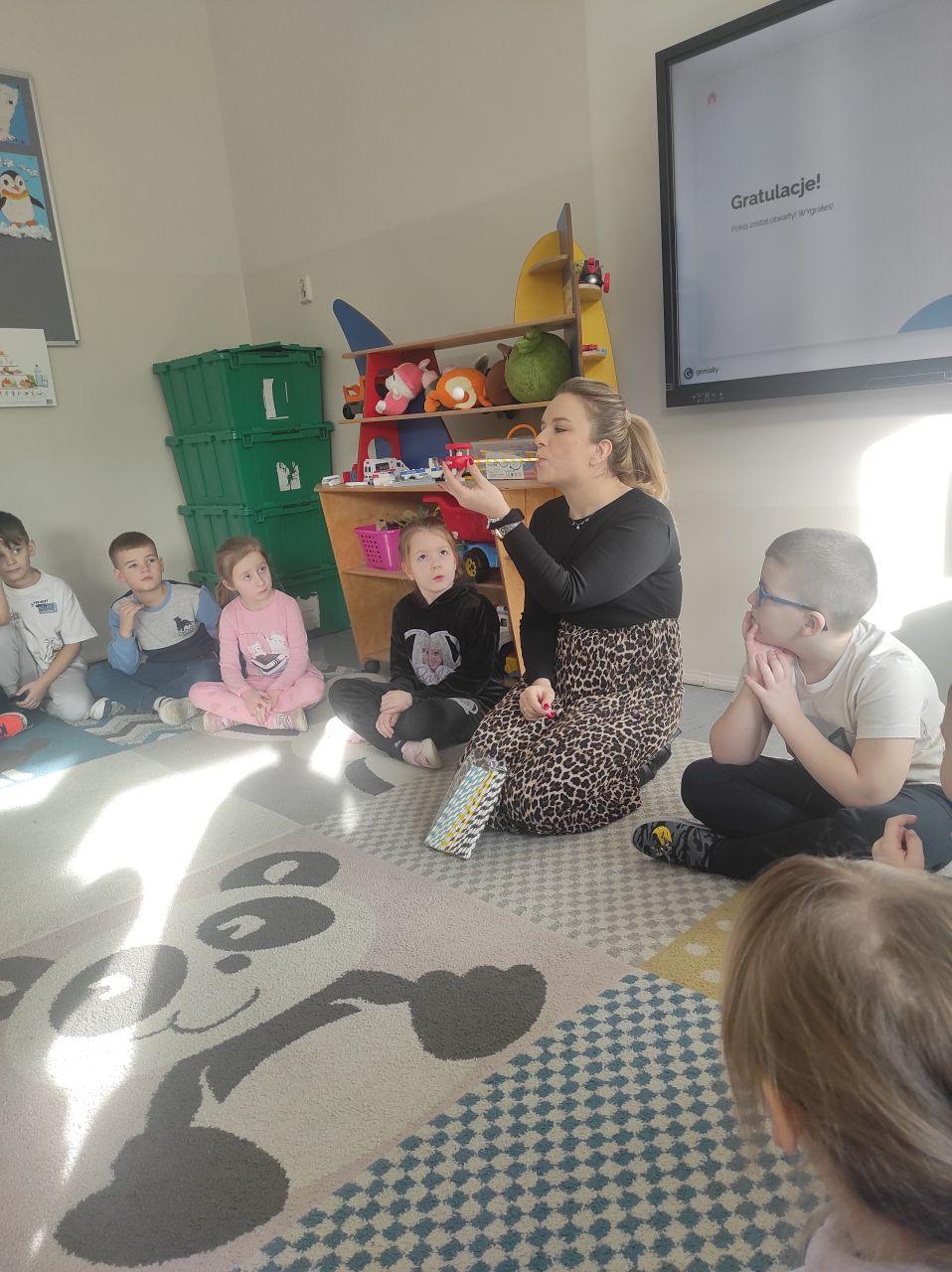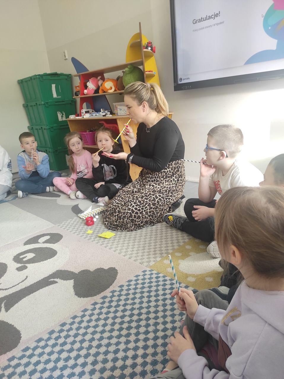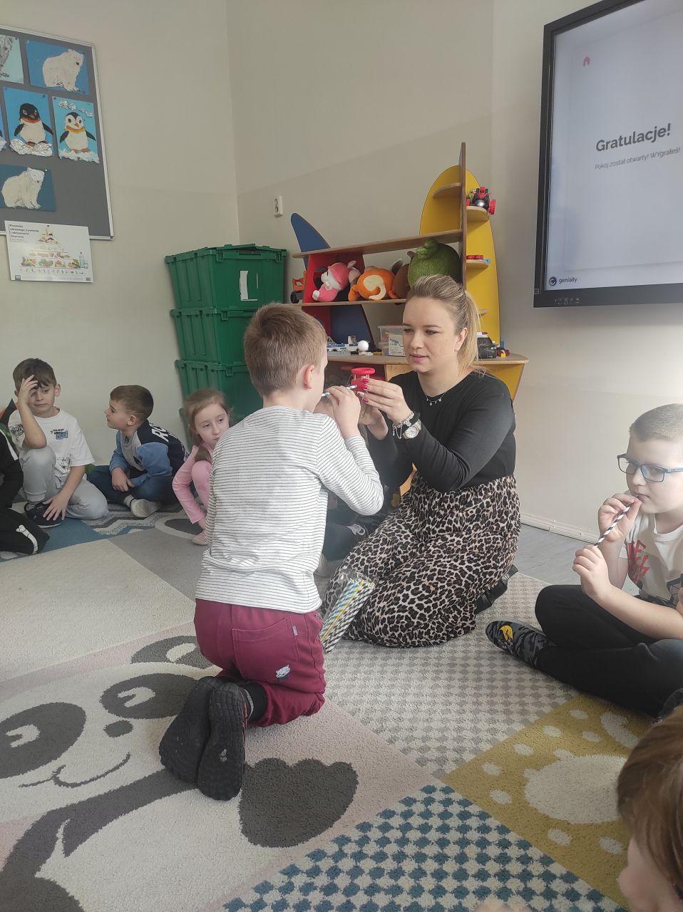 Dzieci wzięły udział w Logopedycznym Escape Roomie. Ich zadaniem było wydostać się z logopedycznego pokoju rozwiązując różne zadania językowe, ćwicząc buzię i język oraz wykonując magiczne ćwiczenia oddechowe z użyciem słomki. Wszyscy poradzili sobie znakomicie!”