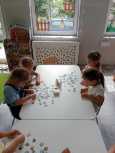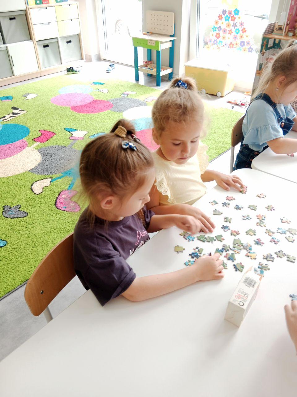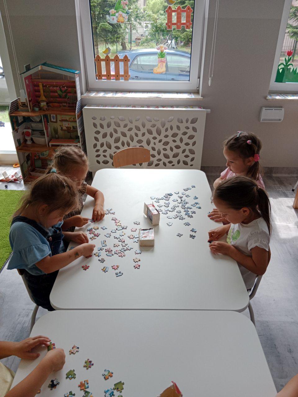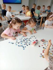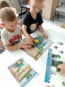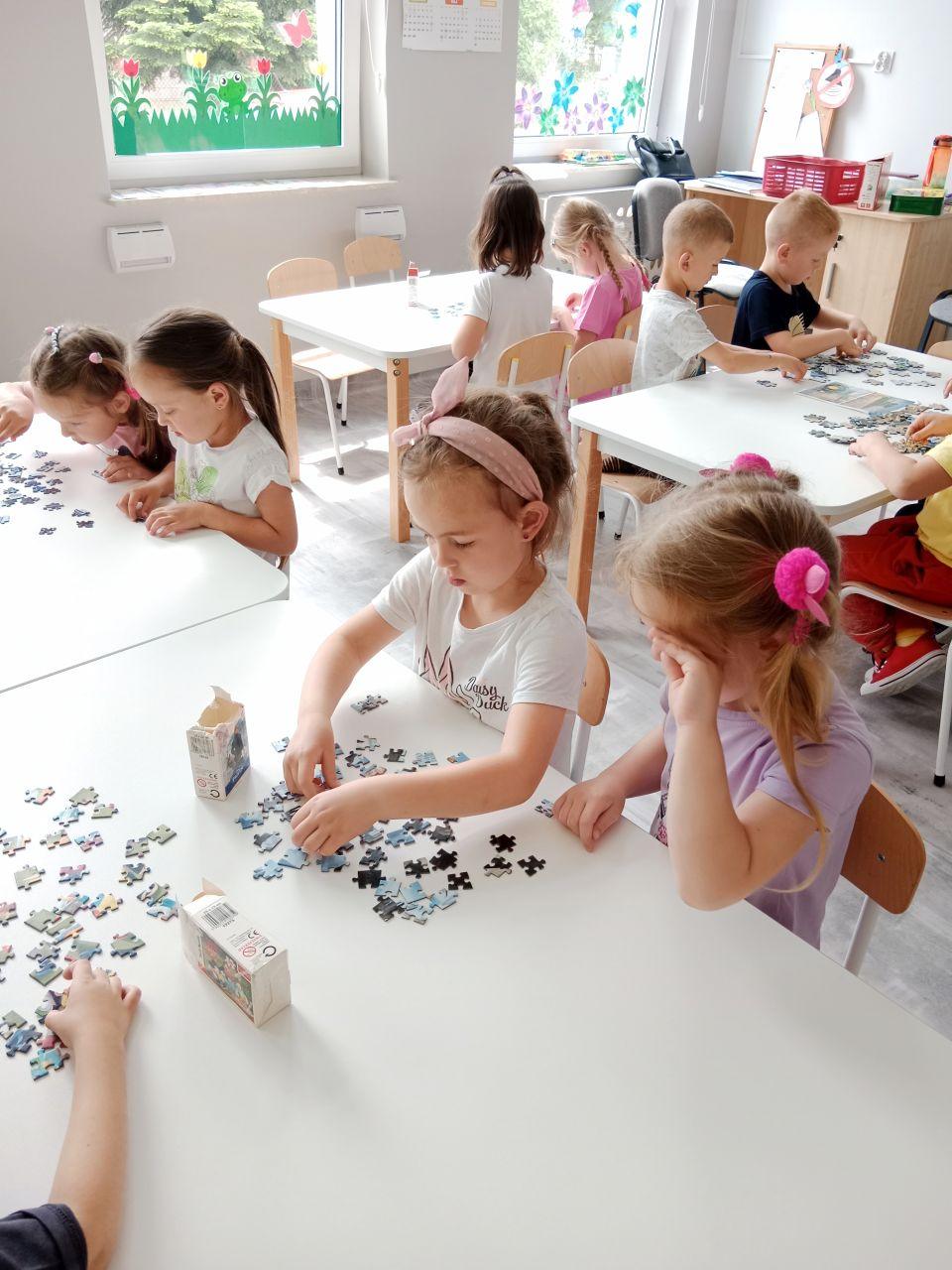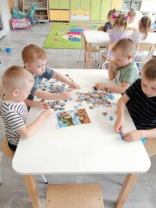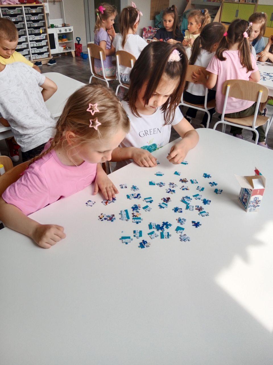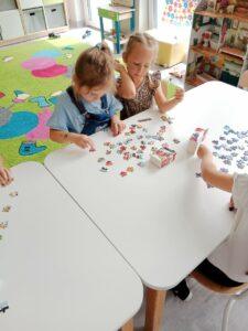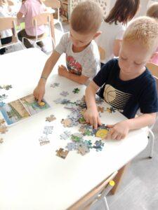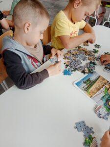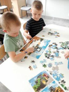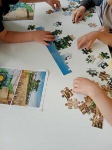 z zapałem układał fragmenty obrazka, wymieniając się spostrzeżeniami