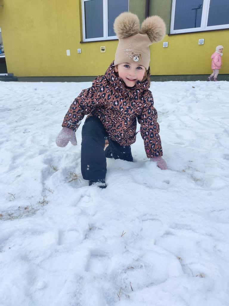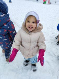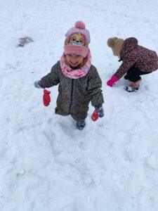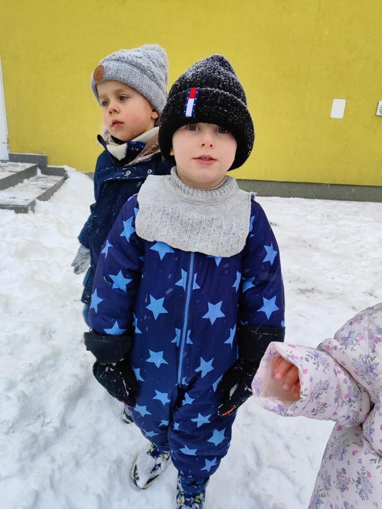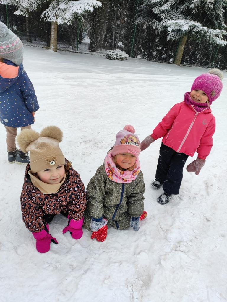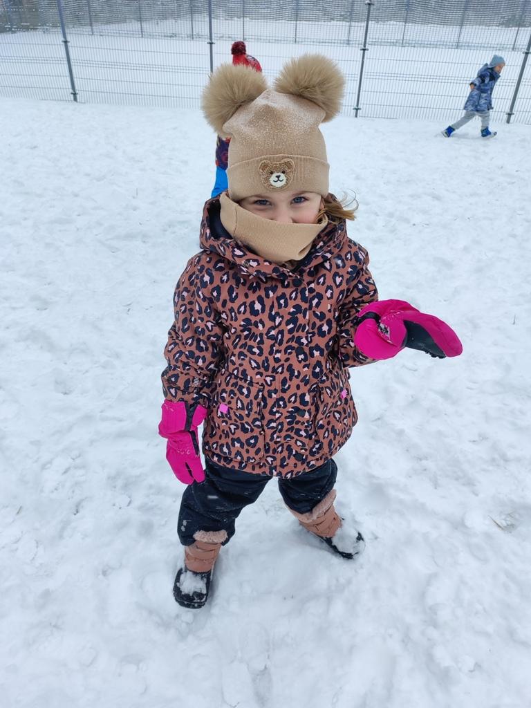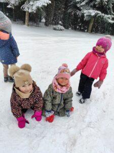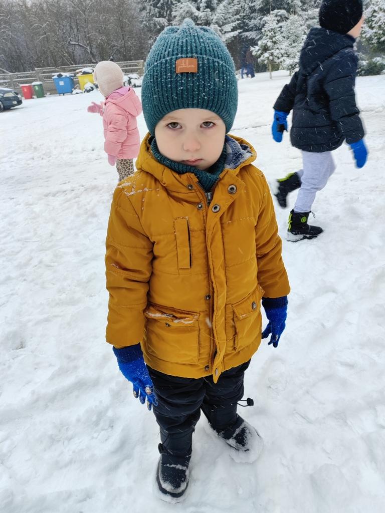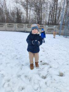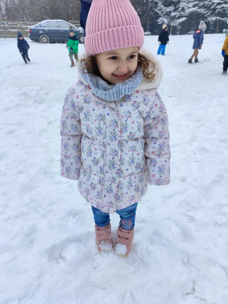 Dzieci z zaangażowaniem uczestniczyły w zimowych aktywnościach – biegały, bawiły się na śniegu, odkrywały zimową przyrodę i cieszyły się każdą chwilą spędzoną poza salą. Nie brakowało śmiechu, uśmiechów oraz spontanicznej radości, które najlepiej świadczą o tym, jak ważny jest codzienny kontakt z naturą i możliwość swobodnej zabawy.