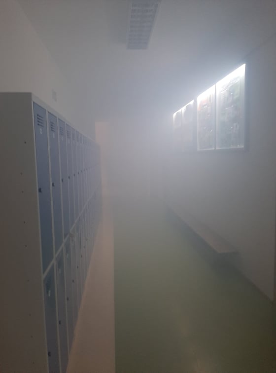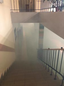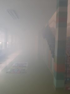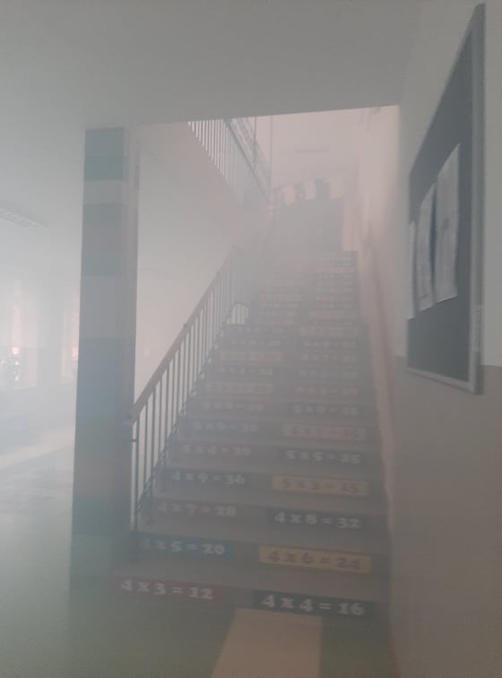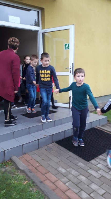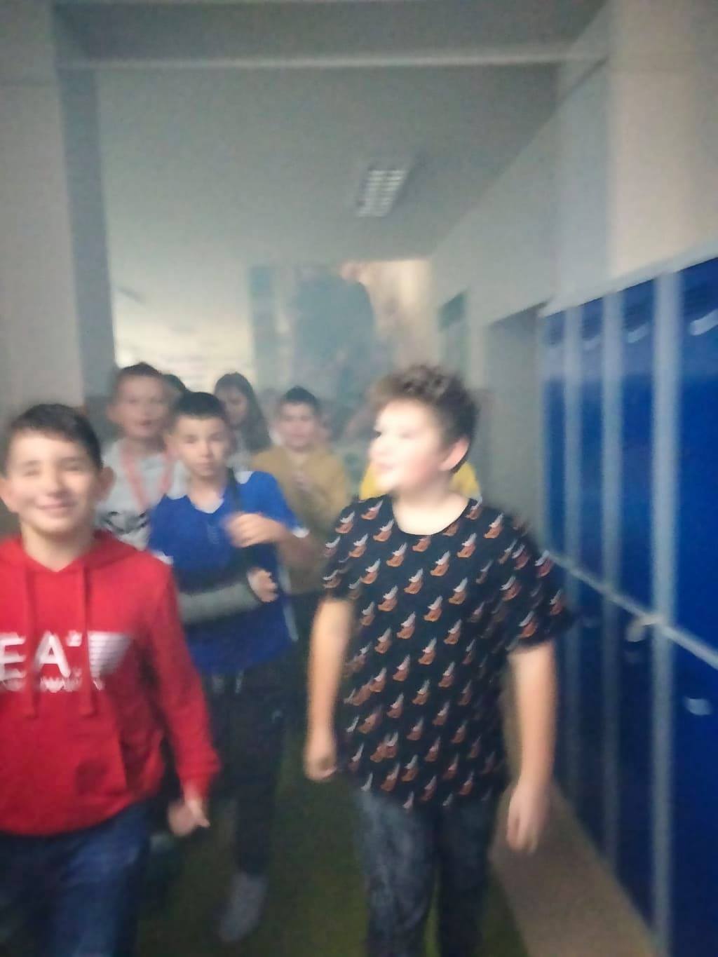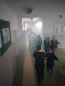 Sztuczny dym, alarm oraz próbna ewakuacja uczniów, nauczycieli i pracowników- to wszystko działo się 30 września 2021 r. o godz. 11.30 w gmachu PSP im. Marii Konopnickiej w Mazowszanach.