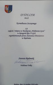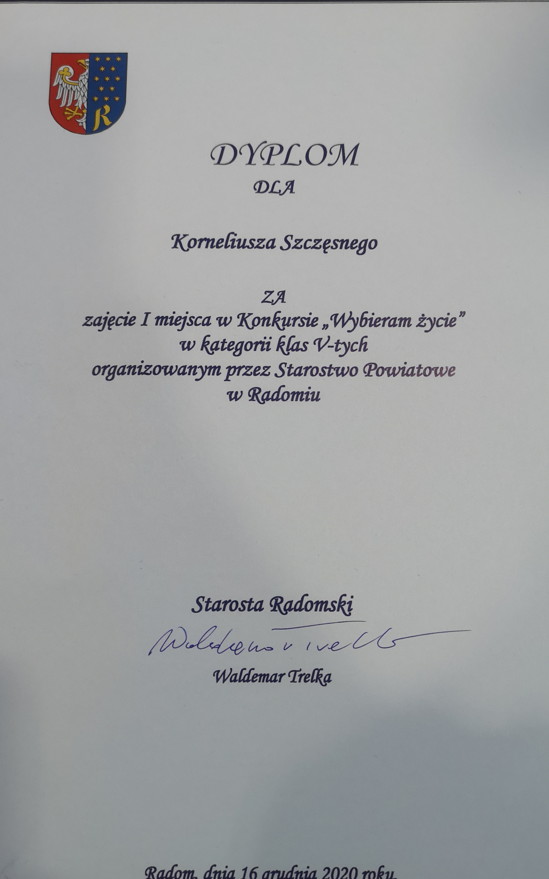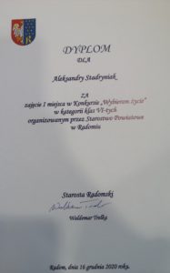Zmagania naszych uczniów zaowocowały wielkim sukcesem! Korneliusz Szczęsny oraz Aleksandra Standryniak zostali laureatami konkursu. W swoich kategoriach wiekowych zdobyli największą ilość punków, tym samym zajmując I miejsce. Wręczenie nagród nastąpiło 16 grudnia 2020r. w siedzibie Starostwa Powiatowego w Radomiu.