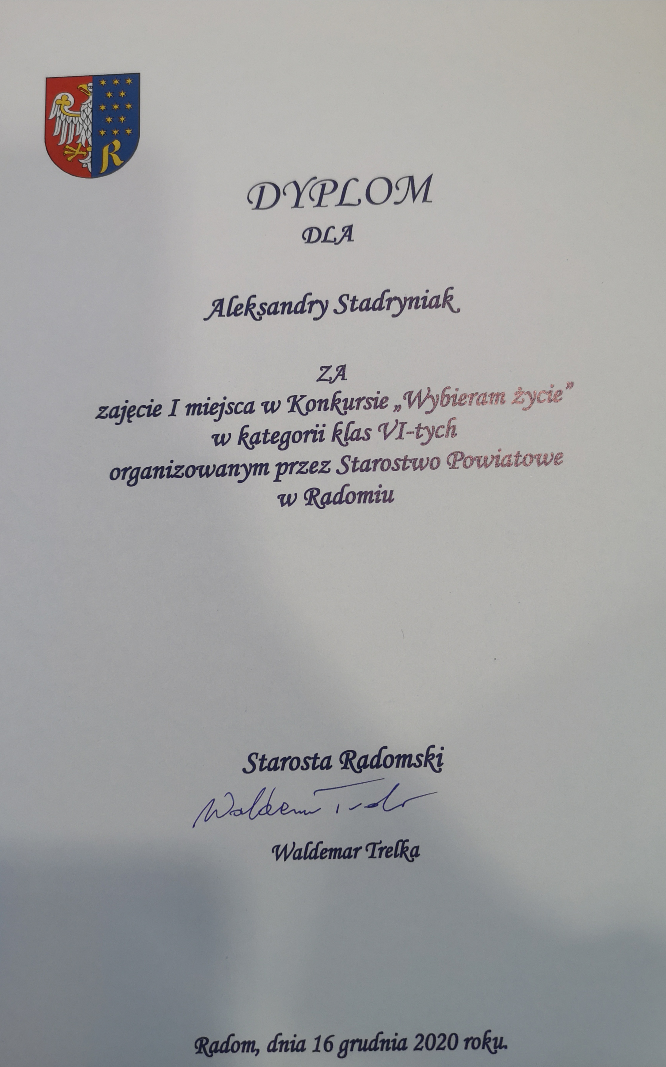 13 listopada 2020 r. nasi uczniowie w składzie: Martyna J., Aleksandra S. oraz Korneliusz Sz. reprezentowali naszą szkołę w finale powiatowego konkursu profilaktycznego „Wybieram życie” organizowanego przez Starostwo Powiatowe w Radomiu. Ze względu na sytuację epidemiologiczną tegoroczny finał konkursu odbył się na terenie naszej szkoły, pod nadzorem pani Małgorzaty Maj z Wydziału Zdrowia i Spraw Społecznych Starostwa Powiatowego w Radomiu.