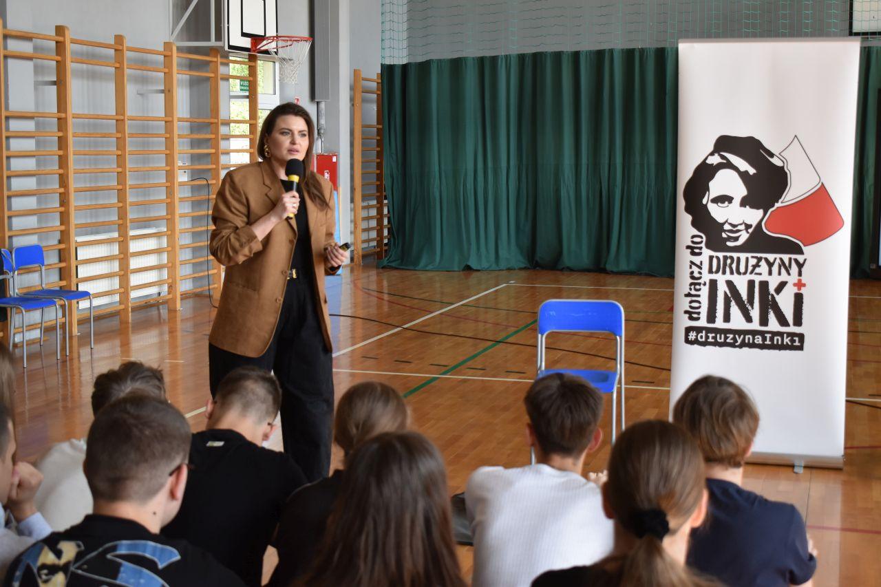 Spotkanie poprowadziła Pani Kinga Smoleń, edukatorka współpracująca z IPN, która w barwny i angażujący sposób przybliżyła młodzieży losy „Inki”. W pierwszej części zajęć uczniowie poznali historię Danuty Siedzikówny – sanitariuszki 5. Wileńskiej Brygady Armii Krajowej oraz jej rodziny.