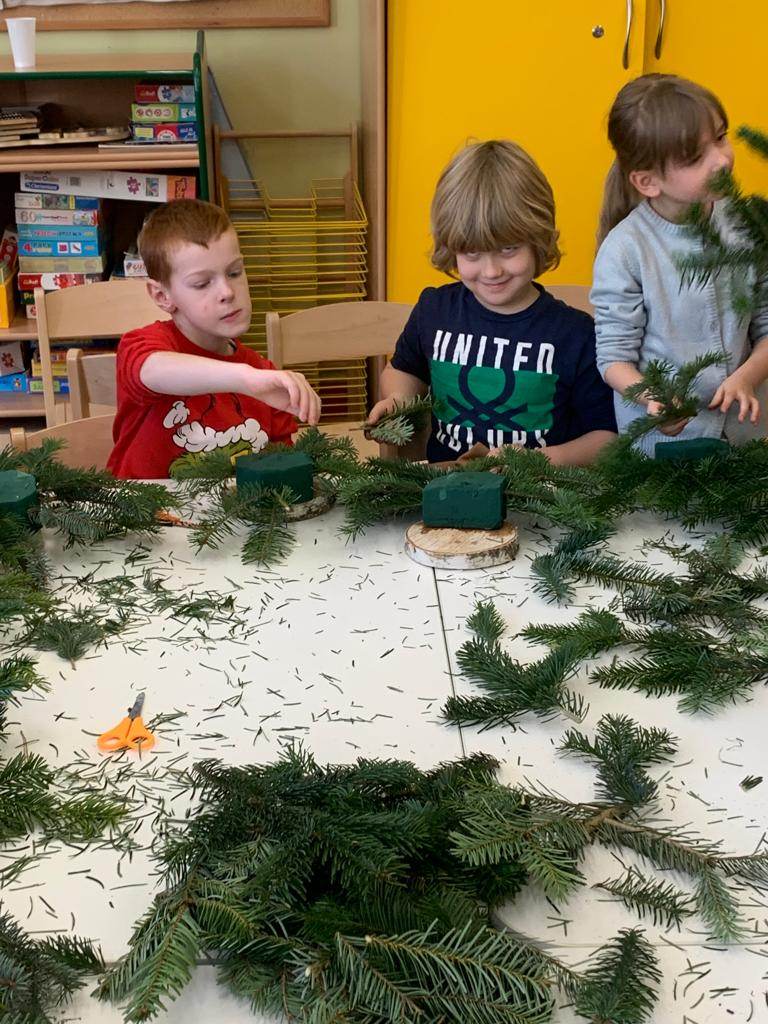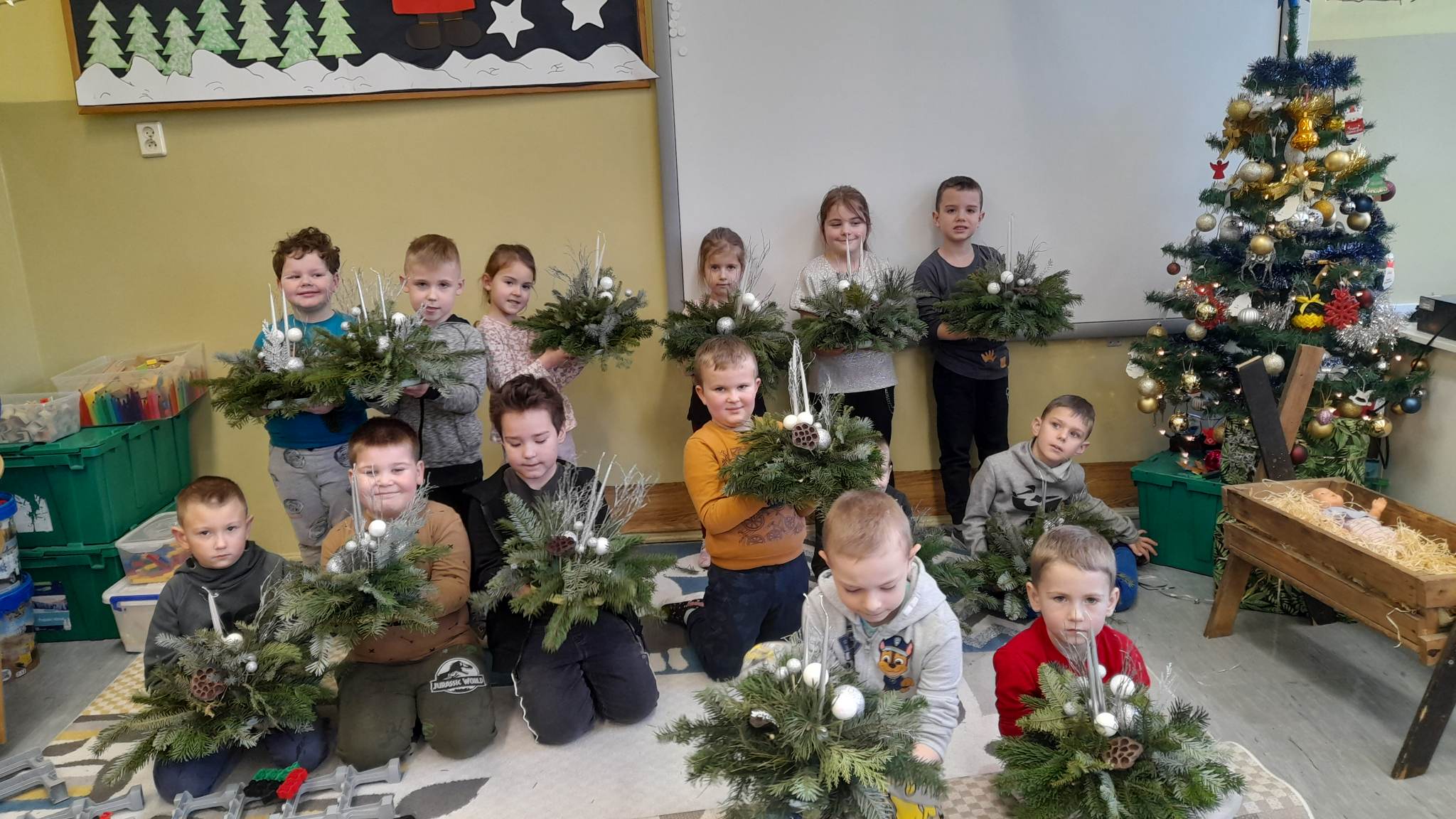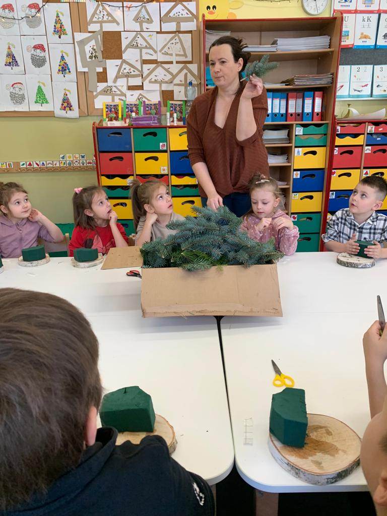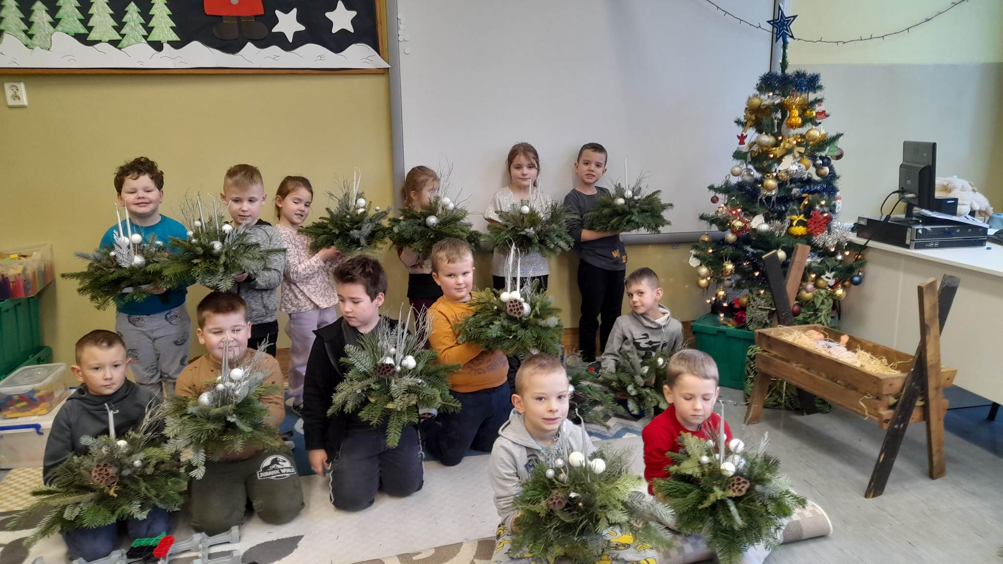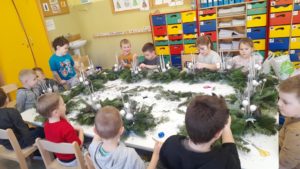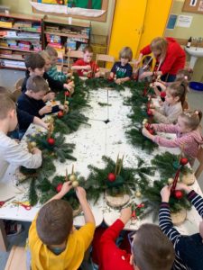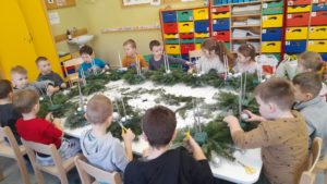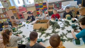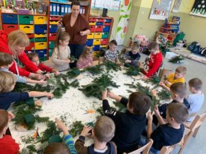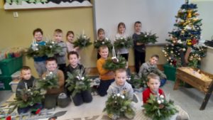 Stroik świąteczny to najbardziej popularna ozdoba bożonarodzeniowa. Podstawą tradycyjnego stroika świątecznego są gałązki igliwia (świerka, jodły, sosny). Do stroików można dodać szyszki, wstążki, ozdoby choinkowe, szczególnie bombki. W tym roku przedszkolaki z naszej szkoły mogły wykazać się swoją kreatywnością podczas samodzielnego wykonywania stroików świątecznych. Warsztaty przygotowane zostały przez jednego z rodziców – panią Katarzynę Pszczółkę, której składamy serdeczne podziękowania.