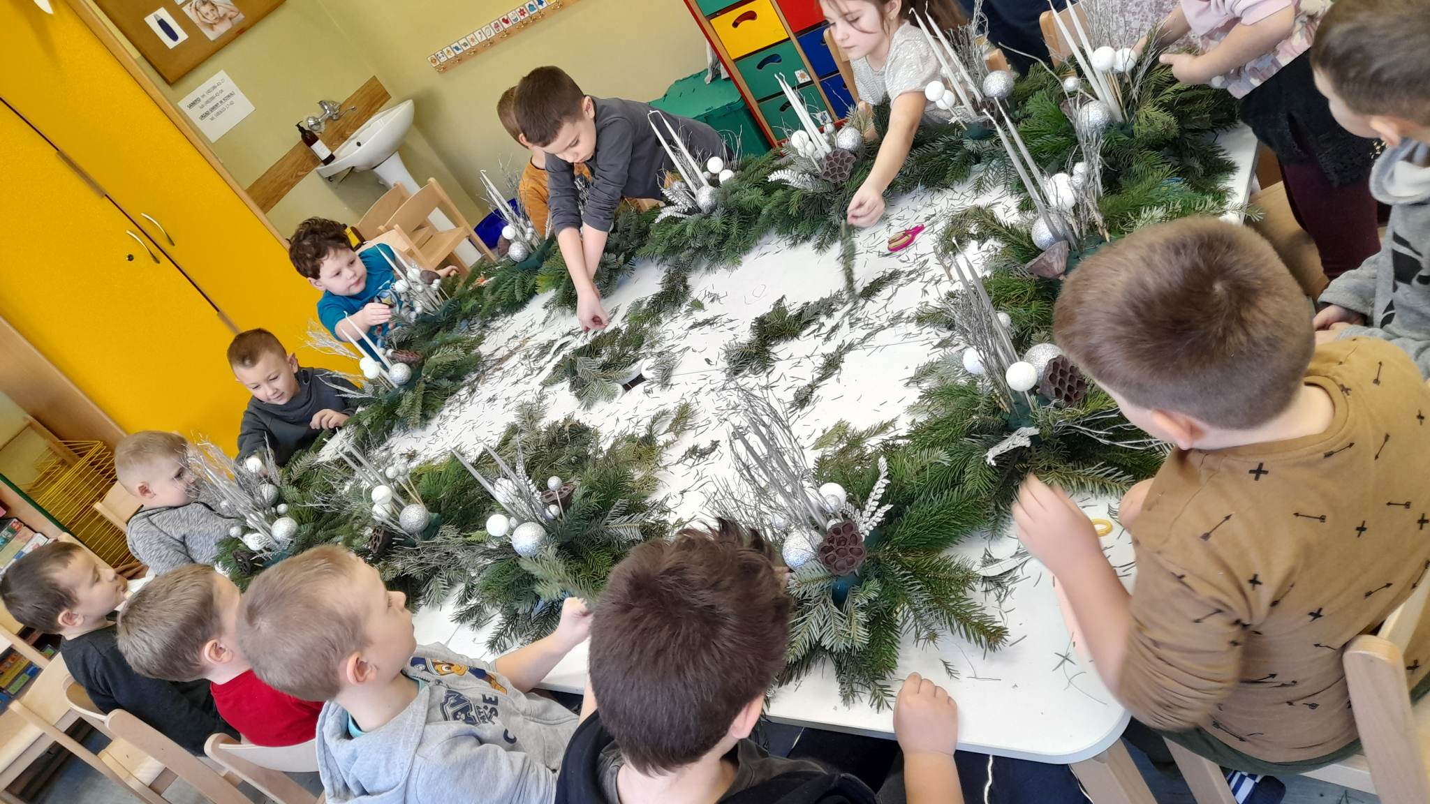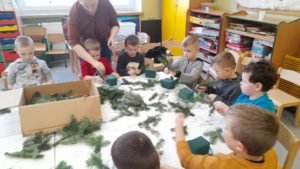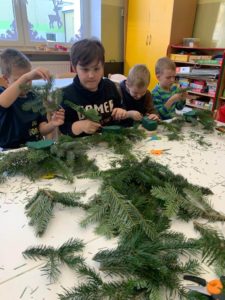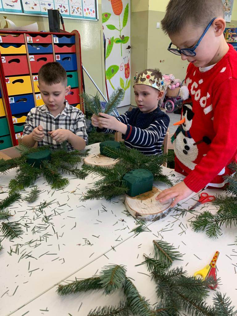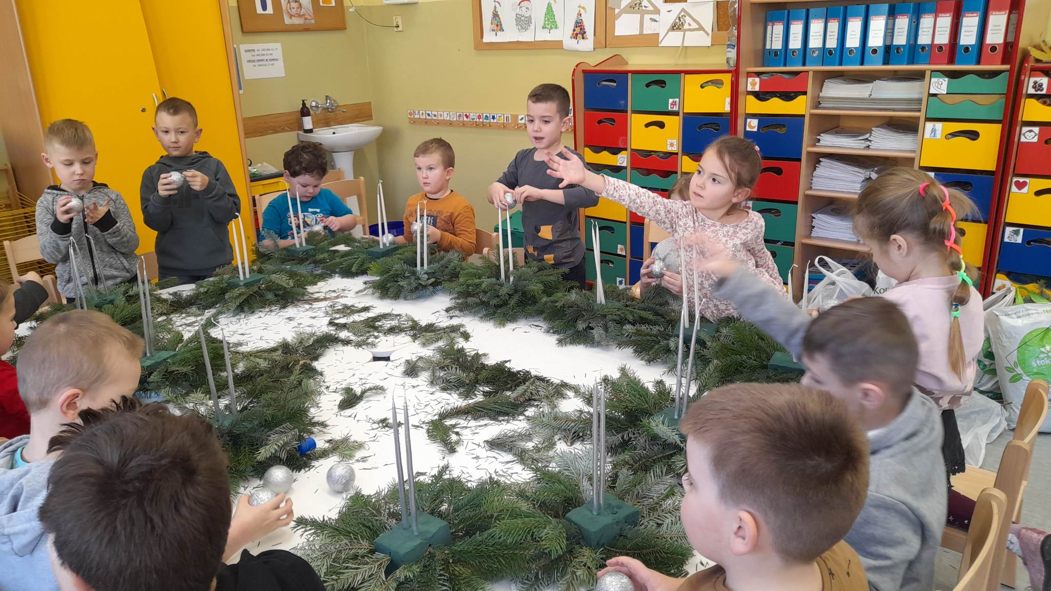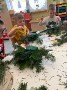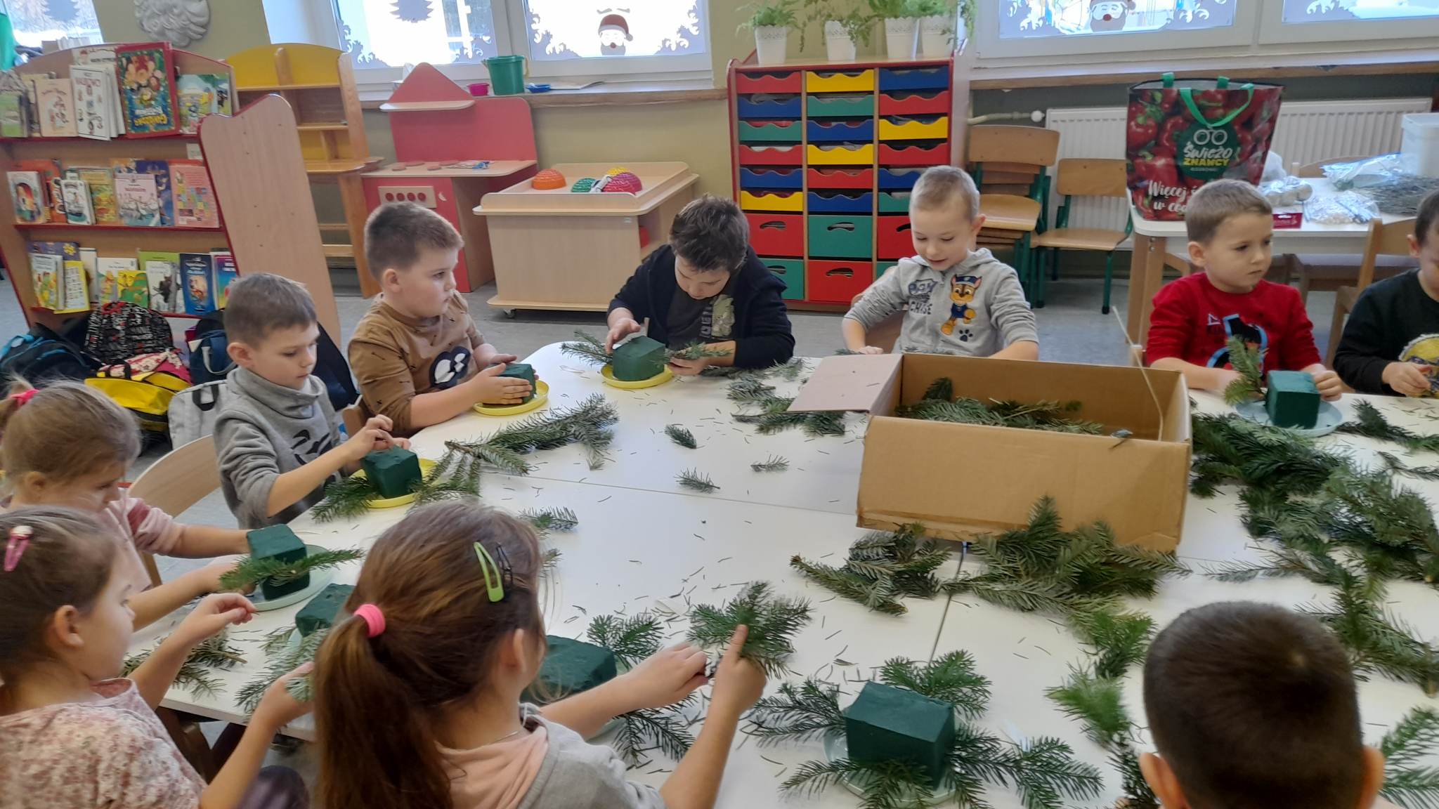 Stroik świąteczny to najbardziej popularna ozdoba bożonarodzeniowa. Podstawą tradycyjnego stroika świątecznego są gałązki igliwia (świerka, jodły, sosny). Do stroików można dodać szyszki, wstążki, ozdoby choinkowe, szczególnie bombki. W tym roku przedszkolaki z naszej szkoły mogły wykazać się swoją kreatywnością podczas samodzielnego wykonywania stroików świątecznych. Warsztaty przygotowane zostały przez jednego z rodziców – panią Katarzynę Pszczółkę, której składamy serdeczne podziękowania.