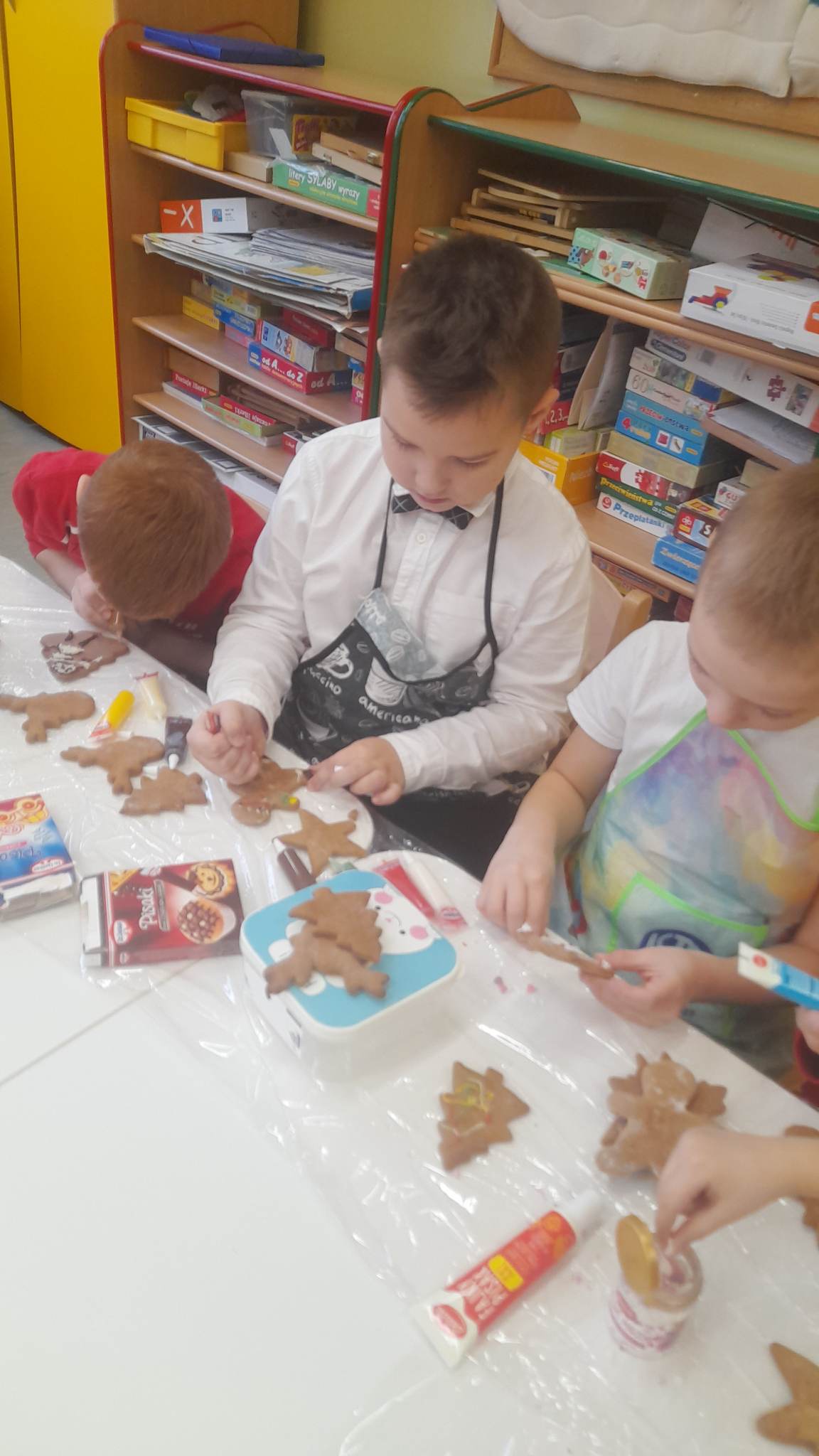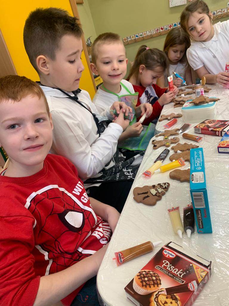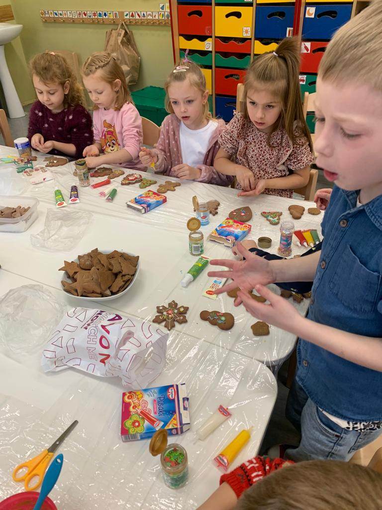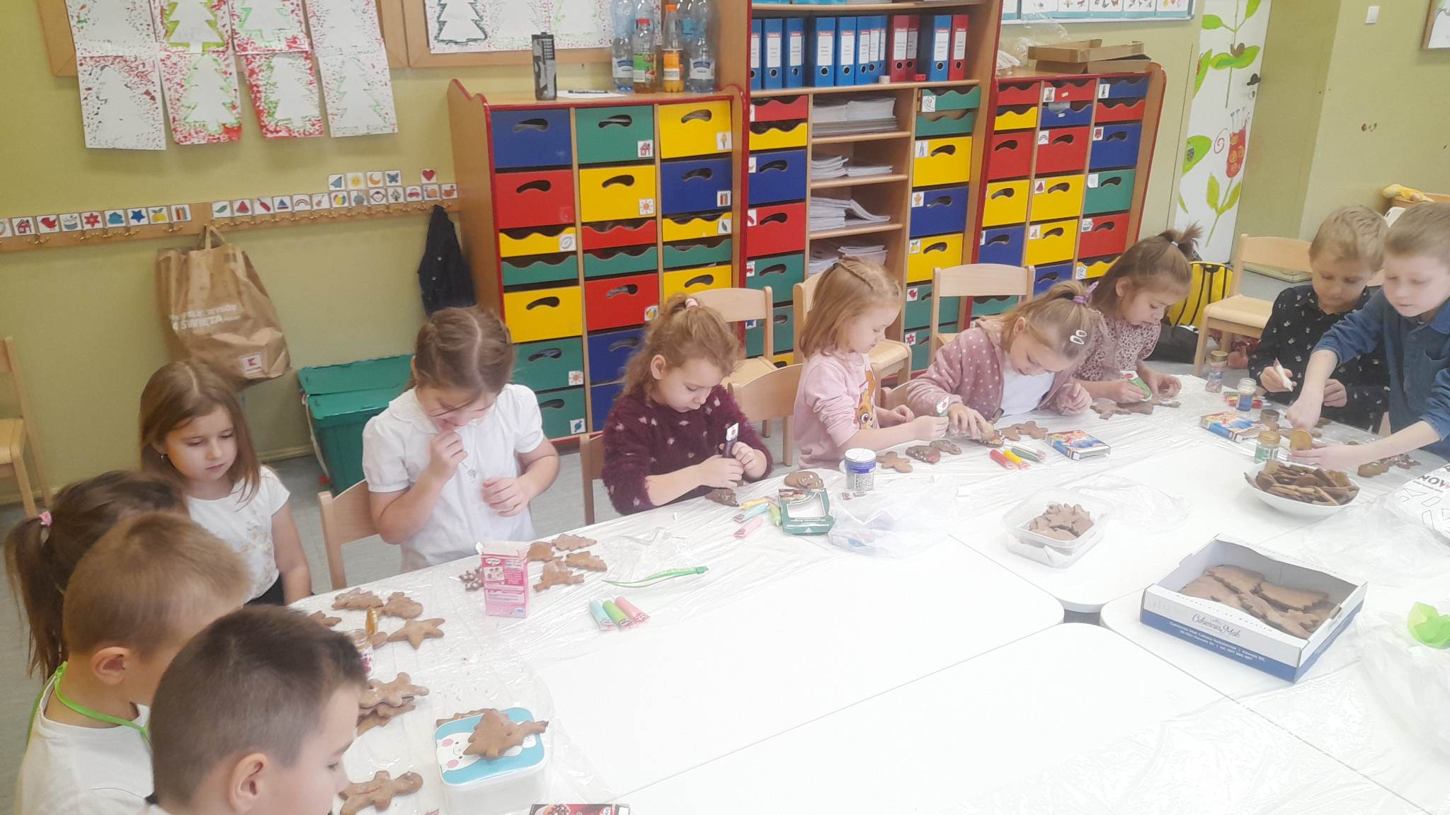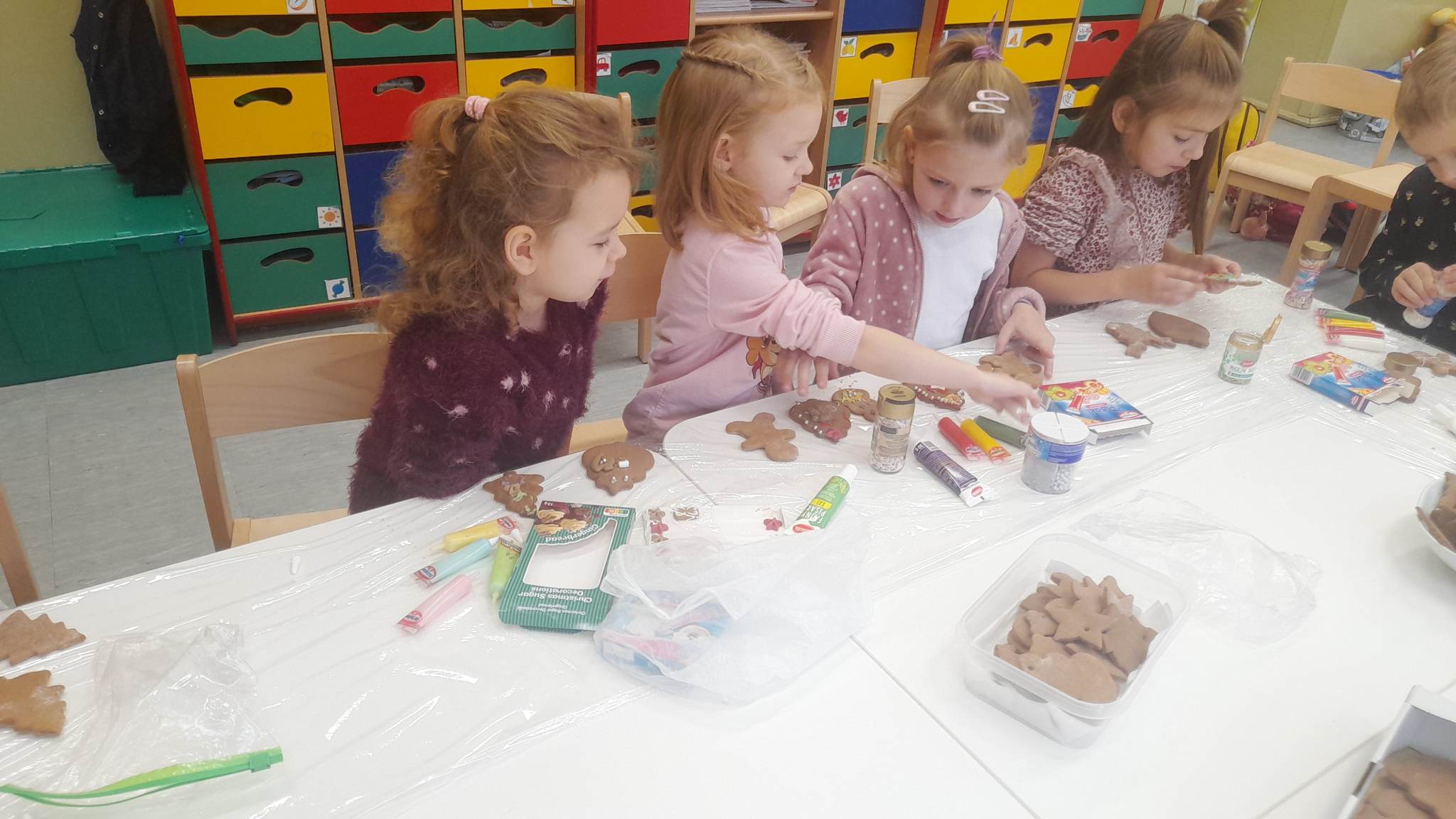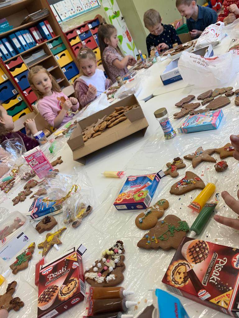 Dekorowanie pierniczków lukrowymi pisakami i kolorową posypką to też okazja do spotkania w miłej przedświątecznej atmosferze. Poprzez wspólne działania, samodzielne dekorowanie pierniczków dzieci mogły osobiście doświadczyć świątecznych przygotowań, kultywowały tradycję, pobudzały inwencję twórczą oraz odczuwały radość świątecznego oczekiwania.