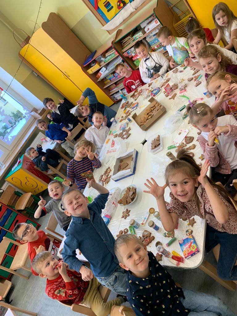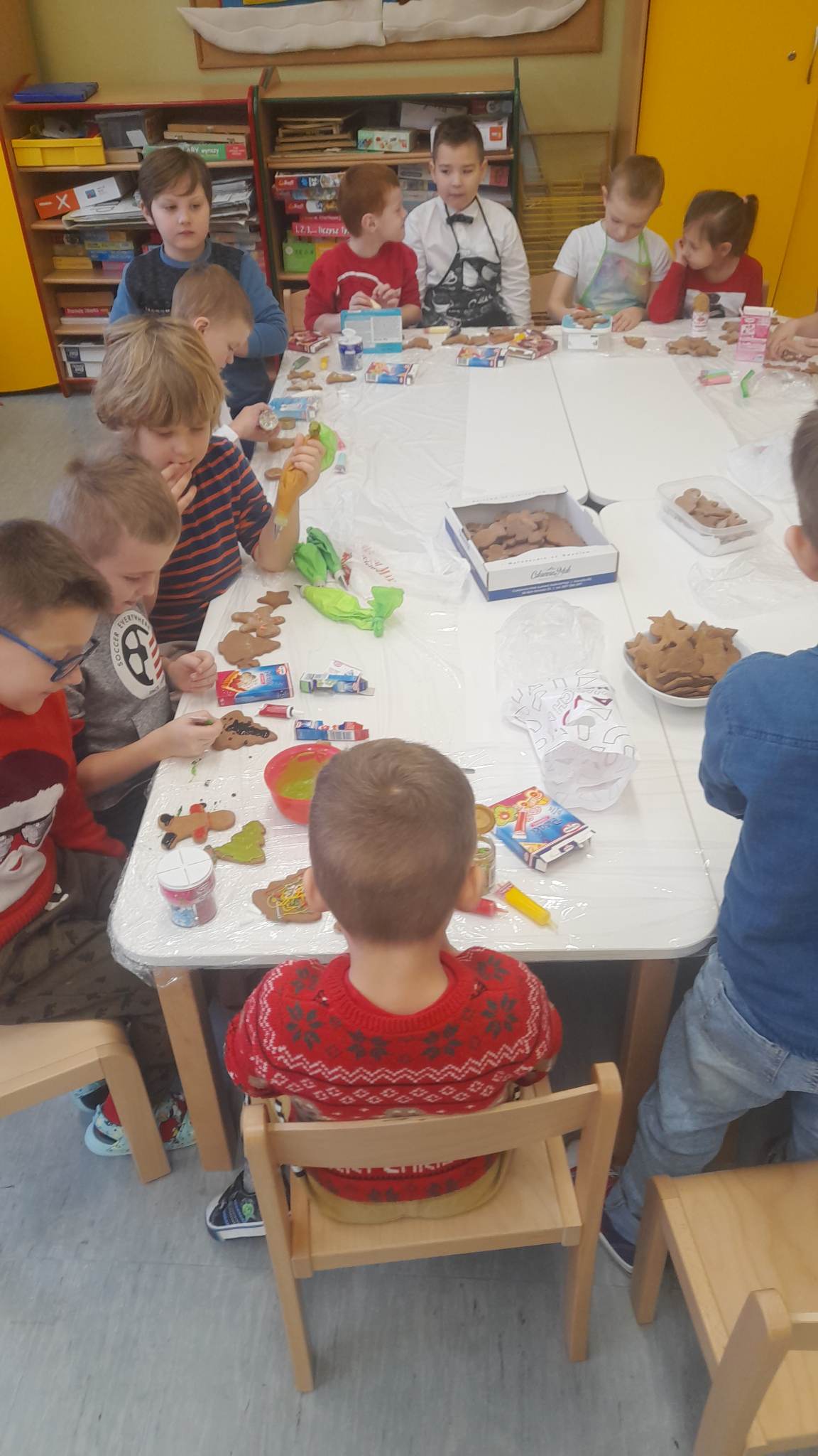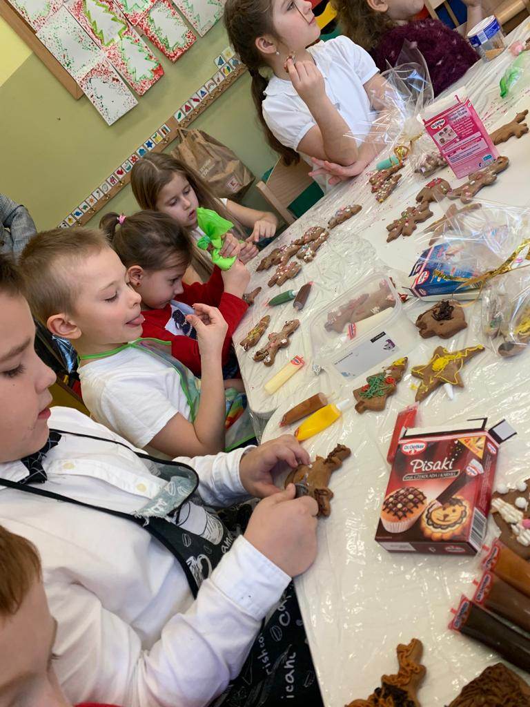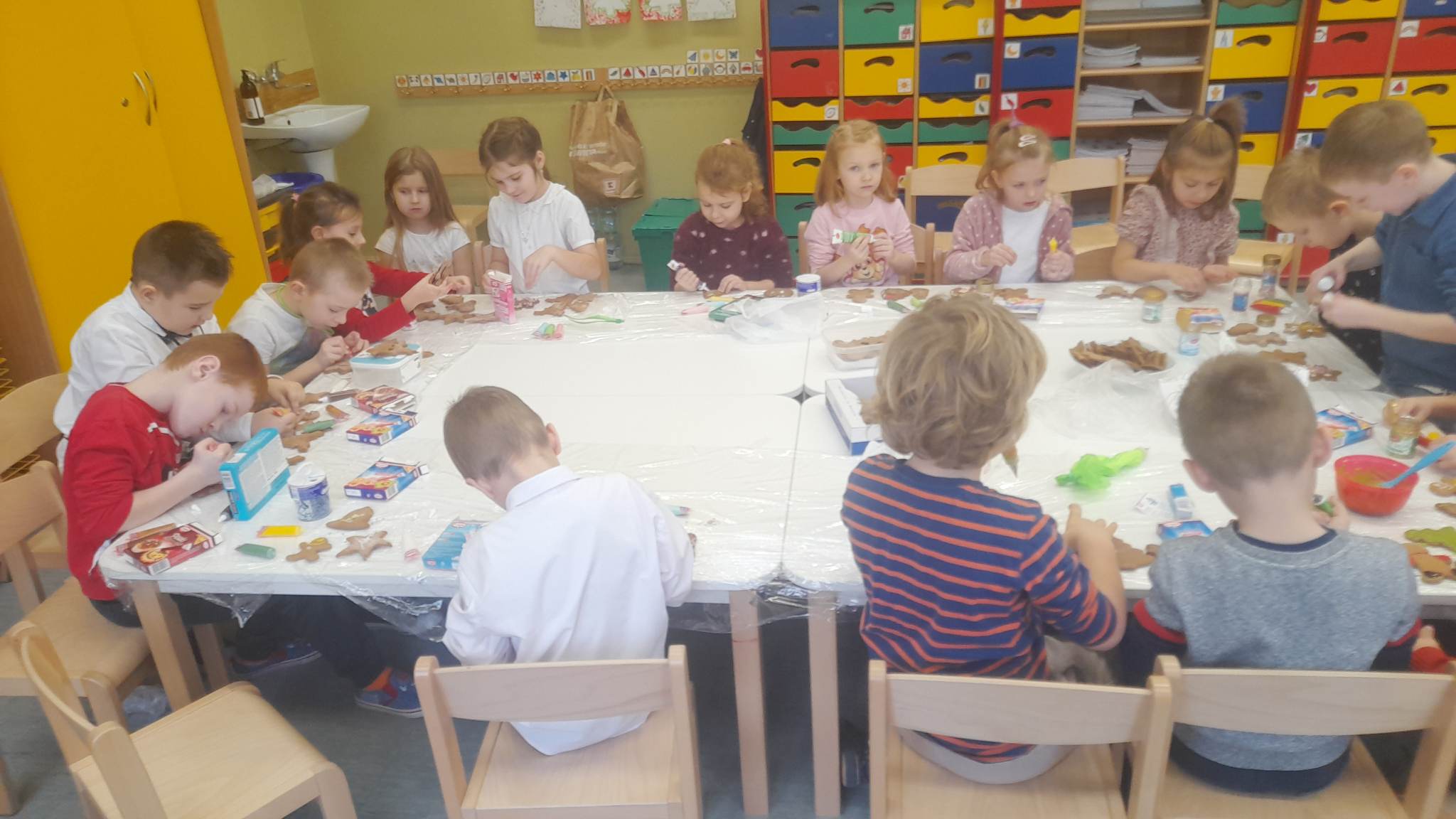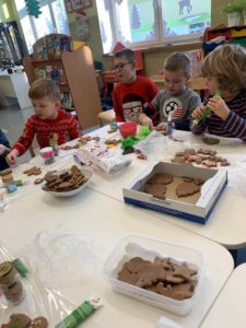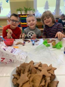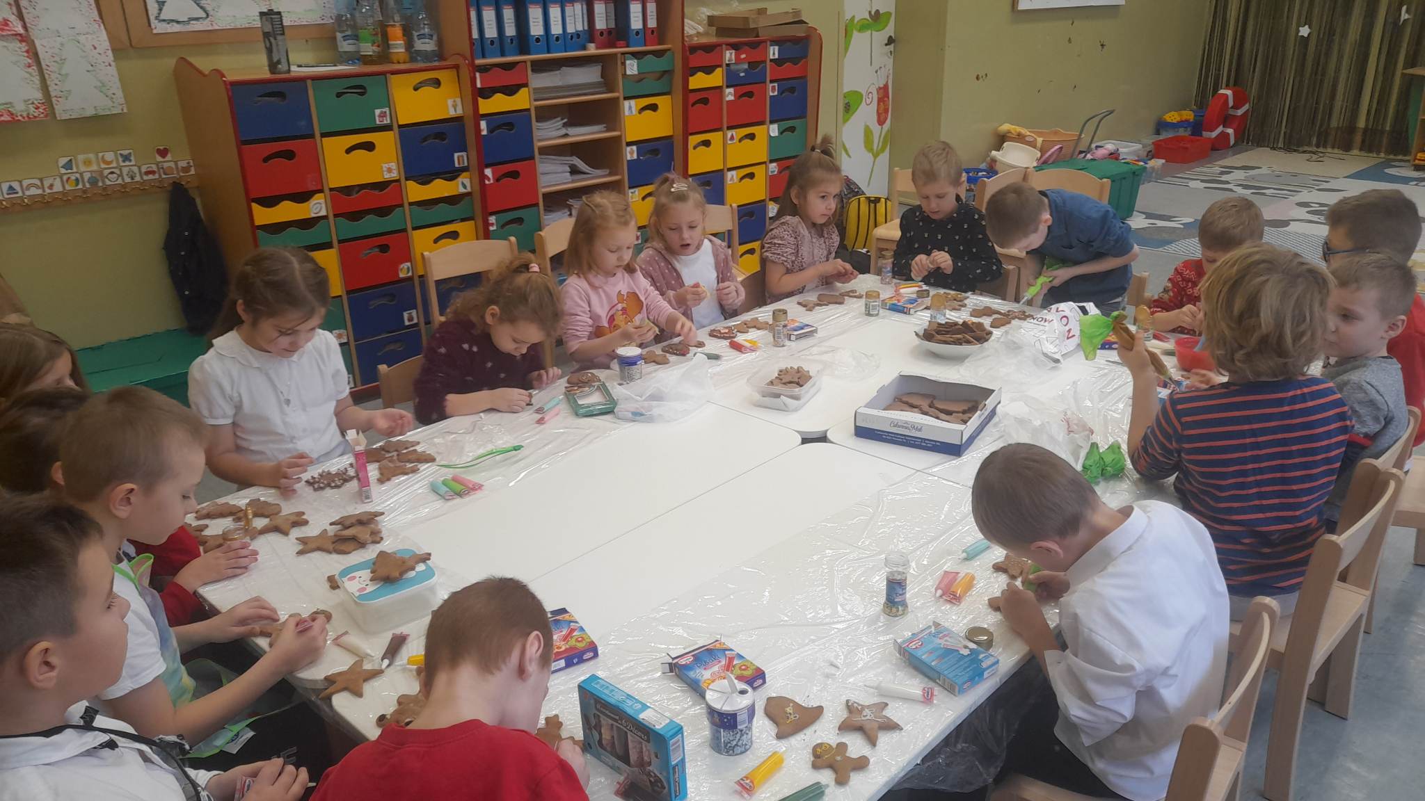 Dekorowanie pierniczków lukrowymi pisakami i kolorową posypką to też okazja do spotkania w miłej przedświątecznej atmosferze. Poprzez wspólne działania, samodzielne dekorowanie pierniczków dzieci mogły osobiście doświadczyć świątecznych przygotowań, kultywowały tradycję, pobudzały inwencję twórczą oraz odczuwały radość świątecznego oczekiwania.