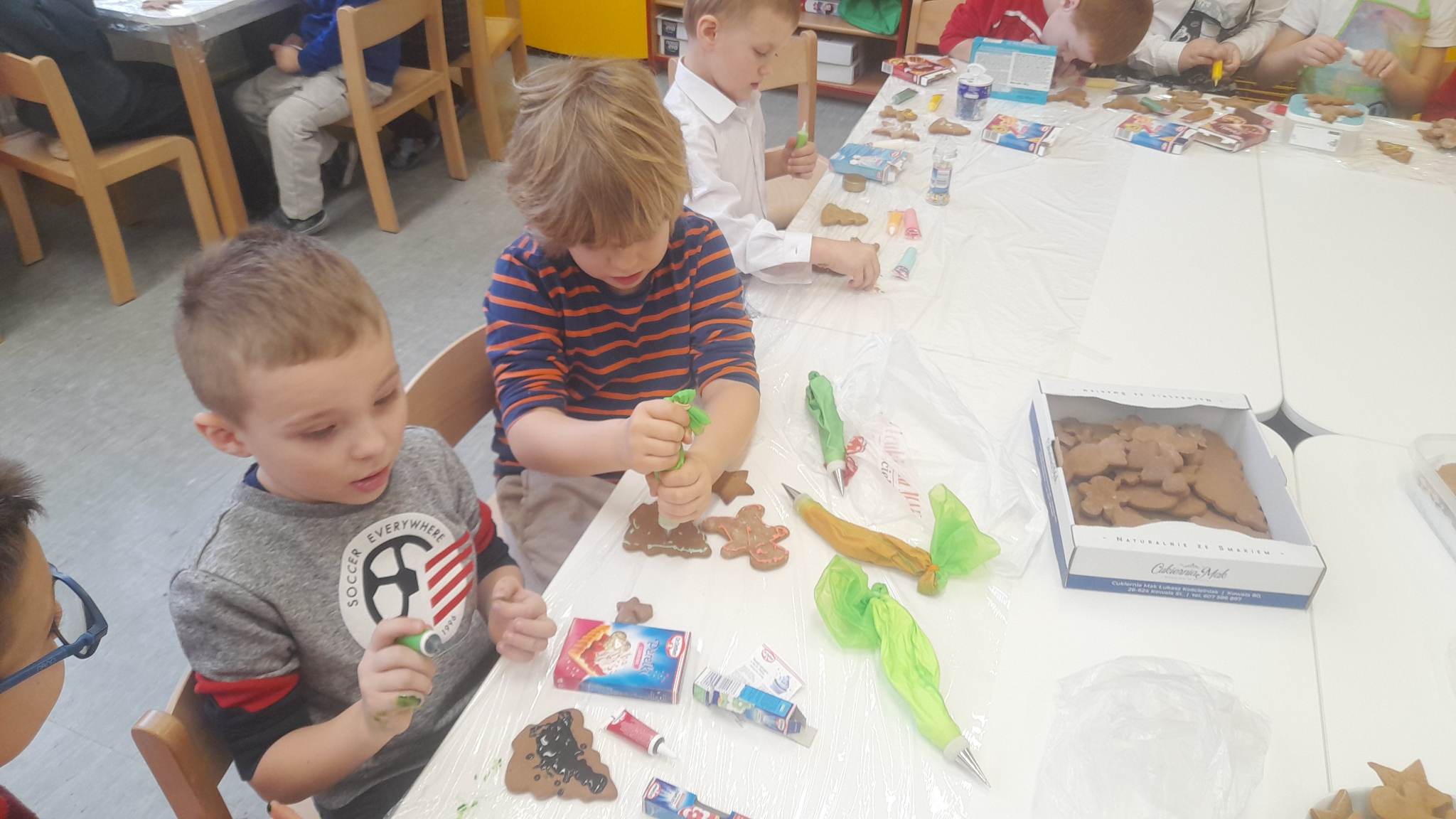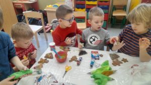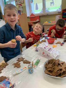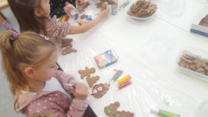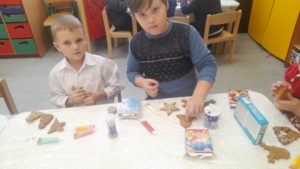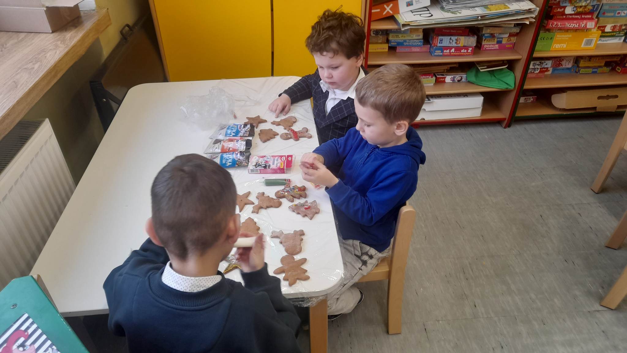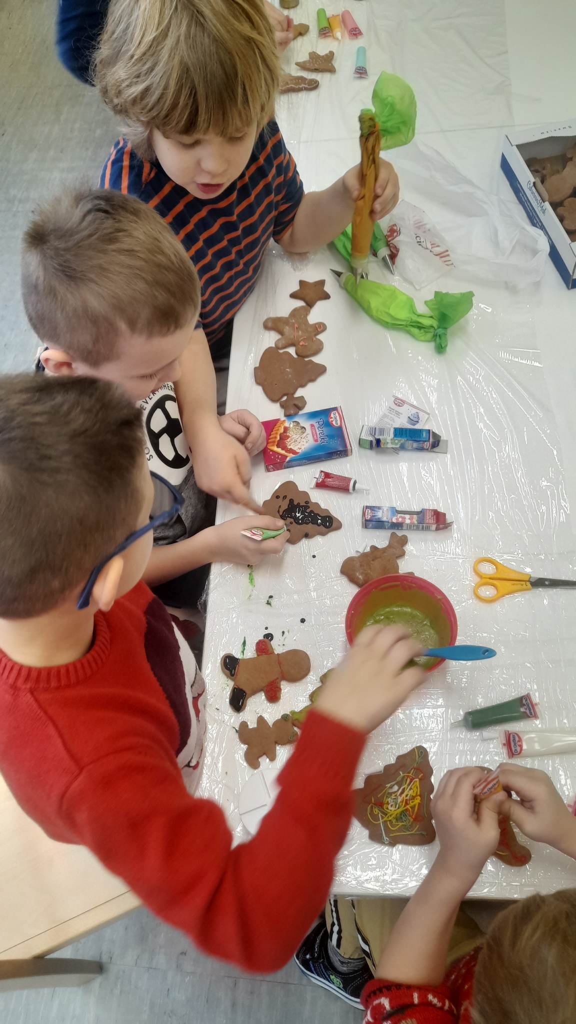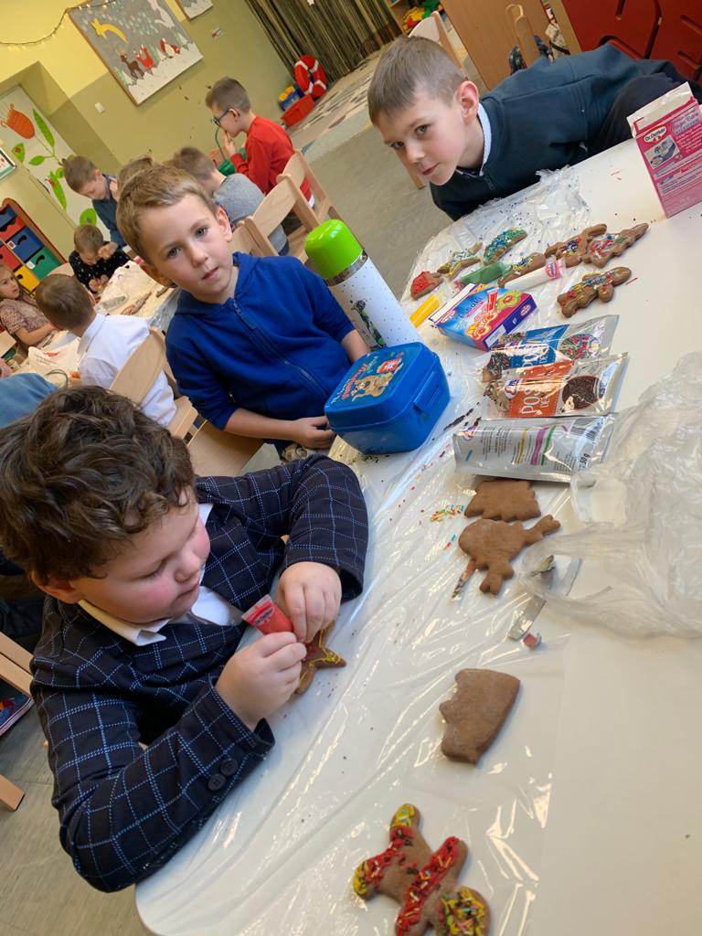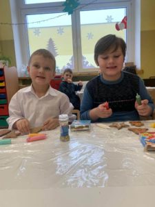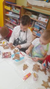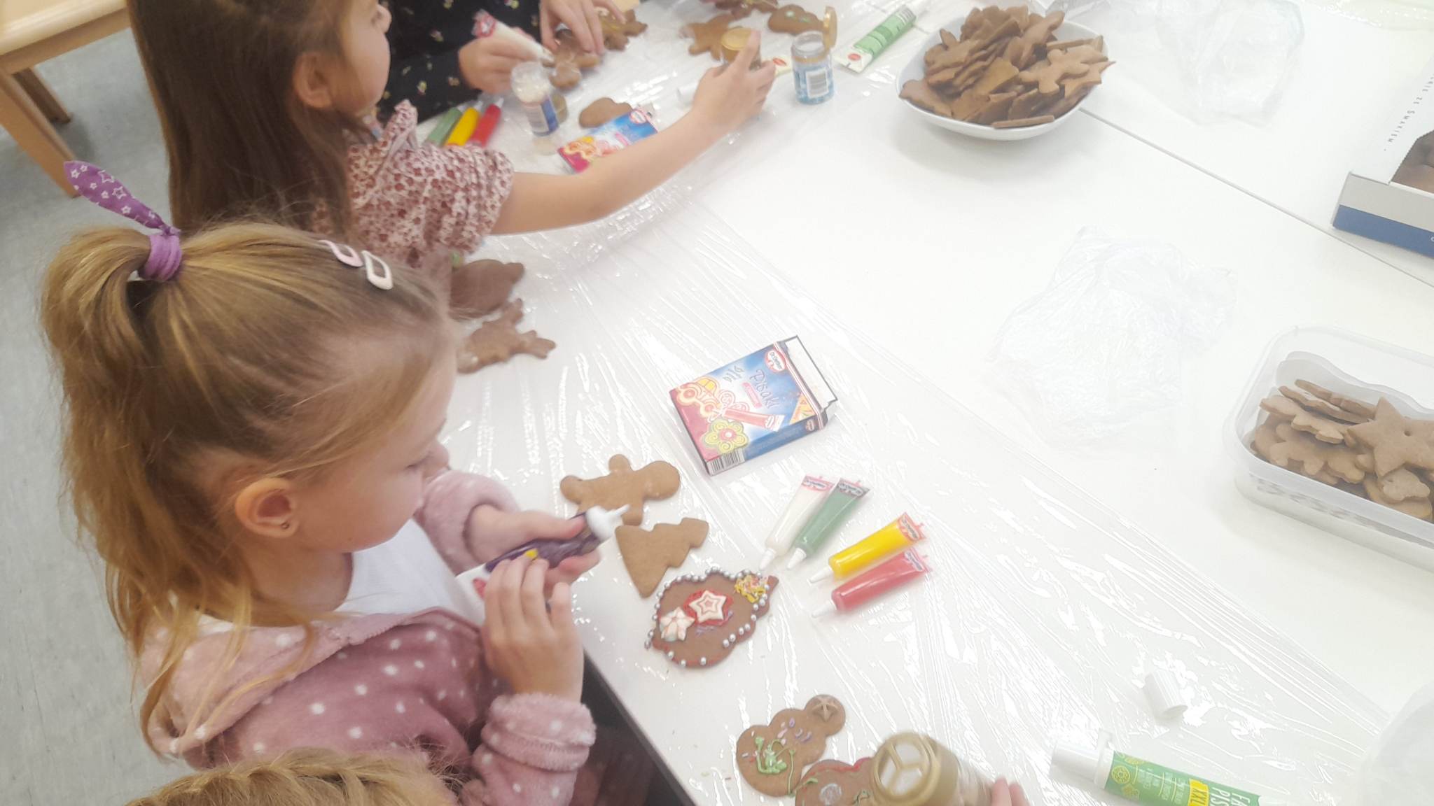 Dekorowanie pierniczków lukrowymi pisakami i kolorową posypką to też okazja do spotkania w miłej przedświątecznej atmosferze. Poprzez wspólne działania, samodzielne dekorowanie pierniczków dzieci mogły osobiście doświadczyć świątecznych przygotowań, kultywowały tradycję, pobudzały inwencję twórczą oraz odczuwały radość świątecznego oczekiwania.