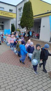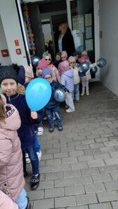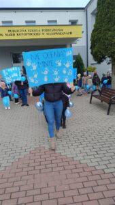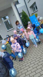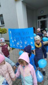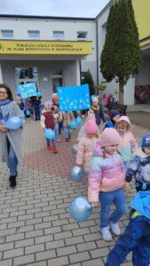 8 kwietnia w naszym przedszkolu obchodziliśmy Dzień Świadomości Autyzmu – ważne święto, które przypomina, że każdy człowiek rozwija się w swoim tempie, ma swoje mocne strony, potrzeby i wyjątkowy sposób patrzenia na świat. Autyzm to zaburzenie neurorozwojowe, które wpływa na sposób komunikowania się, odbierania bodźców i budowania relacji. Dzieci i dorośli w spektrum często widzą i czują więcej, inaczej porządkują informacje, a ich świat bywa pełen intensywnych wrażeń. Naszym zadaniem – jako społeczności -jest tworzyć przestrzeń pełną zrozumienia, akceptacji i życzliwości. Od samego rana wszystkie grupy świętowały ten dzień w swoich salach. Dzieci i nauczyciele przyszli ubrani na niebiesko, czyli w kolorze solidarności z osobami w spektrum autyzmu. W każdej grupie odbyły się rozmowy, zajęcia i aktywności, które pomagały dzieciom zrozumieć, że różnimy się od siebie – i to jest wartość. Kulminacją wydarzenia był uroczysty przemarsz, w którym uczestniczyło całe przedszkole. Każda grupa przygotowała własny transparent -dzieci odbijały na nich swoje dłonie, tworząc symbol jedności i wspólnego działania. Każde dziecko trzymało również niebieski balon, który dodawał wydarzeniu wyjątkowego, radosnego charakteru.