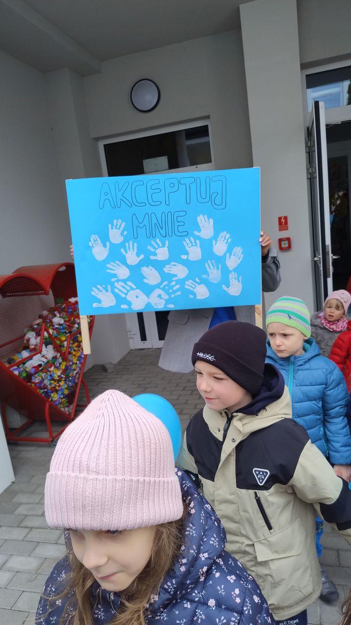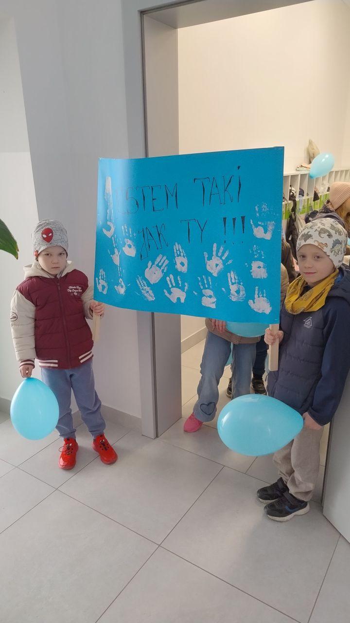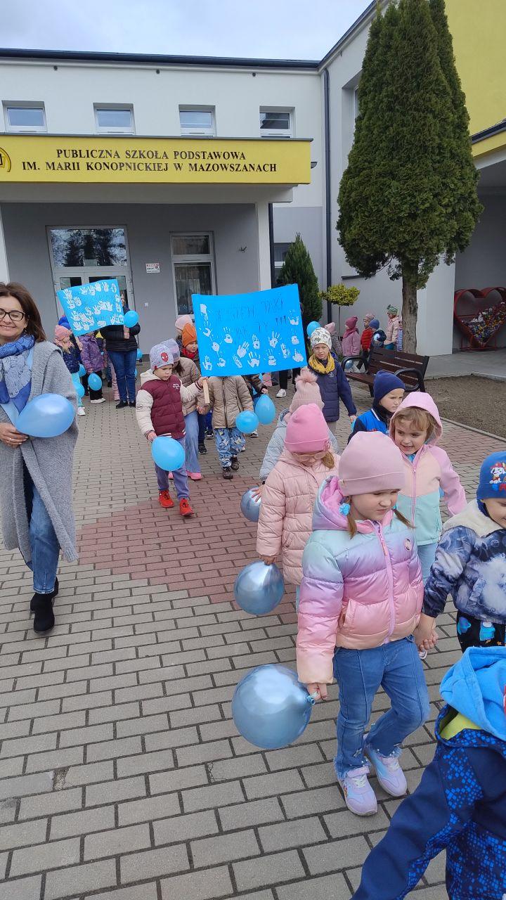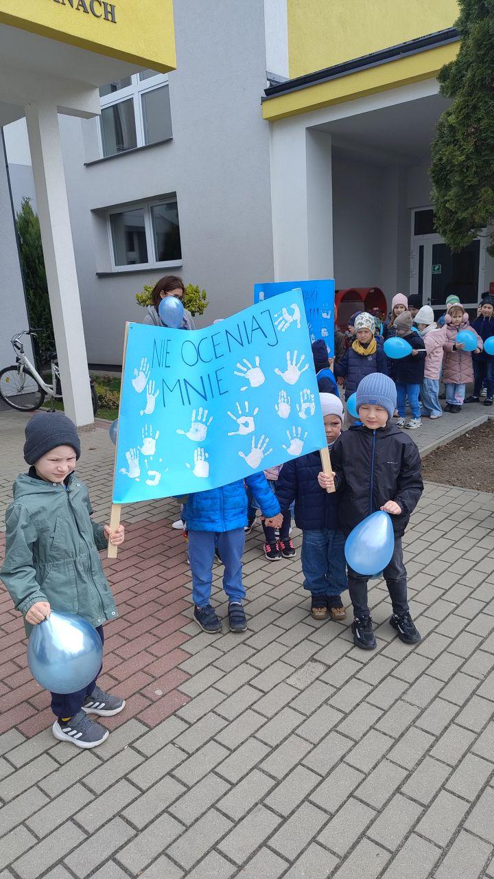 8 kwietnia w naszym przedszkolu obchodziliśmy Dzień Świadomości Autyzmu – ważne święto, które przypomina, że każdy człowiek rozwija się w swoim tempie, ma swoje mocne strony, potrzeby i wyjątkowy sposób patrzenia na świat. Autyzm to zaburzenie neurorozwojowe, które wpływa na sposób komunikowania się, odbierania bodźców i budowania relacji. Dzieci i dorośli w spektrum często widzą i czują więcej, inaczej porządkują informacje, a ich świat bywa pełen intensywnych wrażeń. Naszym zadaniem – jako społeczności -jest tworzyć przestrzeń pełną zrozumienia, akceptacji i życzliwości. Od samego rana wszystkie grupy świętowały ten dzień w swoich salach. Dzieci i nauczyciele przyszli ubrani na niebiesko, czyli w kolorze solidarności z osobami w spektrum autyzmu. W każdej grupie odbyły się rozmowy, zajęcia i aktywności, które pomagały dzieciom zrozumieć, że różnimy się od siebie – i to jest wartość. Kulminacją wydarzenia był uroczysty przemarsz, w którym uczestniczyło całe przedszkole. Każda grupa przygotowała własny transparent -dzieci odbijały na nich swoje dłonie, tworząc symbol jedności i wspólnego działania. Każde dziecko trzymało również niebieski balon, który dodawał wydarzeniu wyjątkowego, radosnego charakteru.