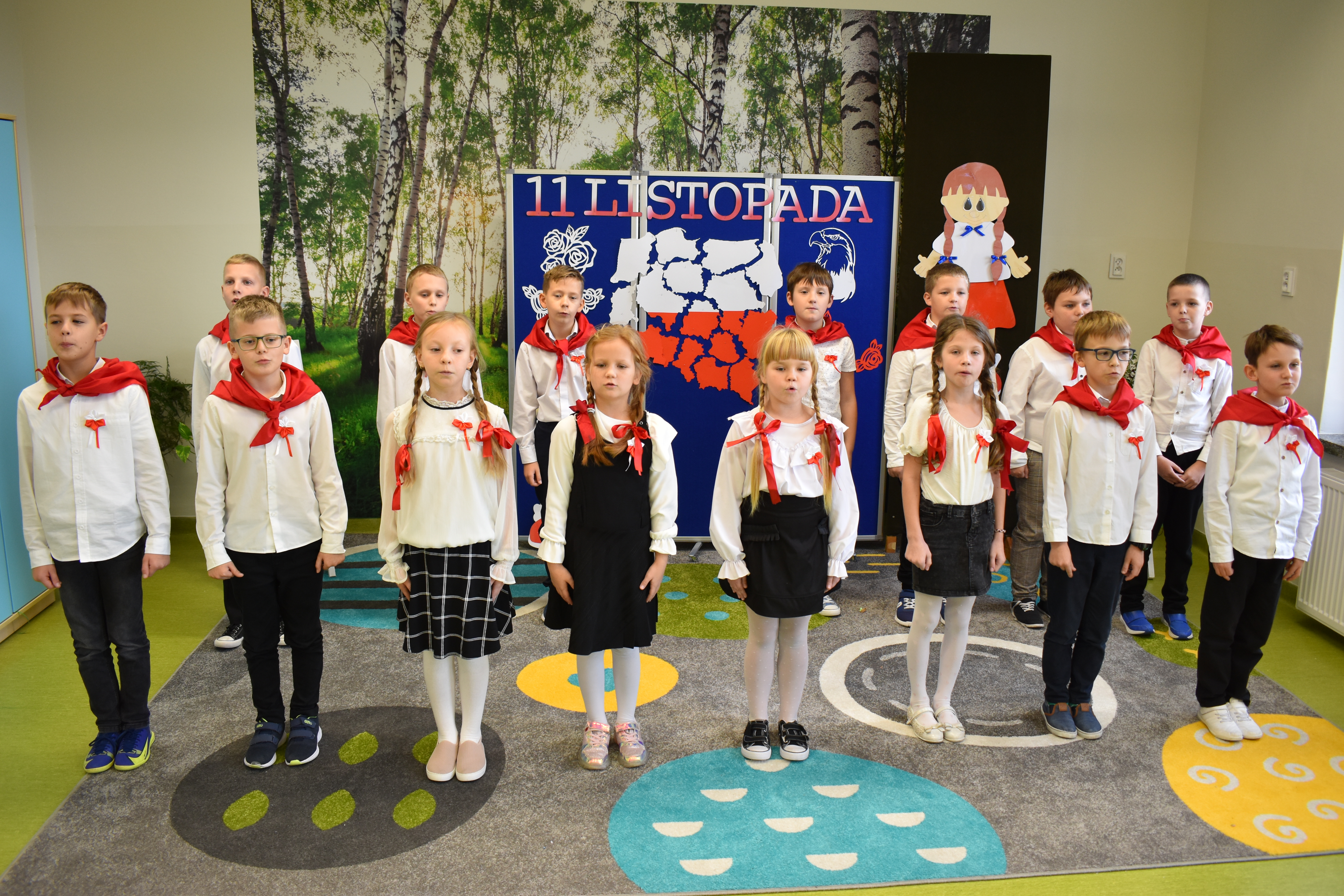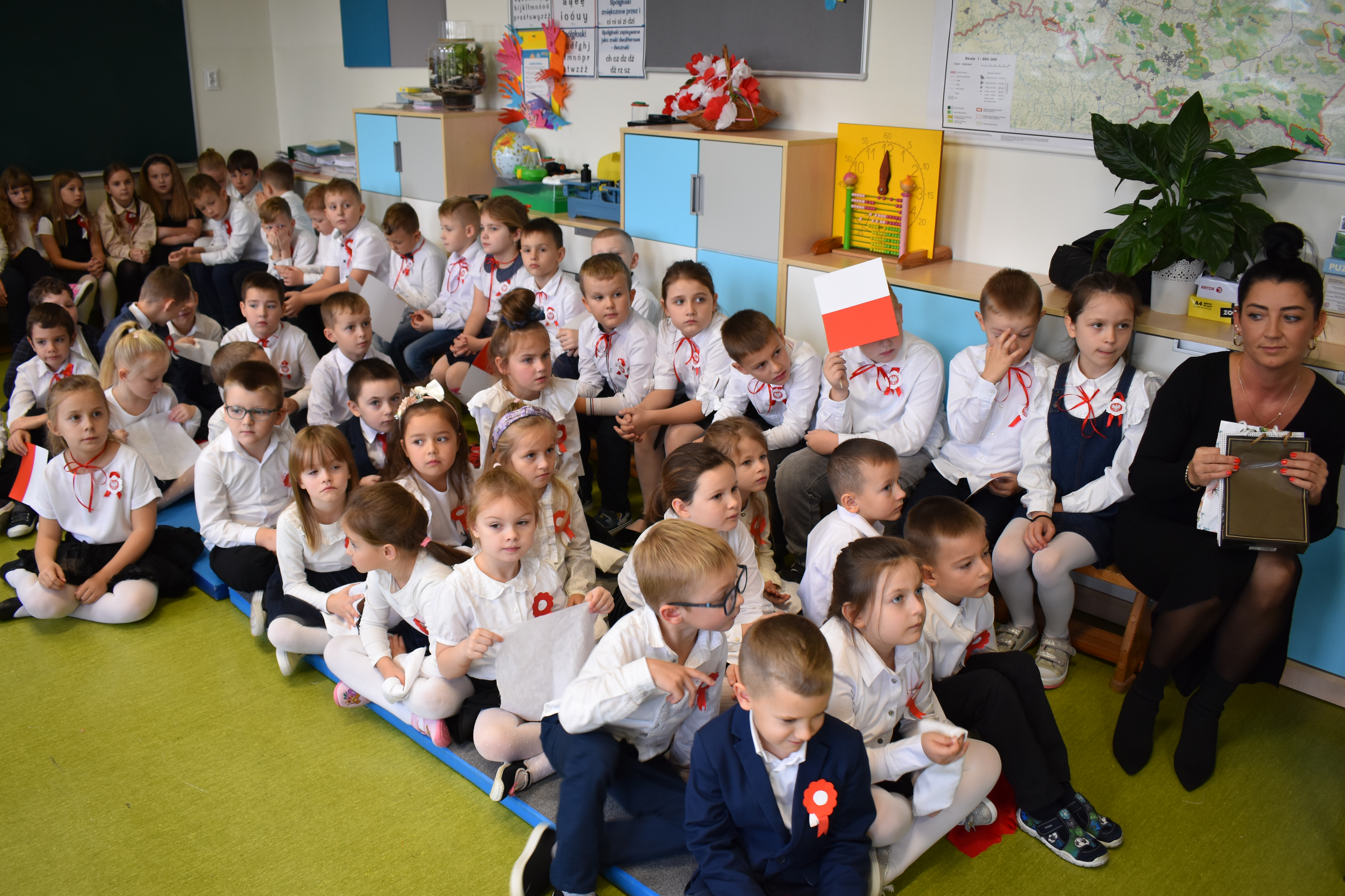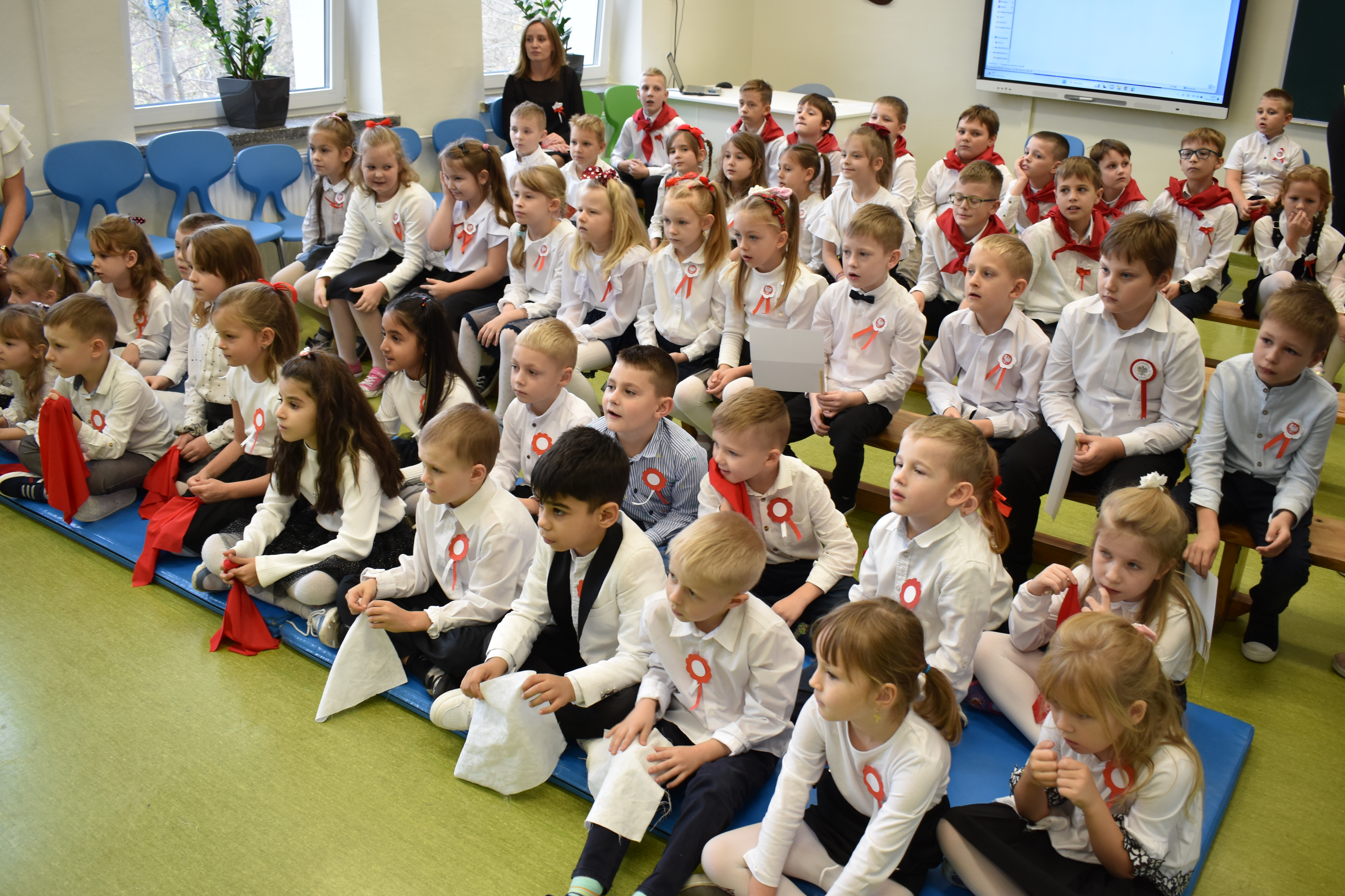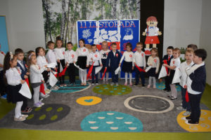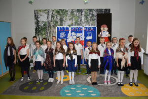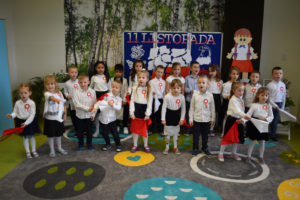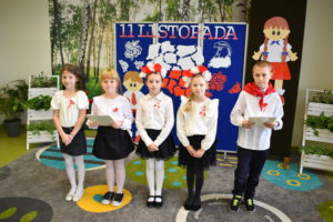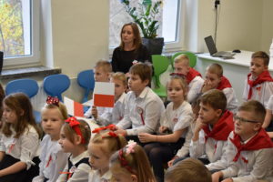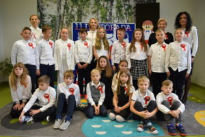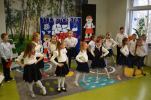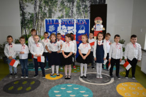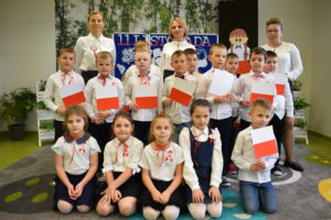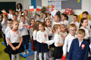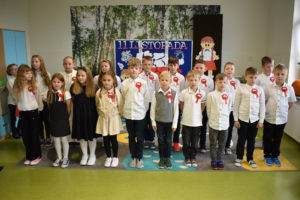 Wszyscy uczniowie klas 0- 3 z wielkim szacunkiem i dumą prezentowali przygotowane pieśni ukazując tym samym, że w sercach nawet tych najmłodszych Polaków jest pamięć i świadomość o trudnych dziejach naszej ojczyzny i ogromna radość z odzyskanej wolności. Ta niezwykła lekcja muzyki przypomniała wszystkim, że to w pieśni patriotycznej zaklęta jest opowieść o losach Ojczyzny. Wyjątkowy charakter tego święta podkreślał strój galowy uczniów wzbogacony o kotyliony, wianki, chusty oraz flagi w barwach biało-czerwonych. Na zakończenie uroczystości uczniowie wspólnie odśpiewali pieśń „ Przybyli ułani”.