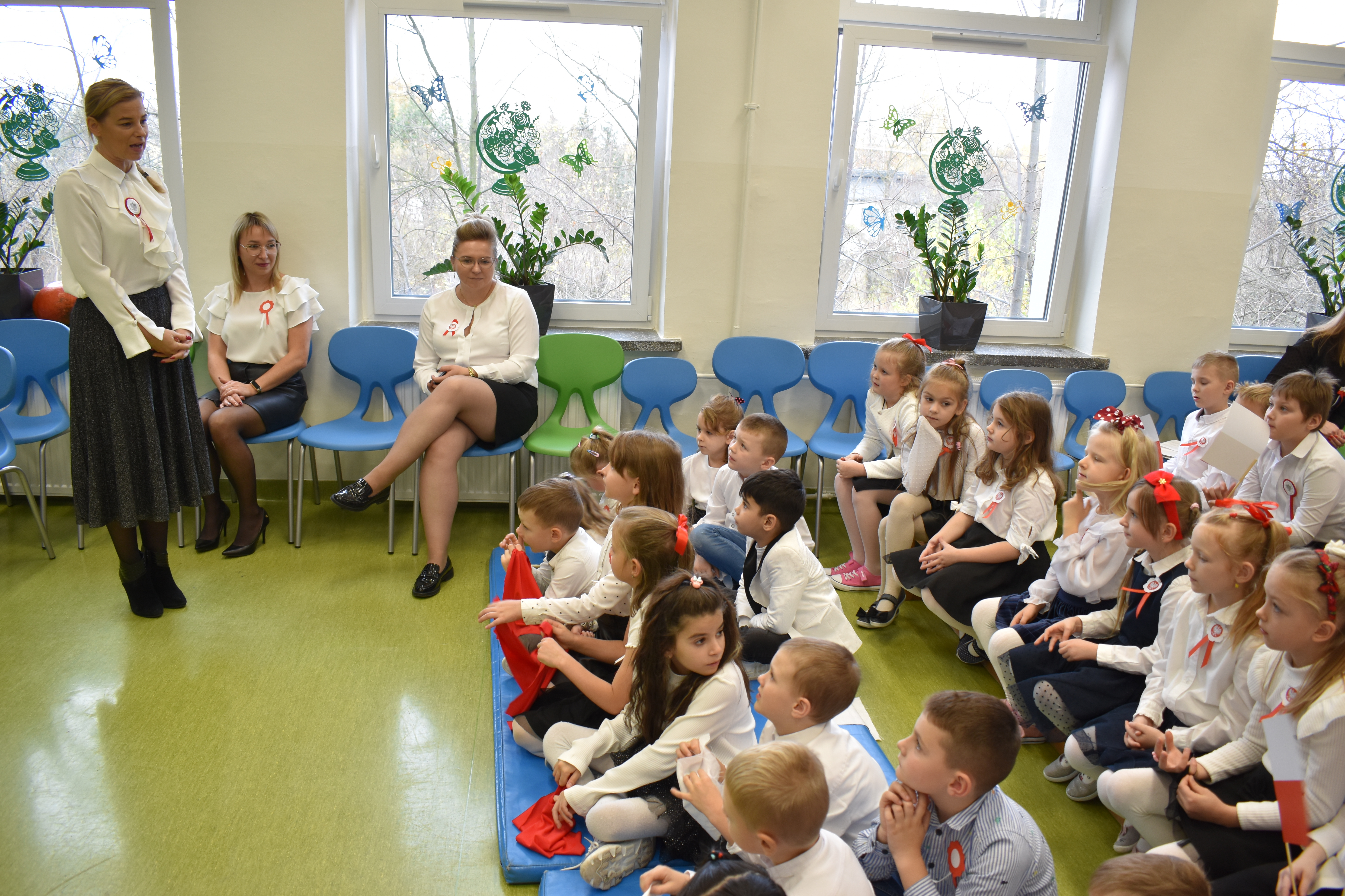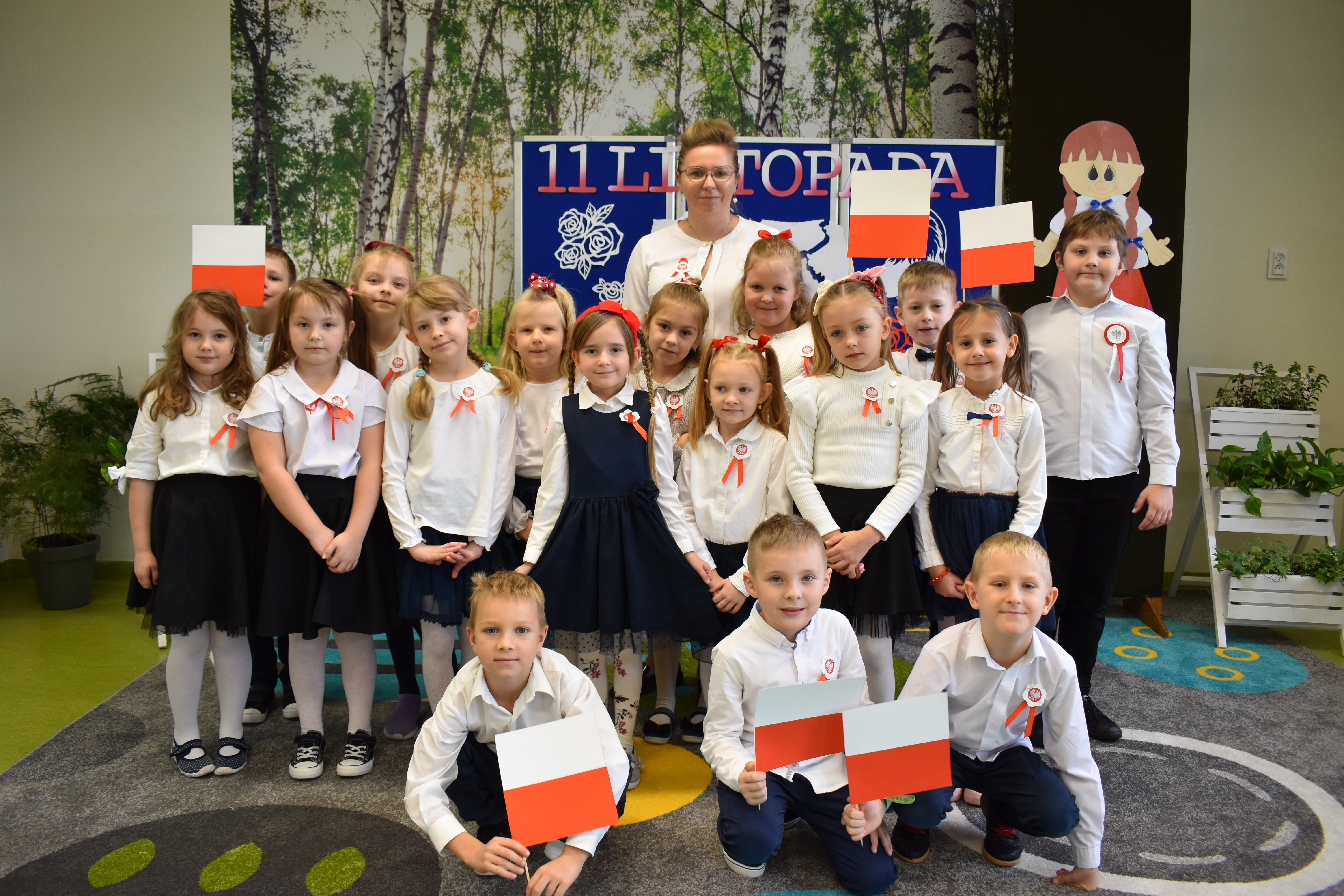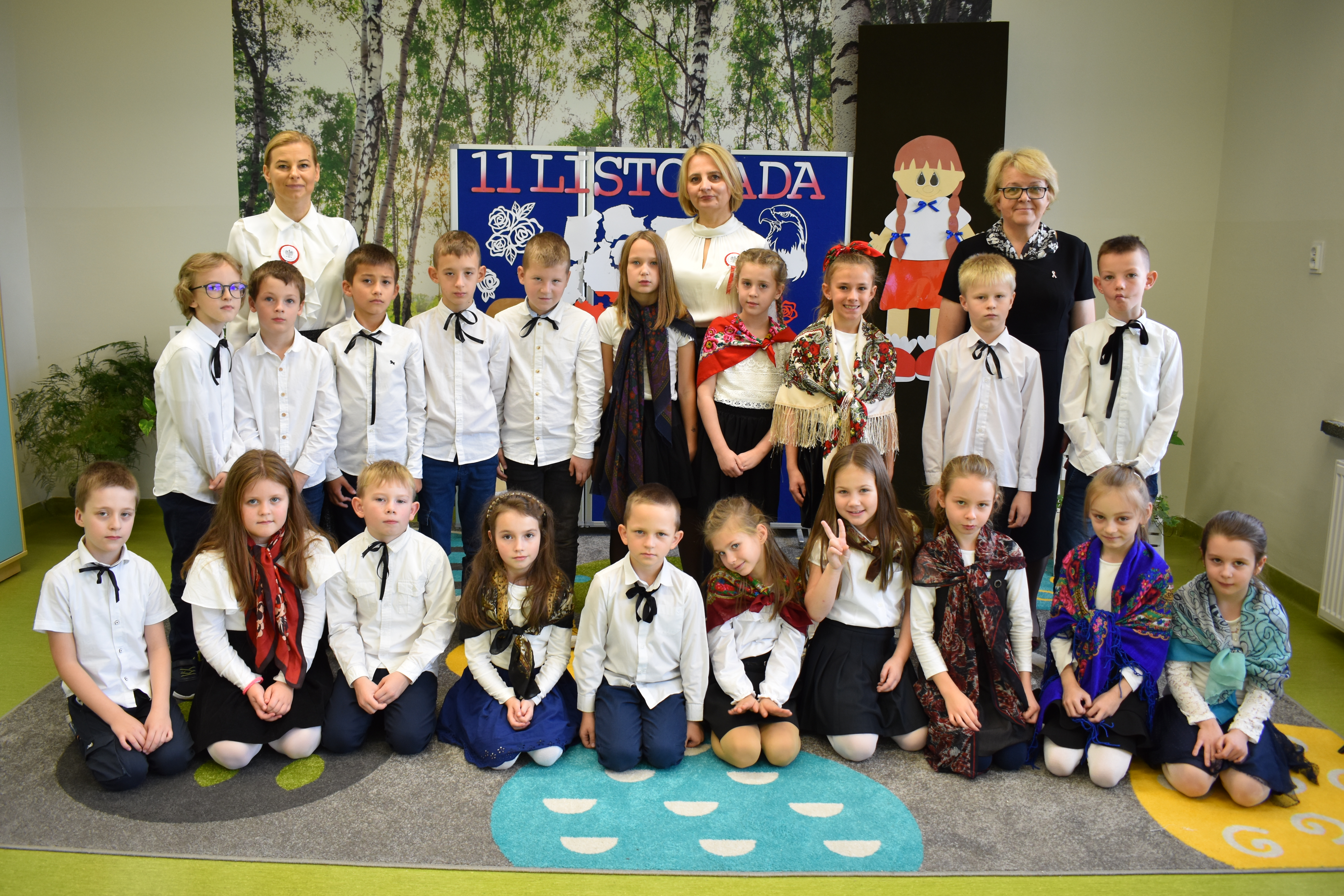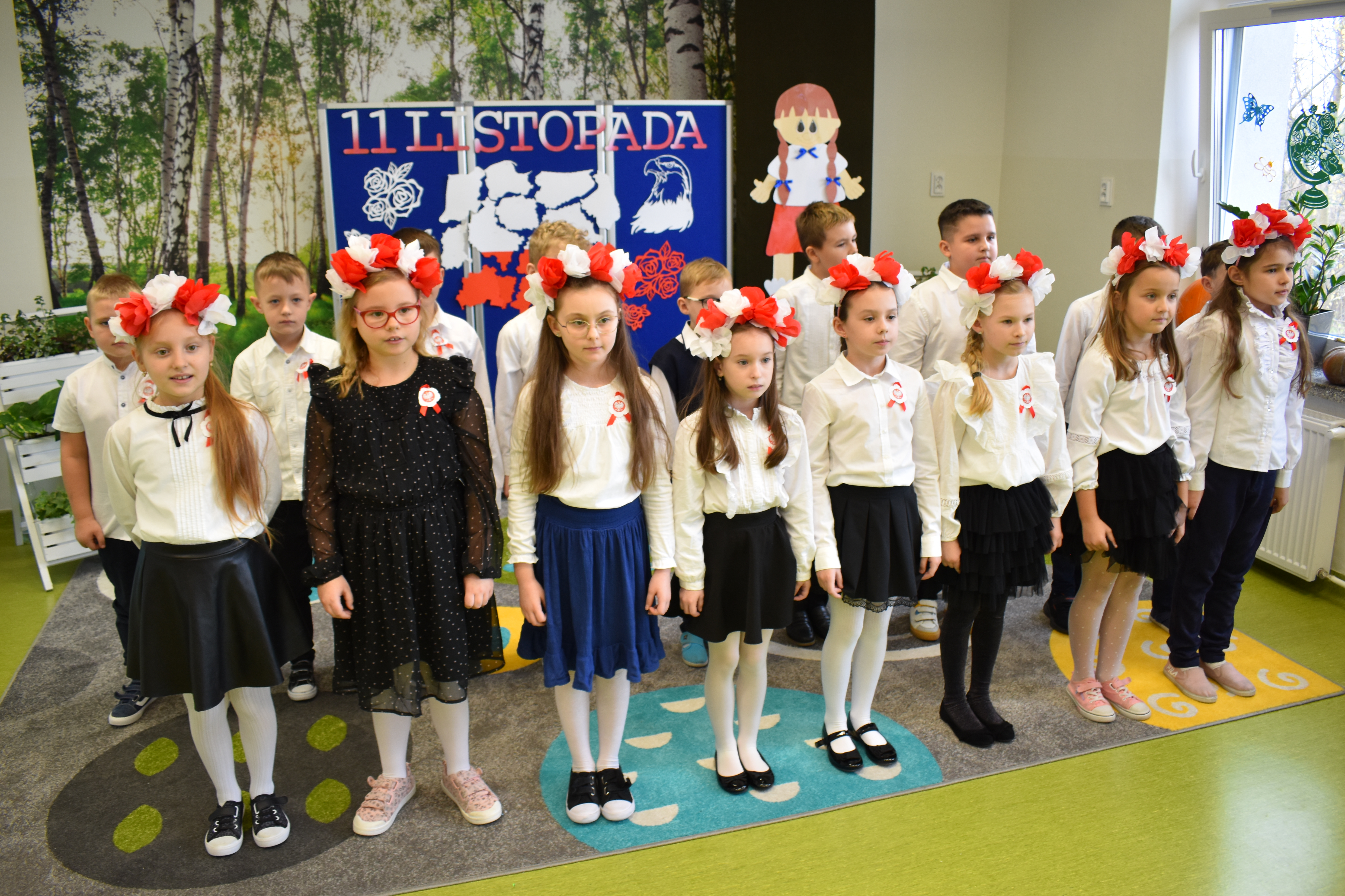 Wszyscy uczniowie klas 0- 3 z wielkim szacunkiem i dumą prezentowali przygotowane pieśni ukazując tym samym, że w sercach nawet tych najmłodszych Polaków jest pamięć i świadomość o trudnych dziejach naszej ojczyzny i ogromna radość z odzyskanej wolności. Ta niezwykła lekcja muzyki przypomniała wszystkim, że to w pieśni patriotycznej zaklęta jest opowieść o losach Ojczyzny. Wyjątkowy charakter tego święta podkreślał strój galowy uczniów wzbogacony o kotyliony, wianki, chusty oraz flagi w barwach biało-czerwonych. Na zakończenie uroczystości uczniowie wspólnie odśpiewali pieśń „ Przybyli ułani”.