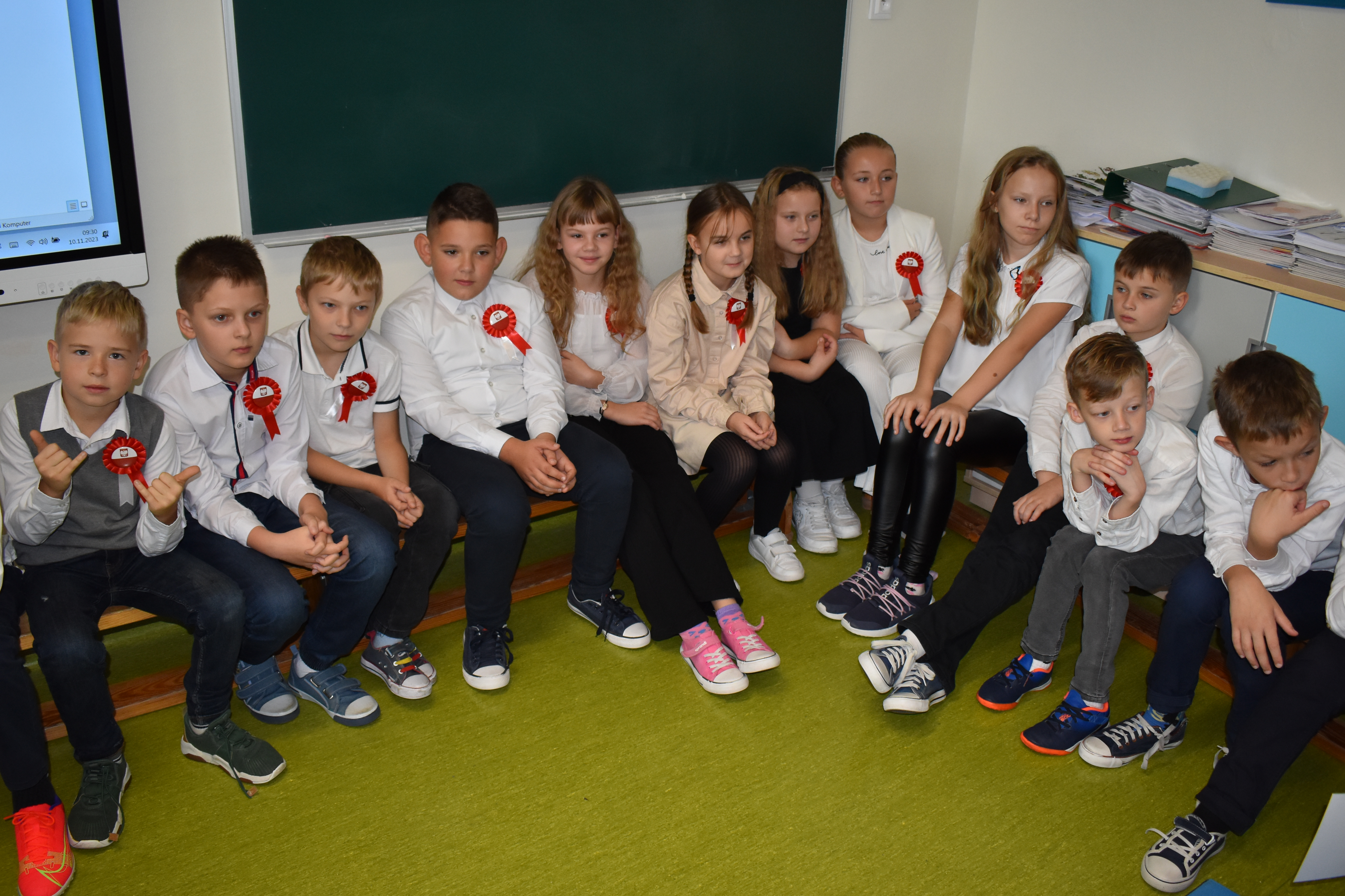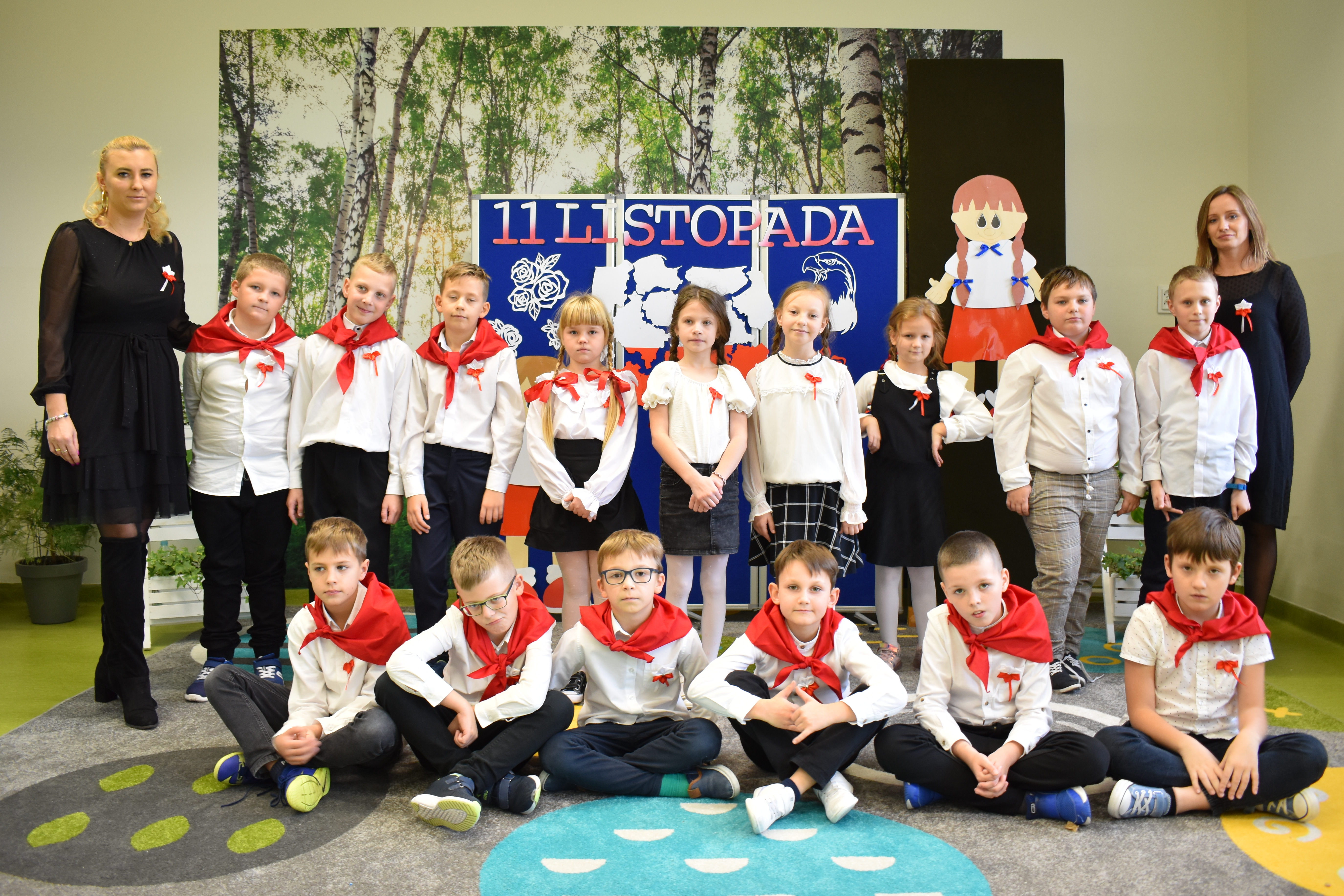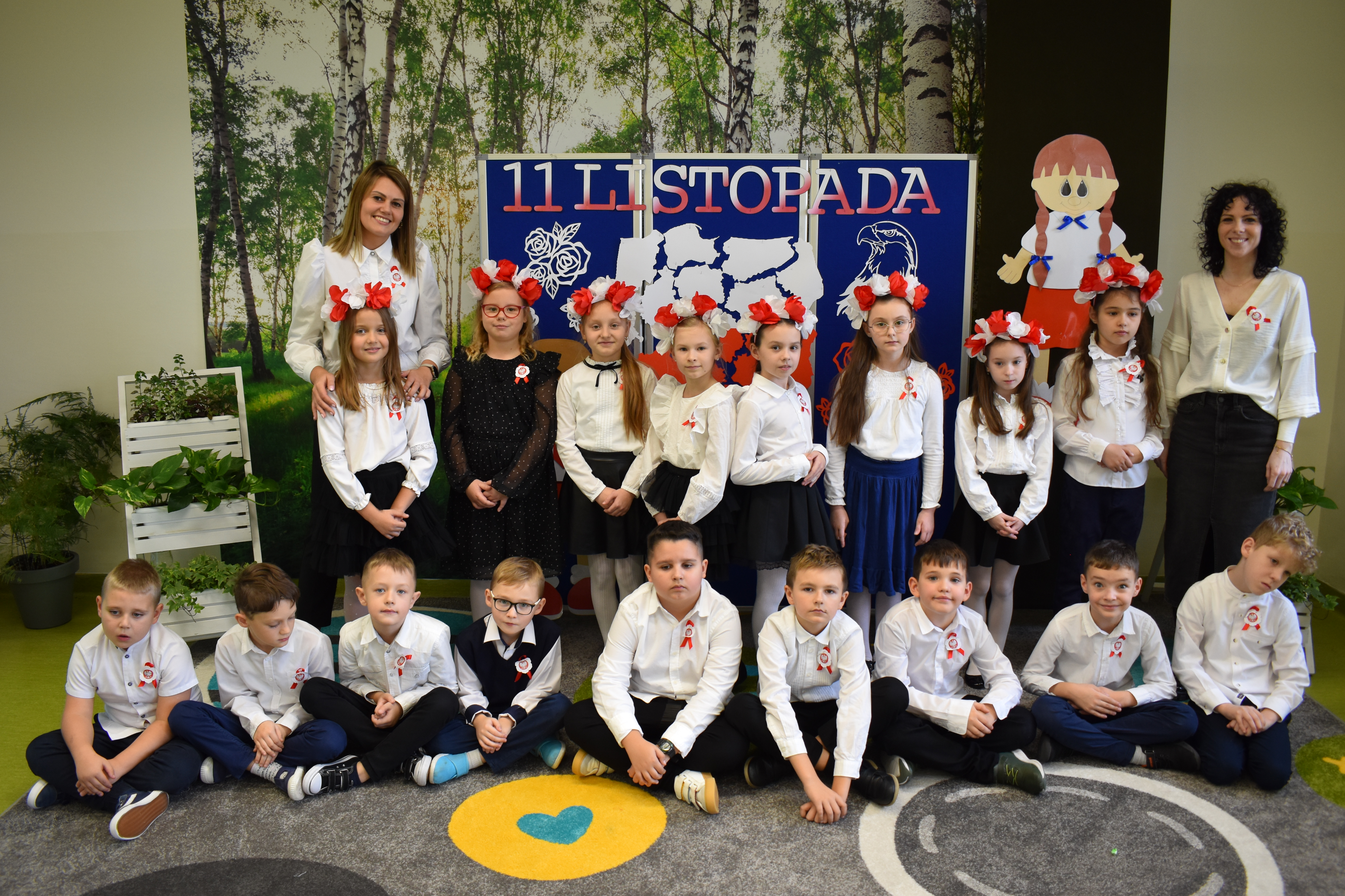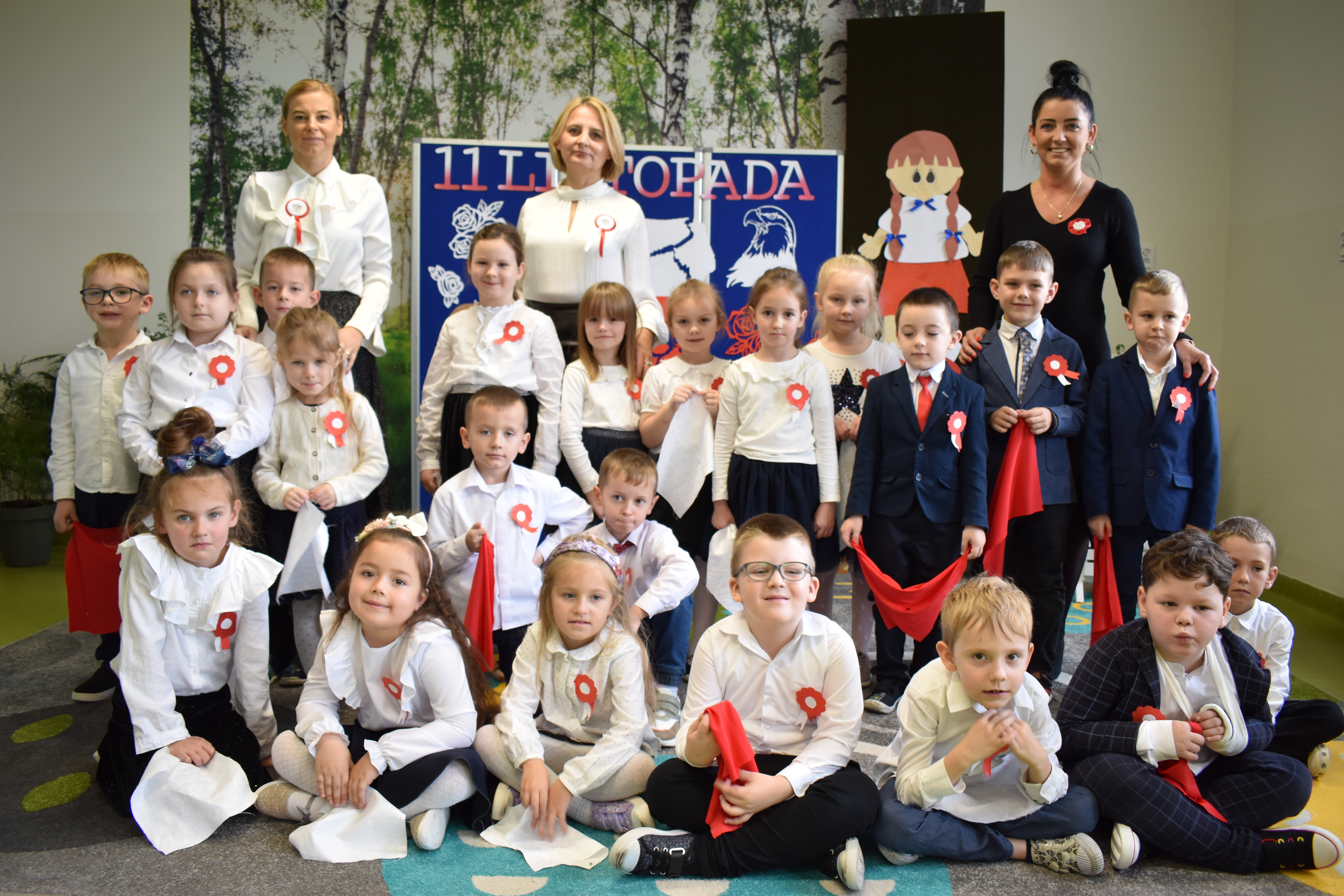 Wszyscy uczniowie klas 0- 3 z wielkim szacunkiem i dumą prezentowali przygotowane pieśni ukazując tym samym, że w sercach nawet tych najmłodszych Polaków jest pamięć i świadomość o trudnych dziejach naszej ojczyzny i ogromna radość z odzyskanej wolności. Ta niezwykła lekcja muzyki przypomniała wszystkim, że to w pieśni patriotycznej zaklęta jest opowieść o losach Ojczyzny. Wyjątkowy charakter tego święta podkreślał strój galowy uczniów wzbogacony o kotyliony, wianki, chusty oraz flagi w barwach biało-czerwonych. Na zakończenie uroczystości uczniowie wspólnie odśpiewali pieśń „ Przybyli ułani”.