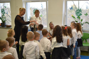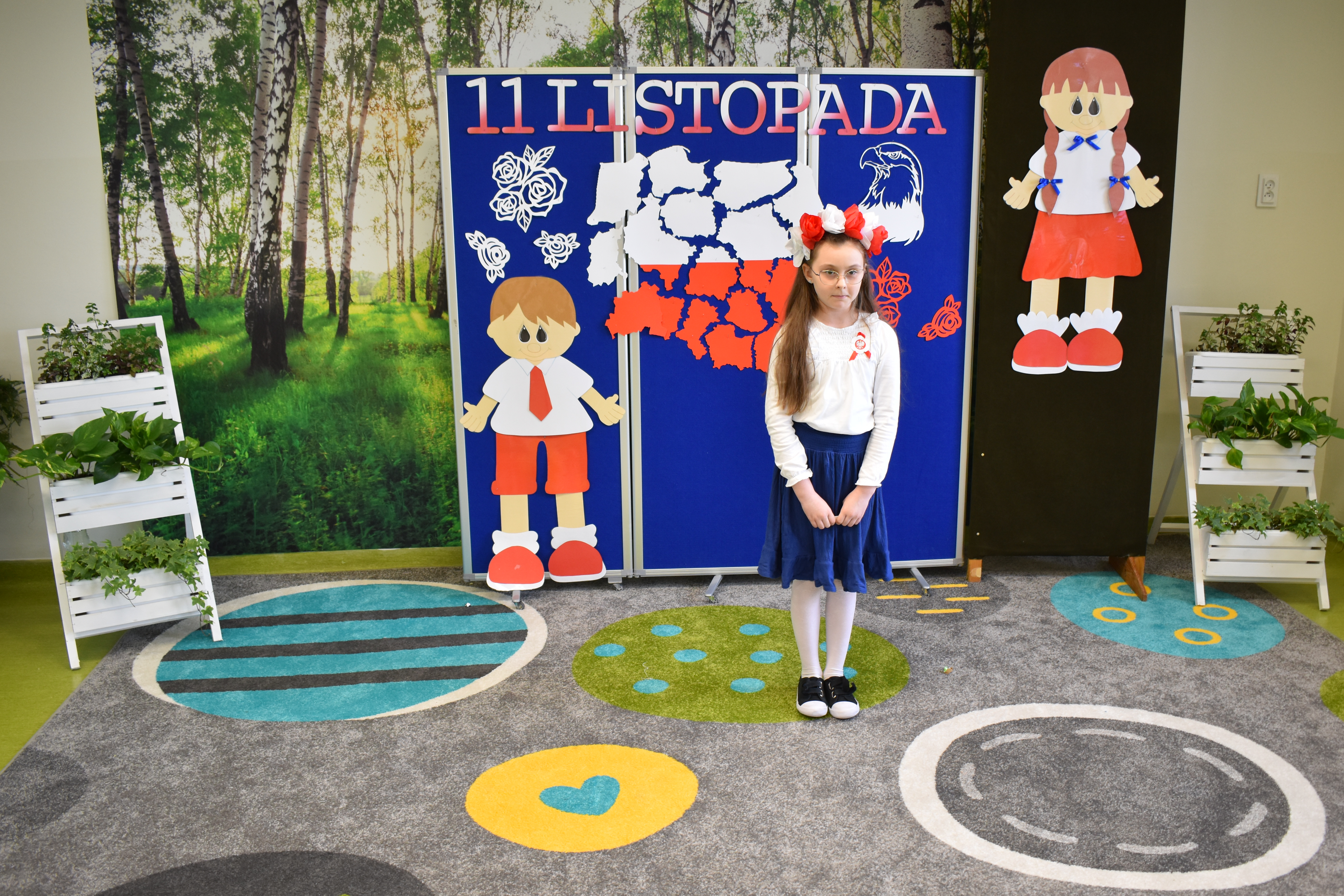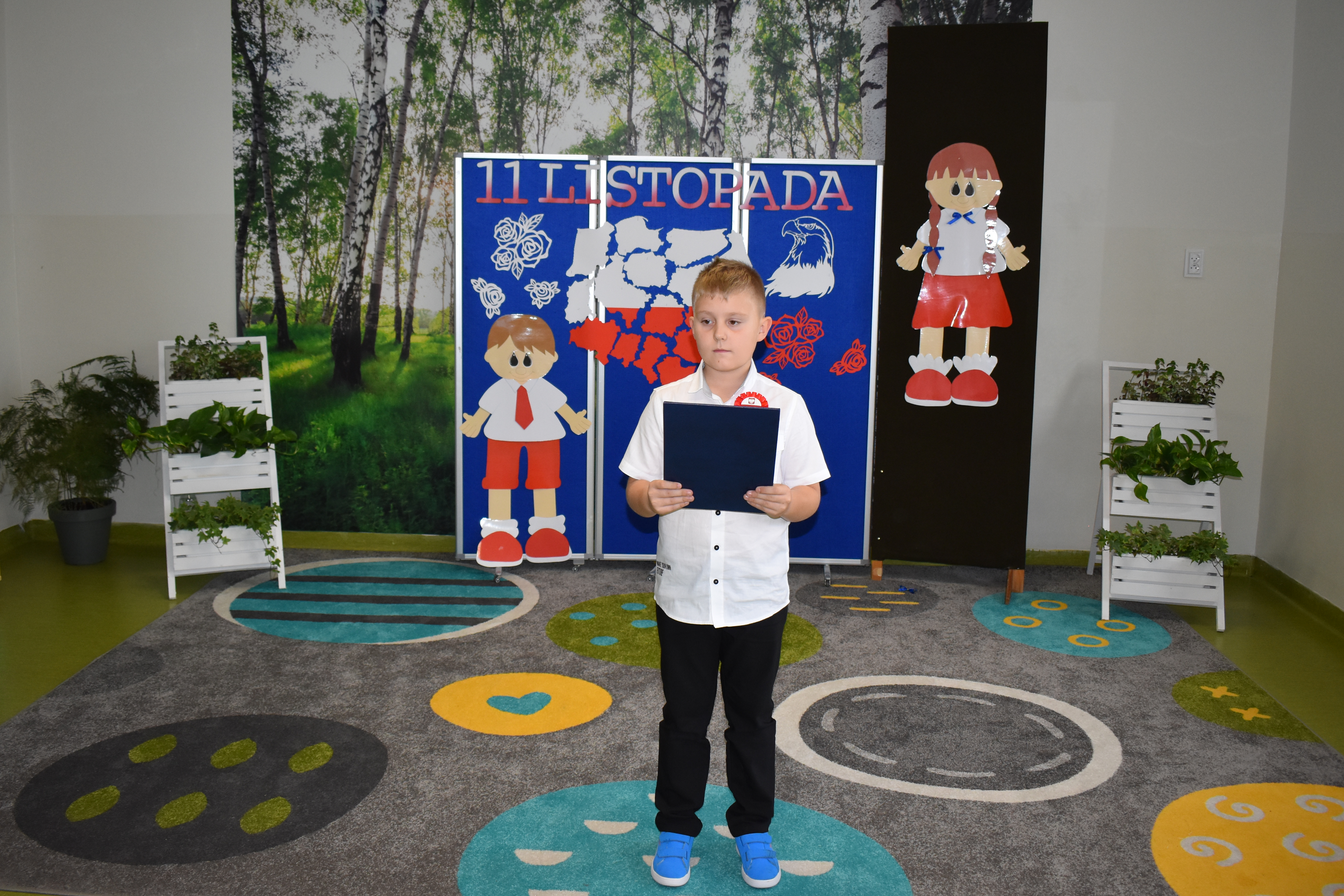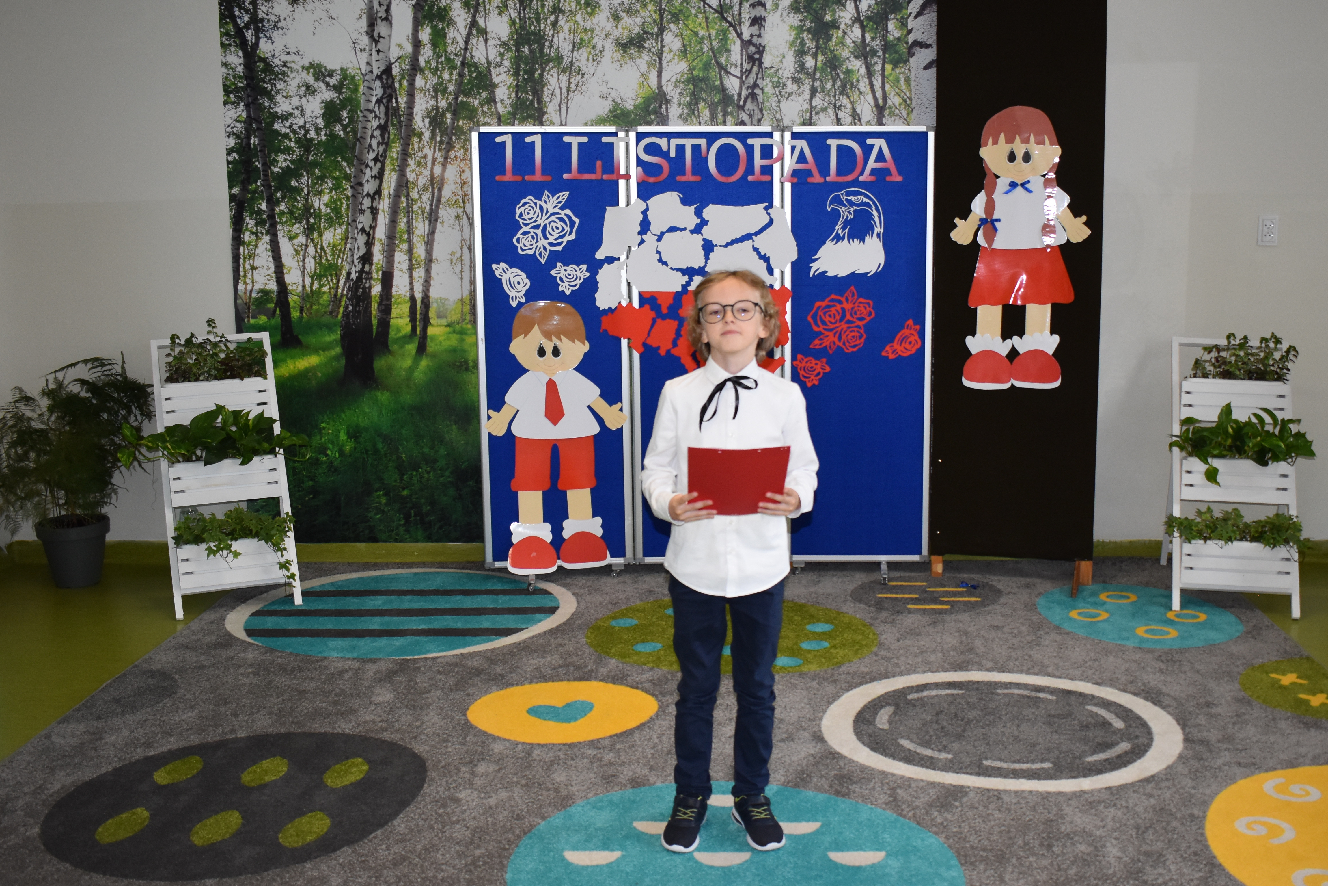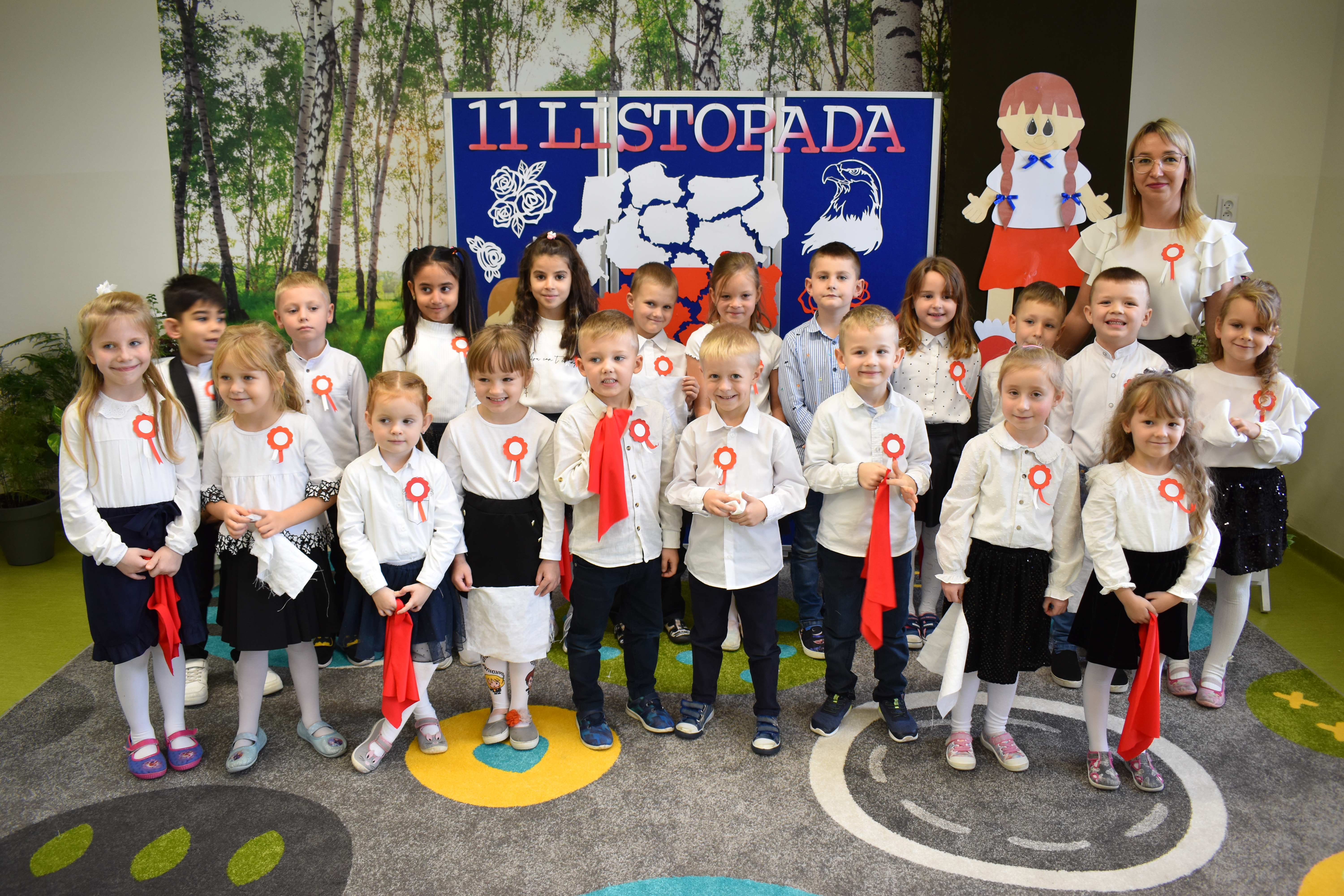 Wszyscy uczniowie klas 0- 3 z wielkim szacunkiem i dumą prezentowali przygotowane pieśni ukazując tym samym, że w sercach nawet tych najmłodszych Polaków jest pamięć i świadomość o trudnych dziejach naszej ojczyzny i ogromna radość z odzyskanej wolności. Ta niezwykła lekcja muzyki przypomniała wszystkim, że to w pieśni patriotycznej zaklęta jest opowieść o losach Ojczyzny. Wyjątkowy charakter tego święta podkreślał strój galowy uczniów wzbogacony o kotyliony, wianki, chusty oraz flagi w barwach biało-czerwonych. Na zakończenie uroczystości uczniowie wspólnie odśpiewali pieśń „ Przybyli ułani”.