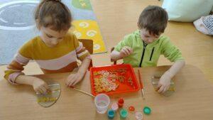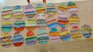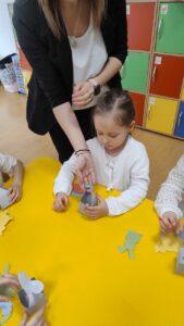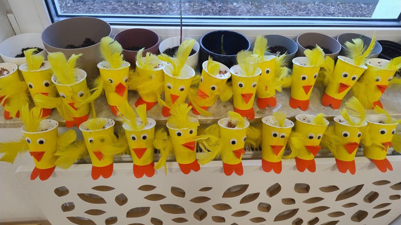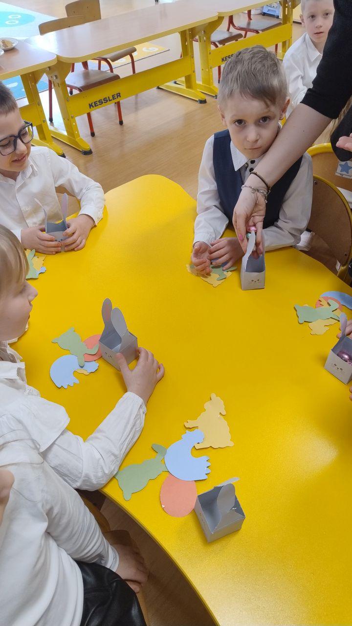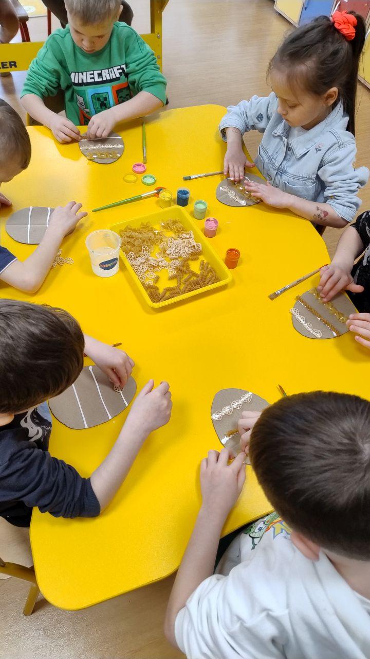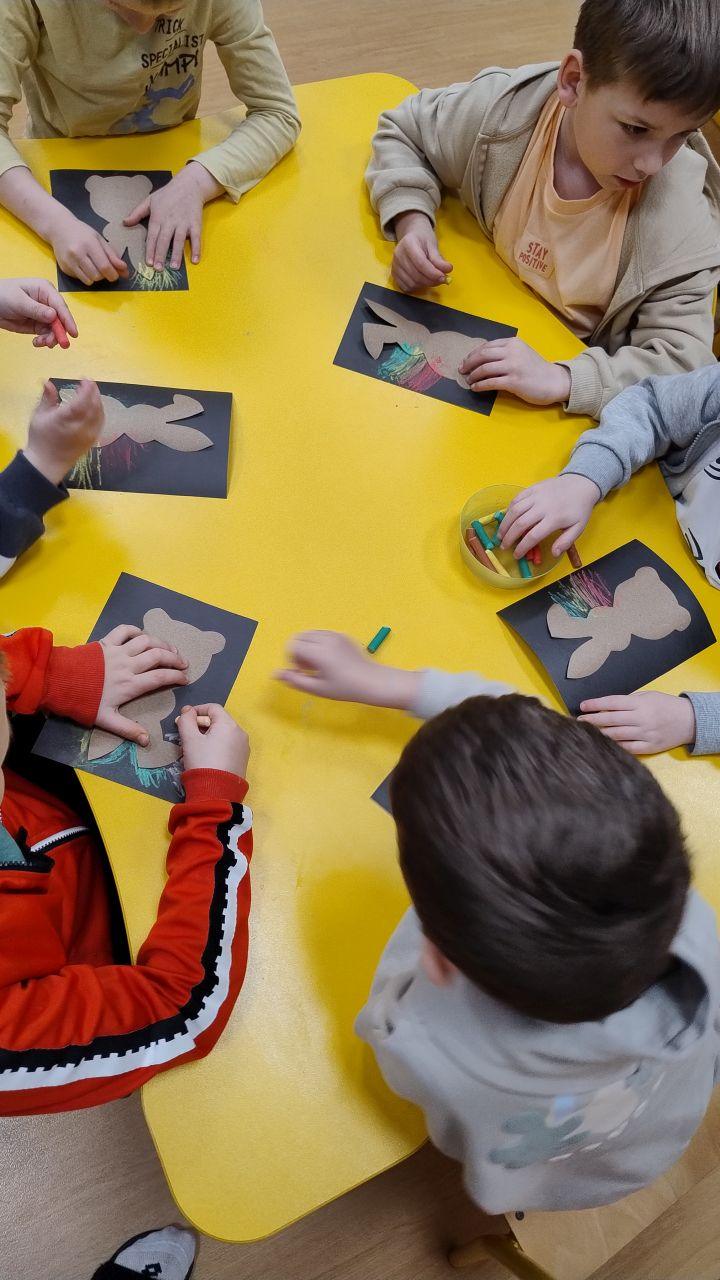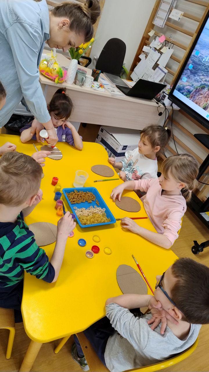 Powstał kolorowy zajączek wielkanocny w barwach tęczy, który zachwycił wszystkich swoją radosną formą. Dzieci wykonały również urocze kurczaki, w których posadziły rzeżuchę – z dumą obserwując, jak rośnie każdego dnia. Nie zabrakło także własnoręcznie zdobionych pisanek, do których wykorzystano makaron, co dało niezwykle ciekawy i oryginalny efekt. Kolejną pracą były koszyczki‑króliczki, do których dzieci otrzymały słodką niespodziankę -czekoladowe jajeczka.