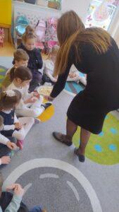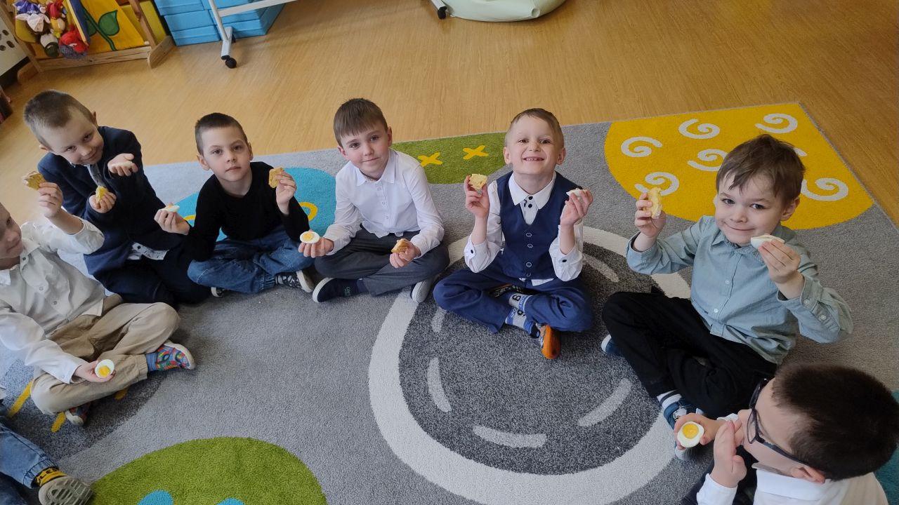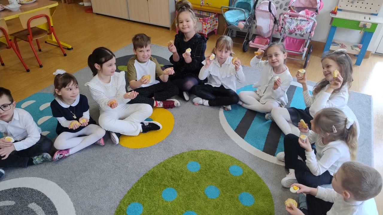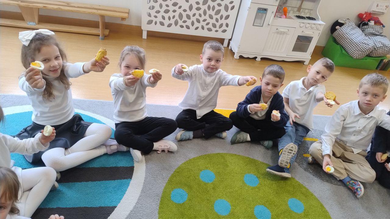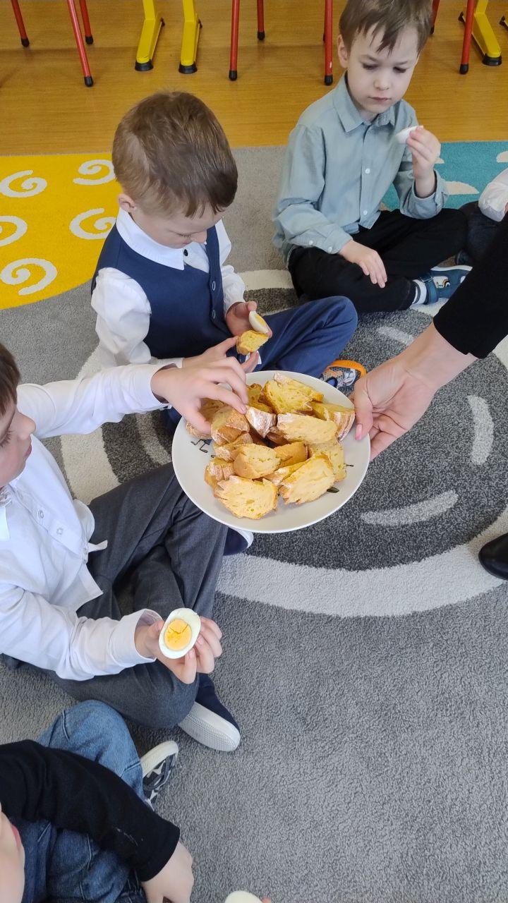 W ostatnim dniu przygotowań czekała na dzieci świąteczna degustacja – wspólnie częstowaliśmy się jajeczkiem oraz tradycyjną babką wielkanocną, co wprowadziło wszystkich w jeszcze bardziej uroczysty nastrój.