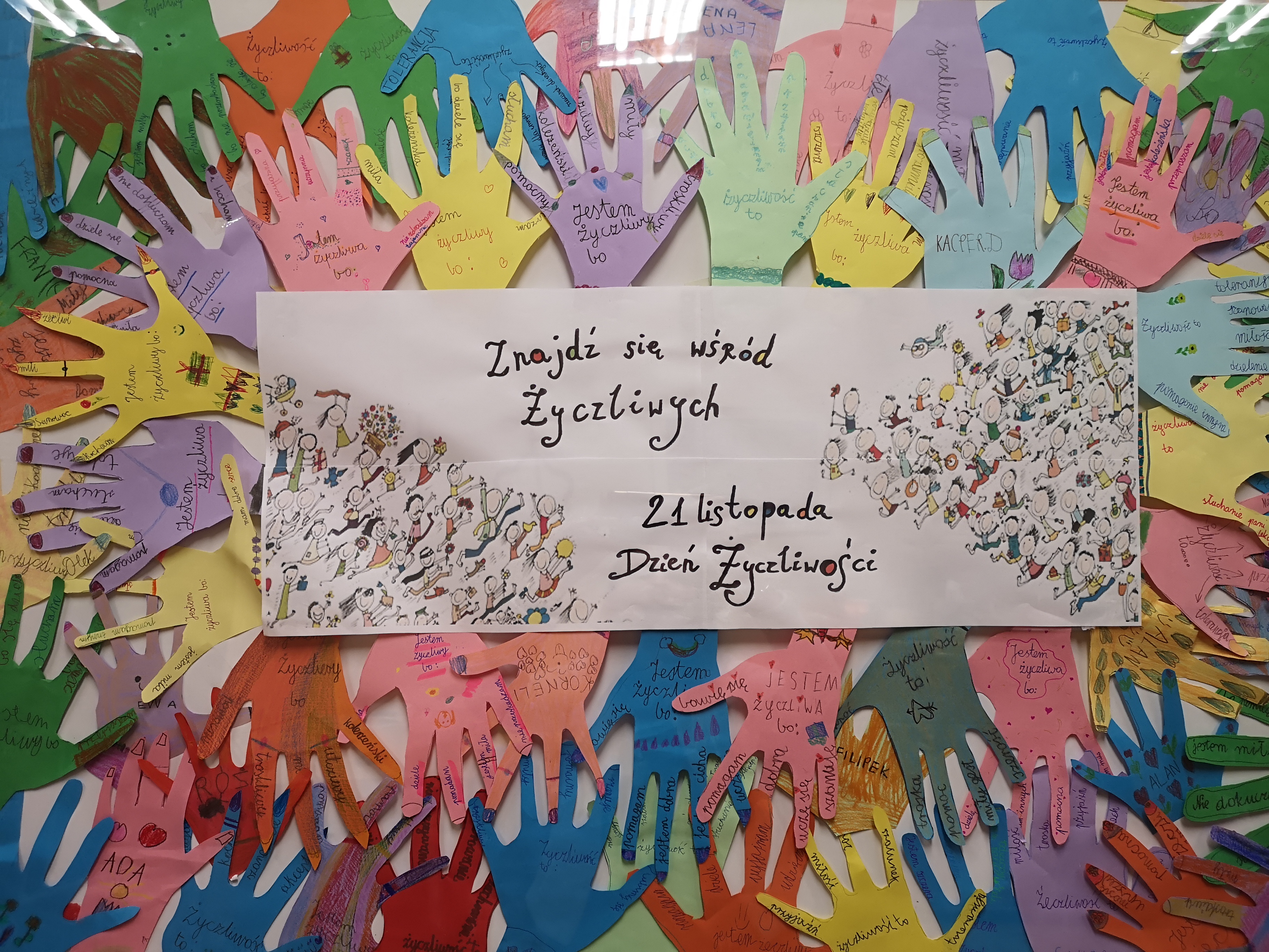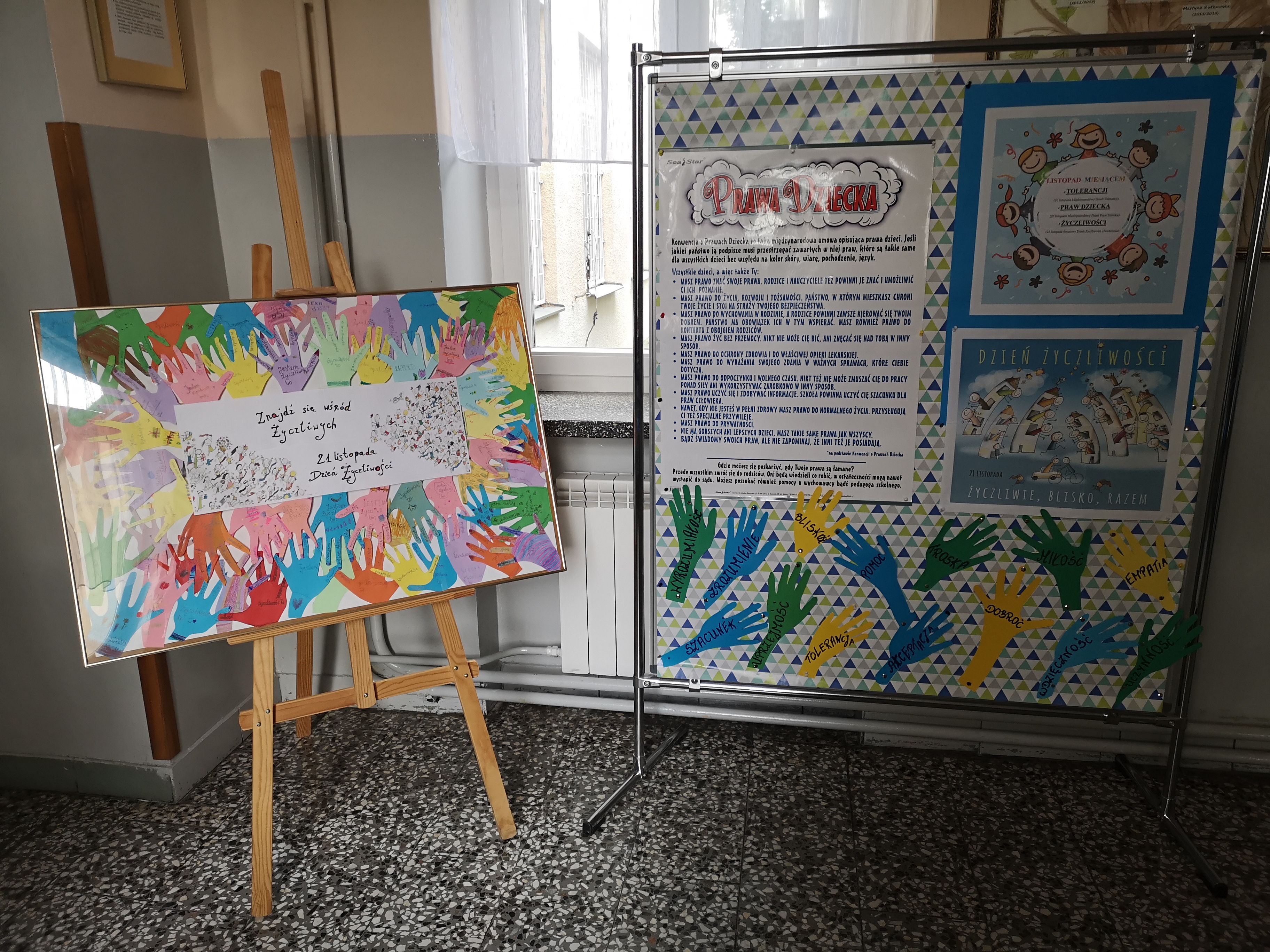 Z okazji Międzynarodowego Dnia Tolerancji (16 listopad) oraz Światowego Dnia Życzliwości (21 listopad) w naszej szkole powstała tablica przybliżająca znaczenie słowa tolerancja oraz wielki plakat stworzony z kolorowych rączek naszych dzieci, komunikujący znaczenie słowa „życzliwość”.