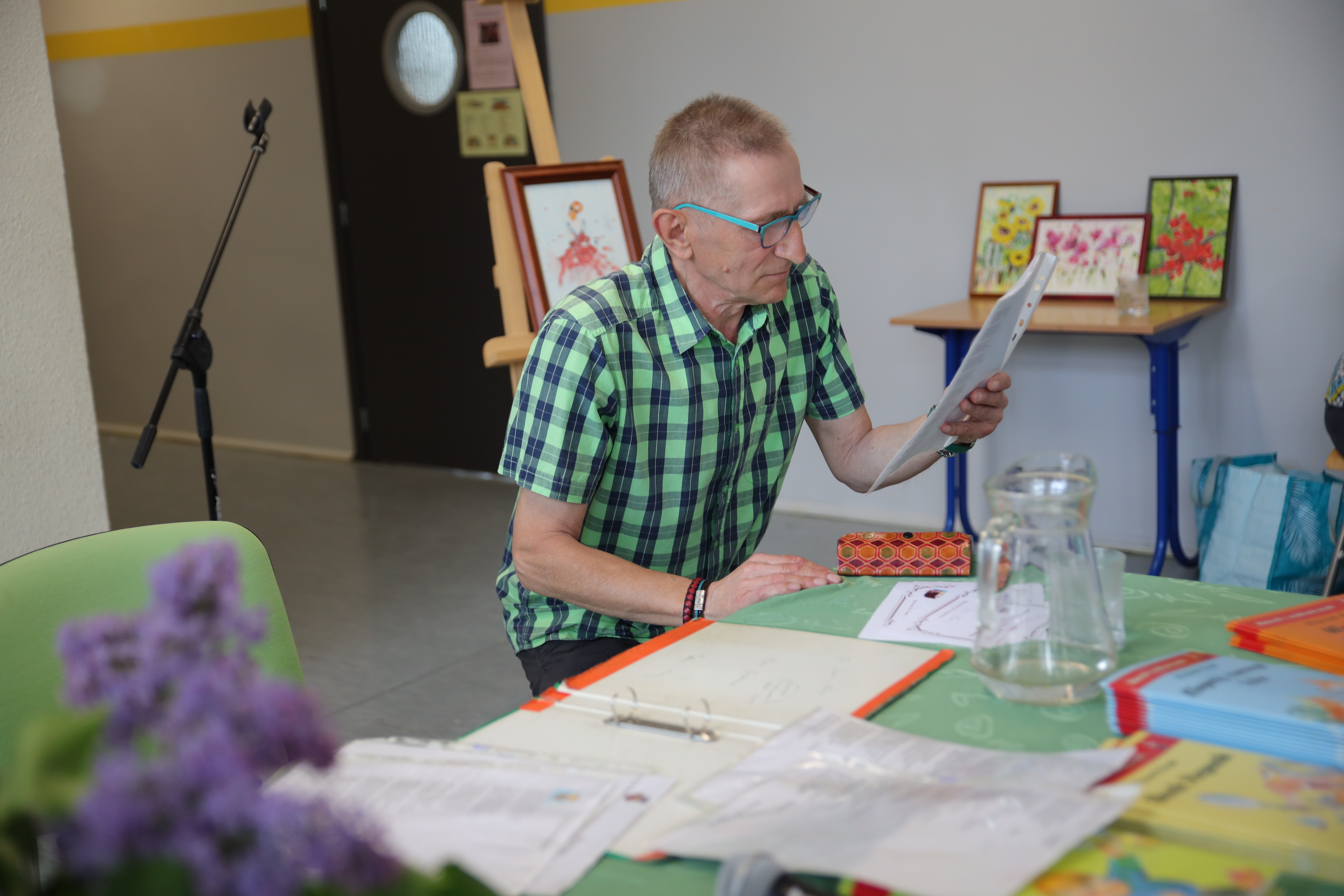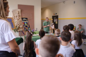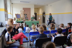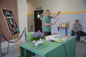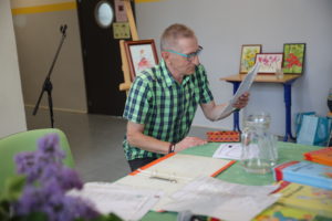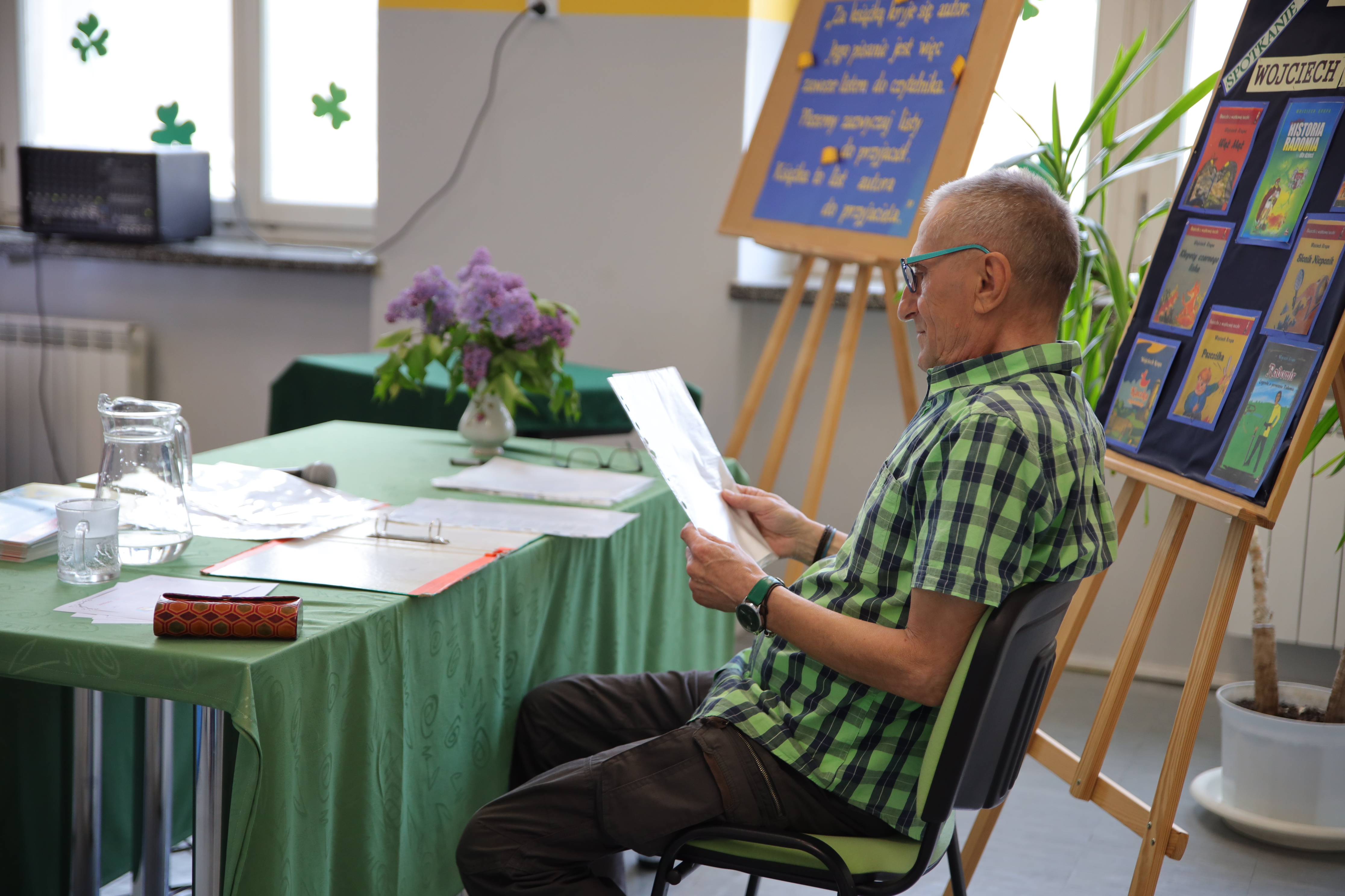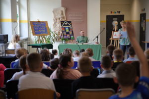 Na jego twórczość literacką składają się, między innymi, takie utwory: „Kłopoty czarnego liska”, „Mąż Wąż”, „Słonik Nicponik”, „Pszczółka”, „Kaczka – legenda iłżecka”, „Radomir – legenda o powstaniu Radomia”, „Historia Radomia dla dzieci”, „Pieśń o Powale”. Pan Wojciech opowiedział, jak zaczęła się jego przygoda z pisaniem oraz skąd czerpie inspiracje do swoich utworów. Autor chętnie odpowiadał też na liczne pytania dzieci, które dotyczyły zarówno jego życia, jak i twórczości.