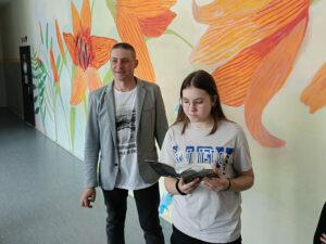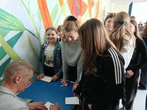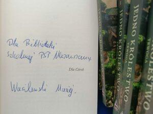 Spotkanie rozpoczęło się od krótkiego wprowadzenia, w którym pan Maciej opowiedział o swojej pracy i o tym, jak zrodziła się jego pasja do pisania. Następnie uczniowie czytali fragmenty książki „Jedno królestwo”. Na koniec pisarz odpowiadał na pytania uczniów. Uczniowie byli bardzo zainteresowani spotkaniem, które trwało ponad 1,5 godziny. Zadawali wiele ciekawych pytań, na które autor chętnie odpowiadał. Pan Maciej dzielił się swoim doświadczeniem pisarza i przekonywał o tym, jak ważne jest czytanie książek, rozwijanie wyobraźni oraz dążenie do celu, mimo krytyki innych osób. Spotkanie zakończyło się rozdaniem autografów i pamiątkowymi zdjęciami. Zachęcam do wypożyczania książek pana Macieja Wasilewskiego, które są już dostępne w bibliotece szkolnej. Posiadamy kilka egzemplarzy pierwszego wydania z podpisem autora, wydanych przez Wydawnictwo Lucky z Radomia.
