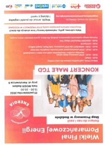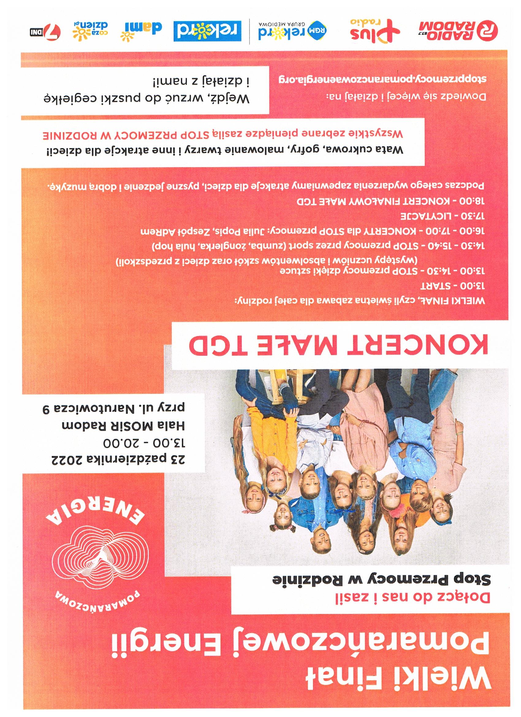 Wielki Finał Pomarańczowej Energii to nie tylko rozstrzygnięcie konkursu plastycznego, ale również doskonała zabawa dla całej rodziny. Przewidziane są zabawy sportowe, taneczne, pyszne jedzenie i dobra muzyka. Finał zakończy koncert zespołu Małe TGD. Zebrane pieniążki podczas uroczystości wspomogą działania na rzecz przeciwdziałania przemocy w rodzinie.