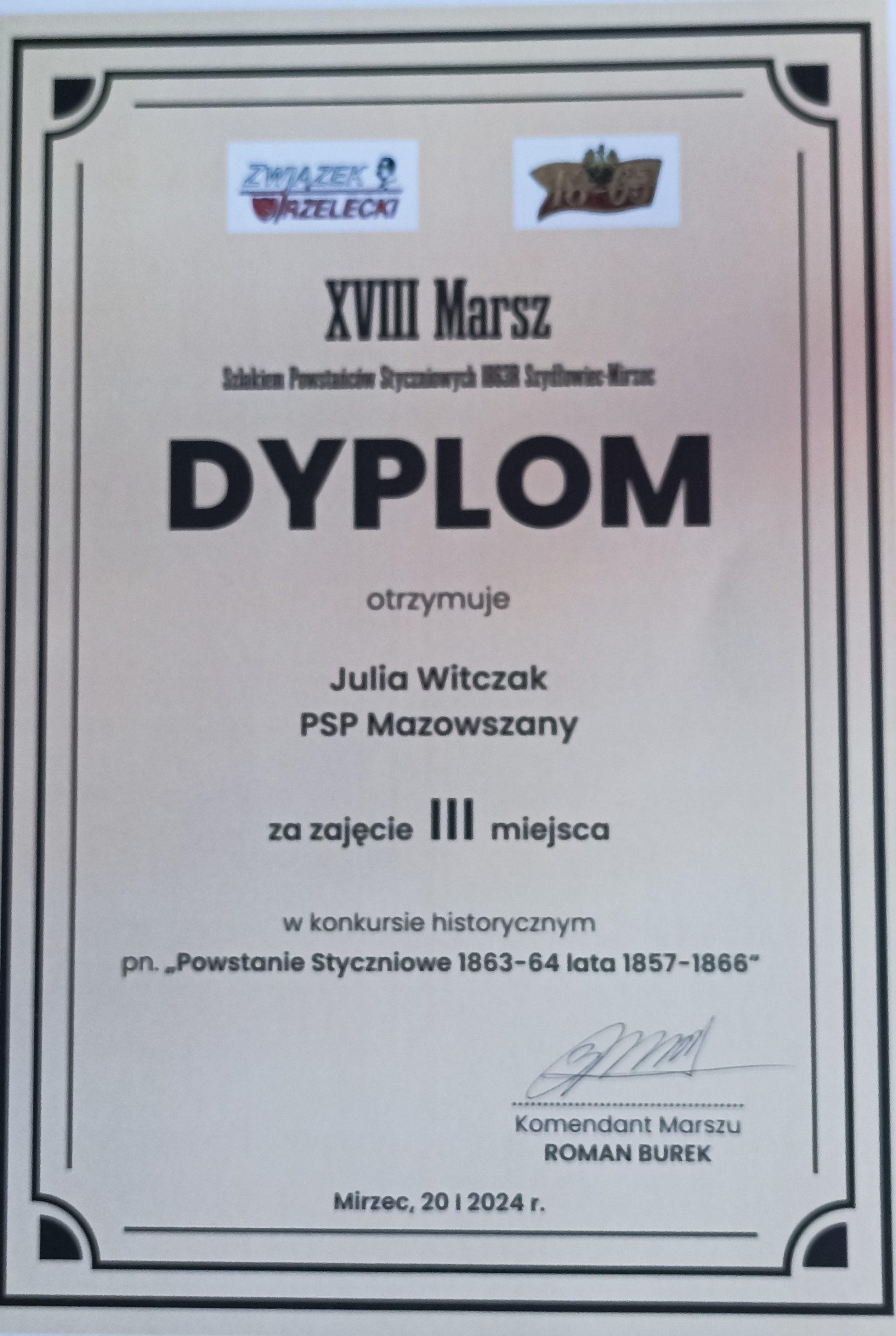 Z przyjemnością informujemy, że Julia Witczak – uczennica klasy 8b – zajęła III miejsce w konkursie historycznym POWSTANIE STYCZNIOWE 1863-64 LATA 1857-1866.Konkurs odbył się ramach wydarzenia „XVIII Marsz Szlakiem Powstańców Styczniowych 1863 r. Szydłowiec – Mirzec” realizowanego przez Związek Strzelecki i skierowany był do uczniów szkół podstawowych w powiatach szydłowieckim, radomskim, skarżyskim i starachowickim.