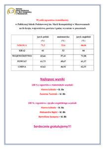 Z dumą informujemy o wynikach naszych uczniów w tegorocznym egzaminie ósmoklasisty. To najlepszy dowód na to, że obrane przez nas metody nauczania mają sens i przynoszą wymierne efekty. Ze wszystkich trzech przedmiotów egzaminacyjnych wyniki Szkoły w Mazowszanach (63%) zdecydowanie przewyższają średnie wyniki gminy, powiatu i kraju, a z języka polskiego nawet województwa. Wierzymy, że nasi wychowankowie będą odnosić sukcesy w wielu obszarach. I niezależnie od tego, jaką życiową ścieżką zdecydują się dalej podążyć, wkroczą na nią z odwagą i wiarą we własne kompetencje. Znakomite rezultaty naszych uczniów są dla nas powodem do dumy. Przede wszystkim jednak cieszy nas to, że wypuszczamy w świat ludzi pewnych swojej wartości, otwartych na zmianę, odważnych, kreatywnych i wrażliwych na otaczającą ich rzeczywistość.
