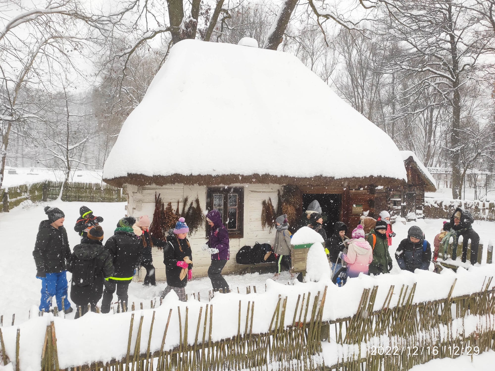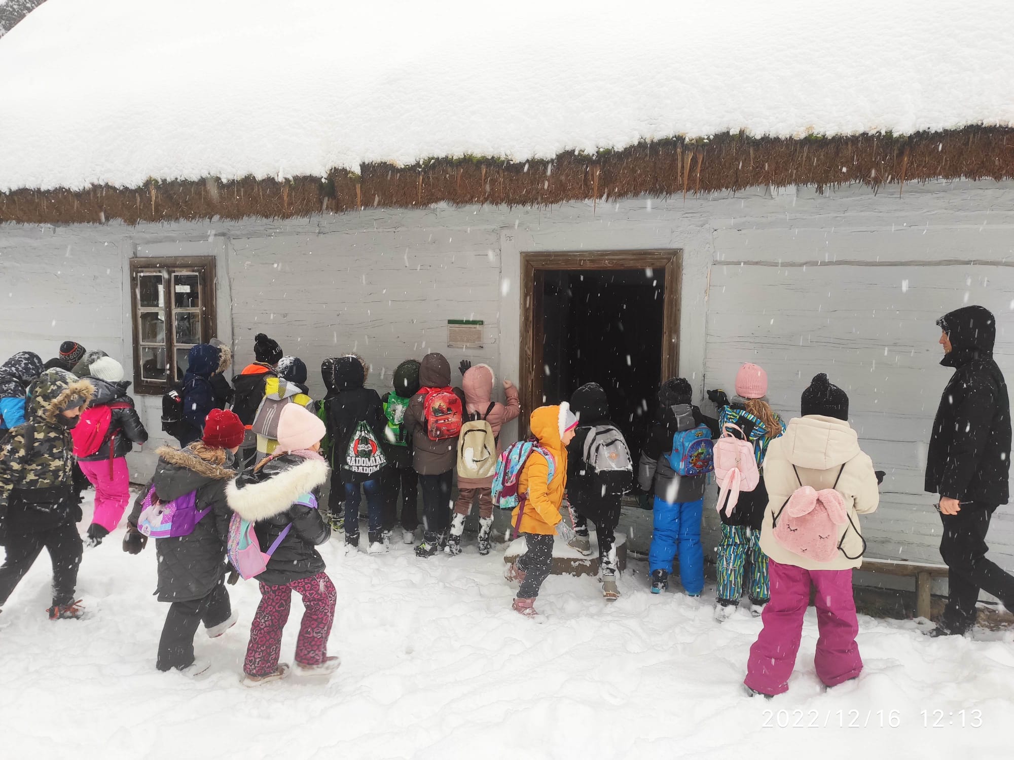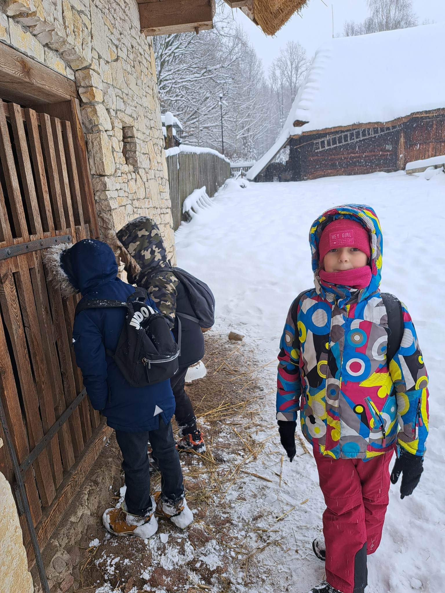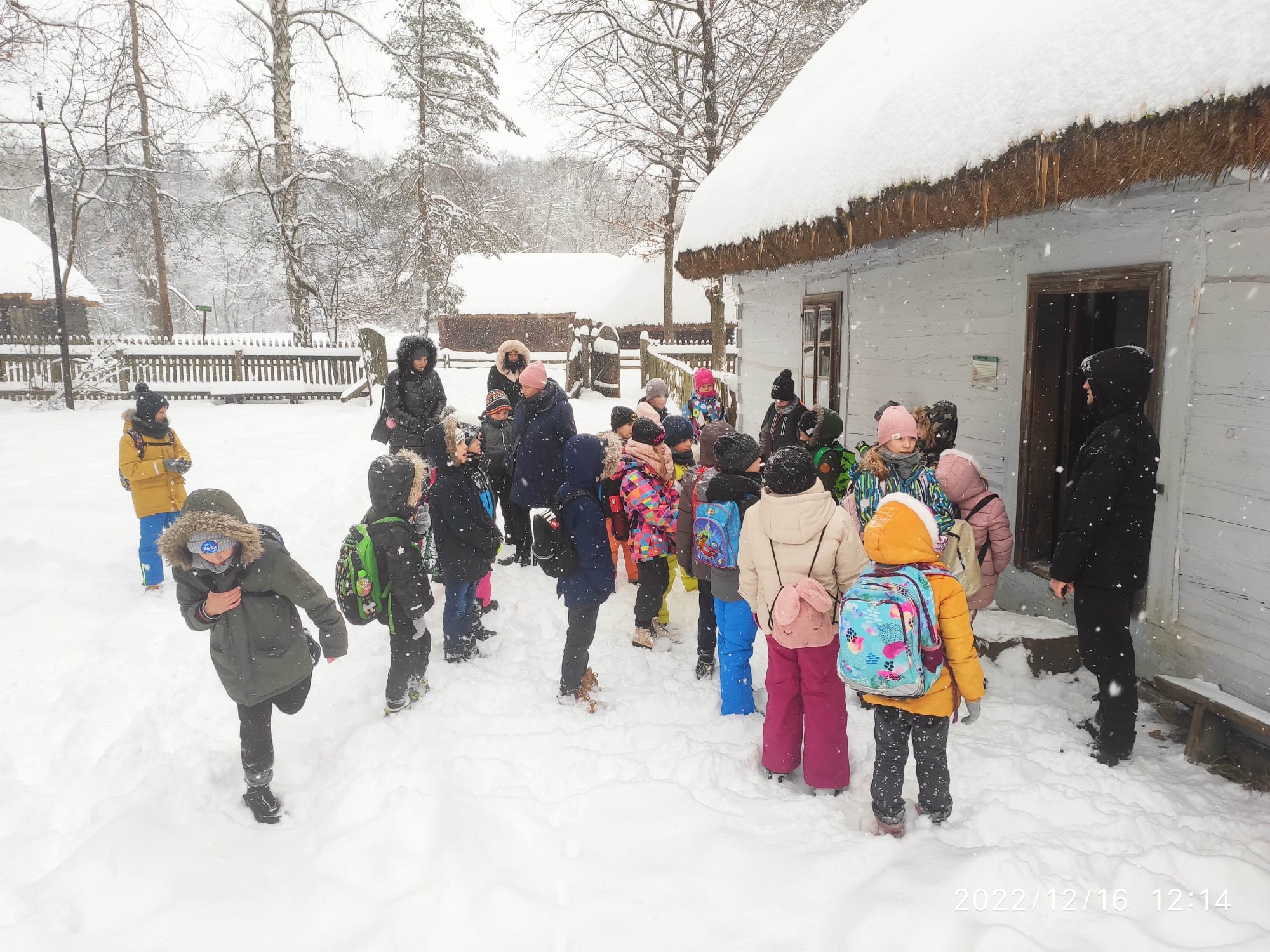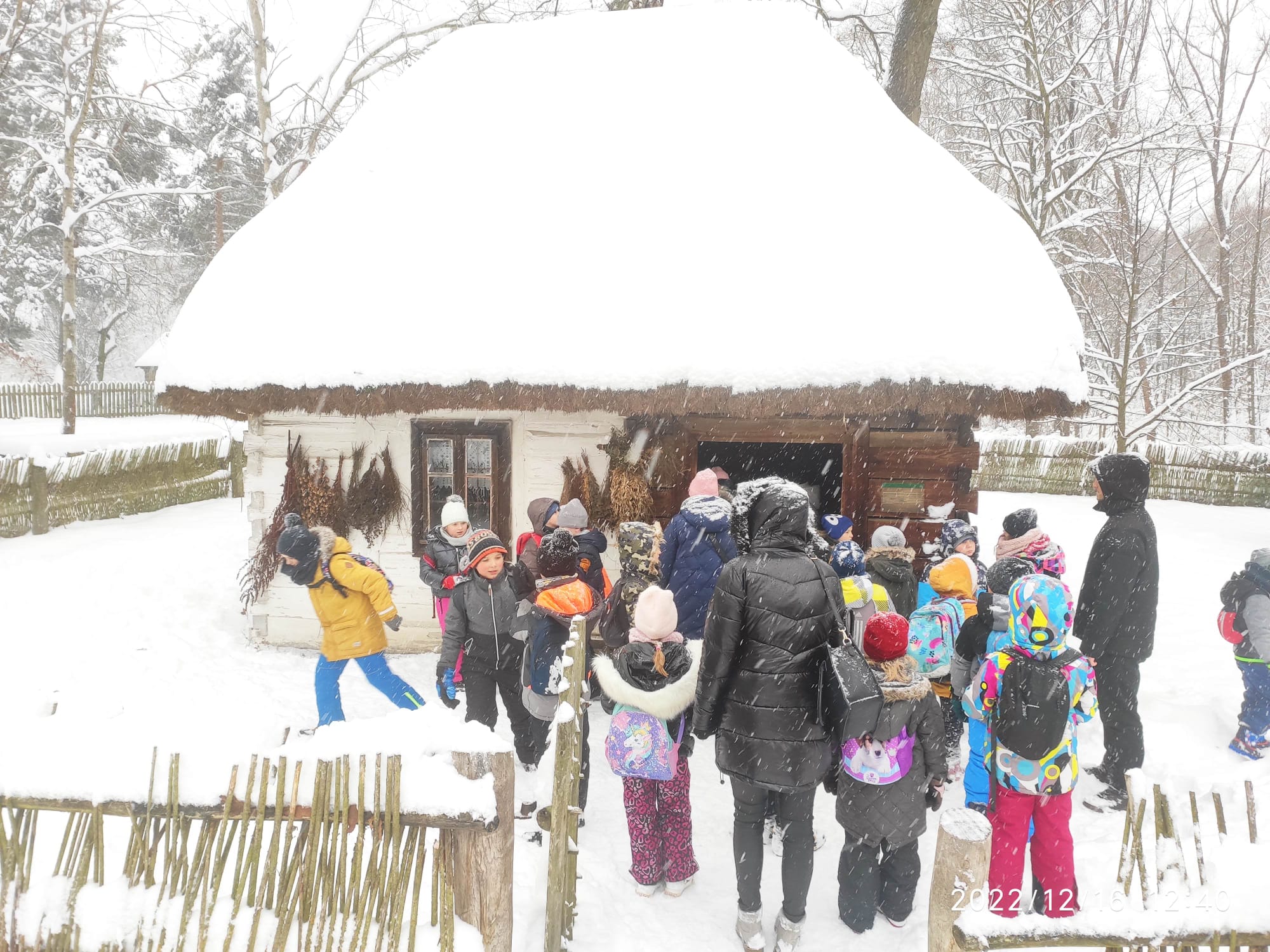 Uczniowie klasy 2a, 2b, 3a i 3b wzięli udział w wycieczce do Muzeum Wsi Radomskiej. Program wycieczki obejmował lekcję warsztatową „Wigilia i Boże Narodzenie” oraz zwiedzanie skansenu pod opieką przewodnika. Uczniowie poznali tradycje związane z czasem adwentu oraz Świąt Bożego Narodzenia. W ramach lekcji odbyły się również zajęcia plastyczne, których celem było wykonanie tradycyjnej ozdoby choinkowej- papierowego kogucika na wydmuszce jajka. Wszyscy świetnie poradzili sobie z tym zadaniem, a przy tym bardzo dobrze się bawili. Kolejnym punktem wycieczki był spacer po zaśnieżonym skansenie. Przewodnik w ciekawy sposób opowiadał o dawnym życiu codziennym i zwyczajach świątecznych na radomskiej wsi. W zabudowaniach gospodarskich i domostwach, uczniowie uzupełnili swoją wiedzę o tradycjach bożonarodzeniowych. To był bardzo udany dzień!