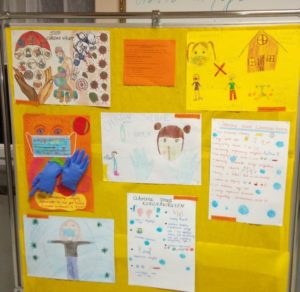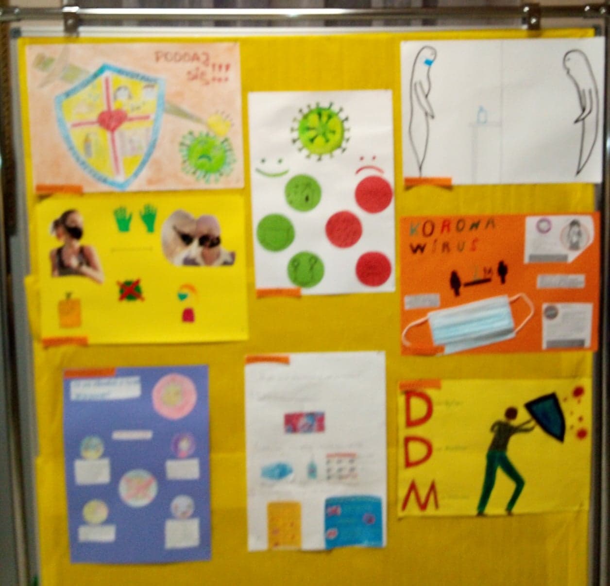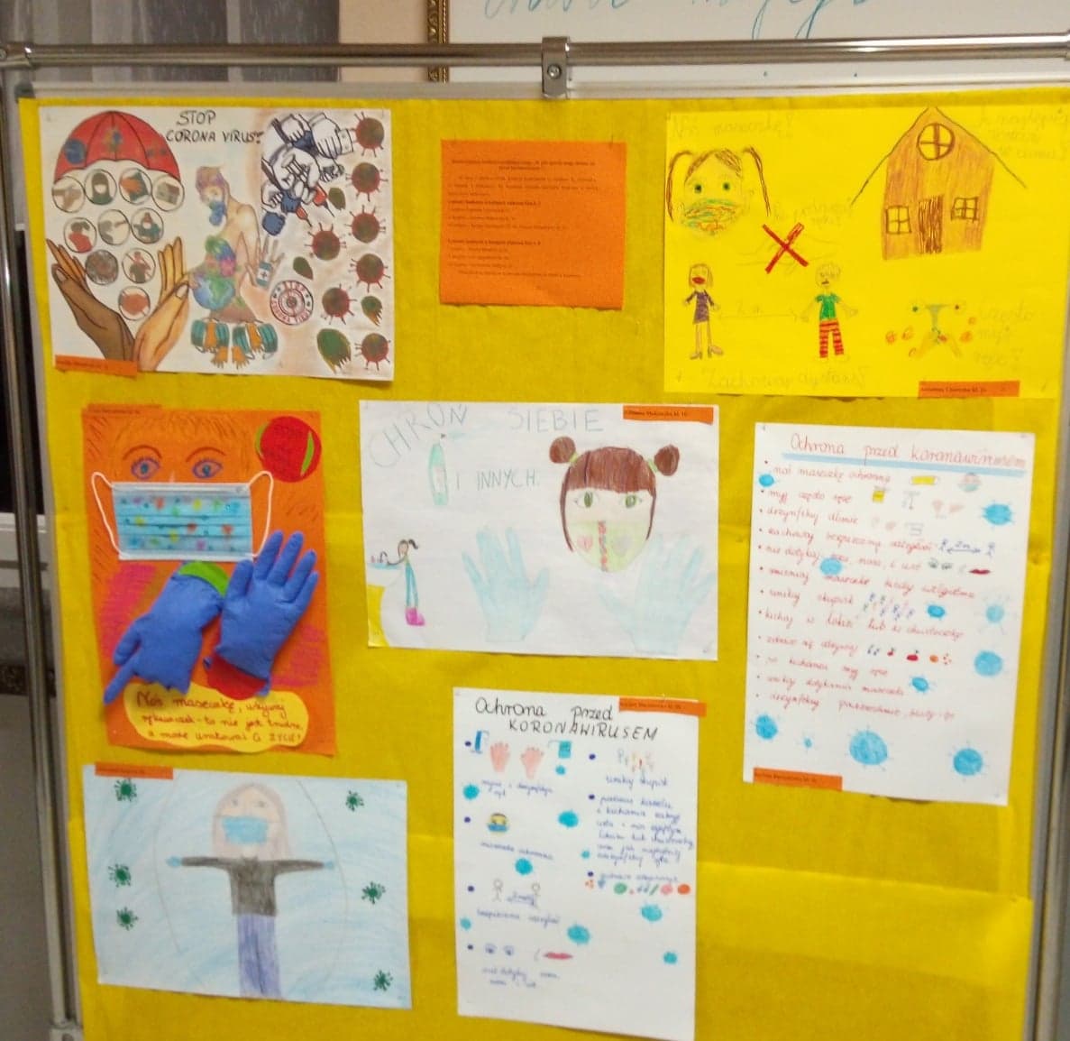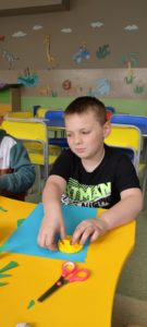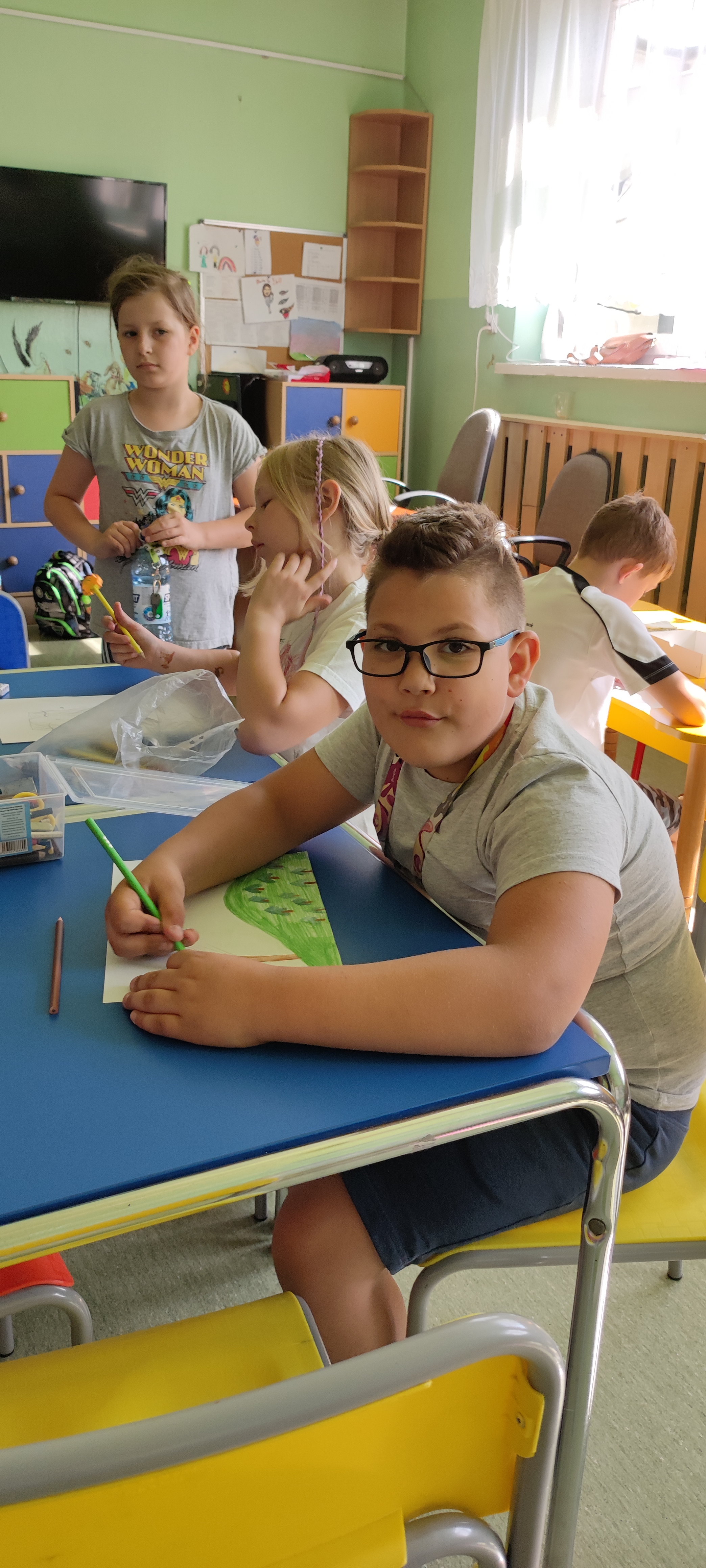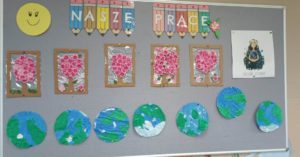 Podsumowaniem zajęć było wykonanie gazetki świetlicowej o tematyce ekologicznej. Nie mogło zabraknąć też wspólnych zdjęć z naszymi pracami, które zostały zaprezentowane na korytarzu.