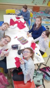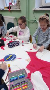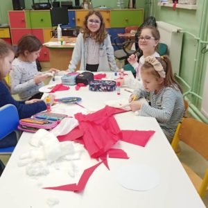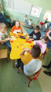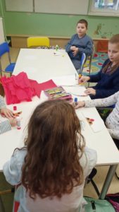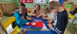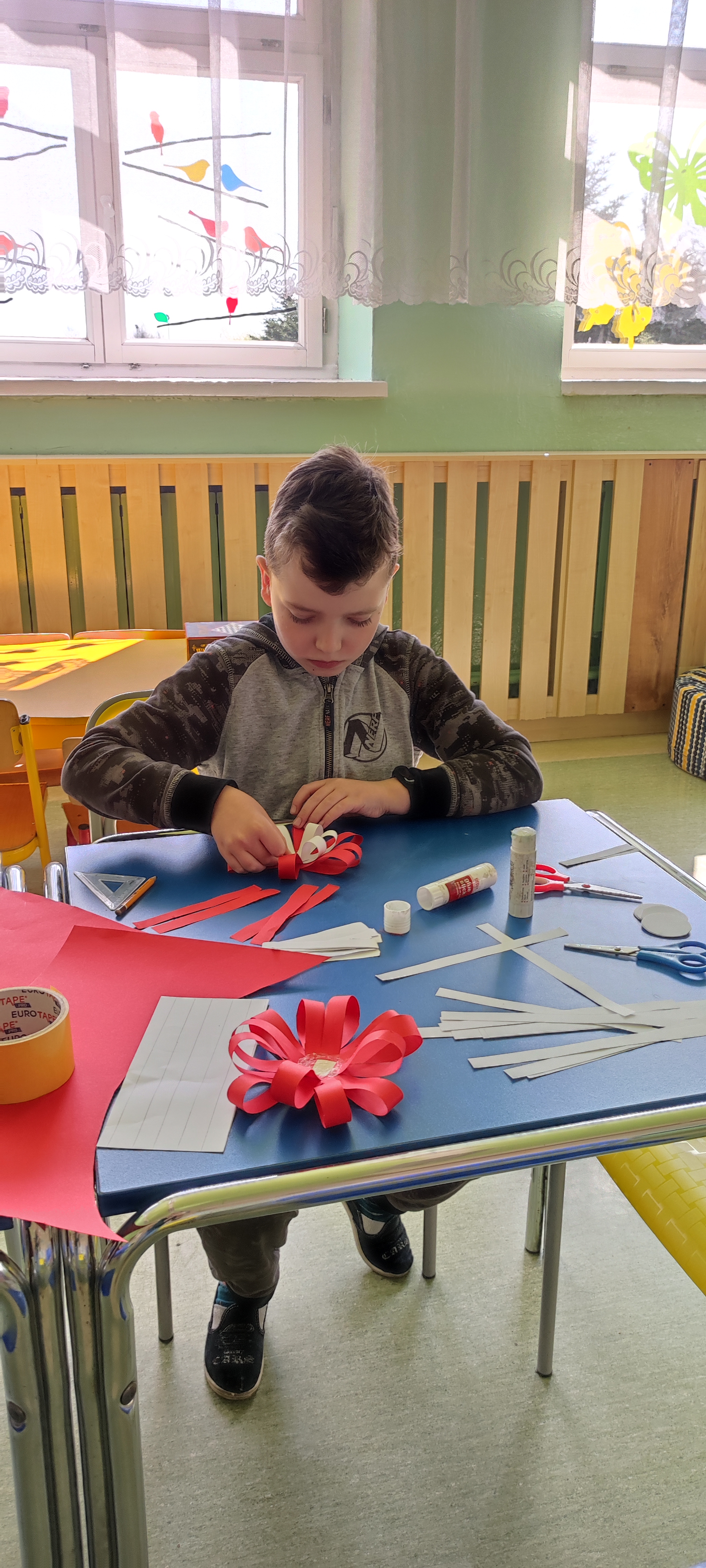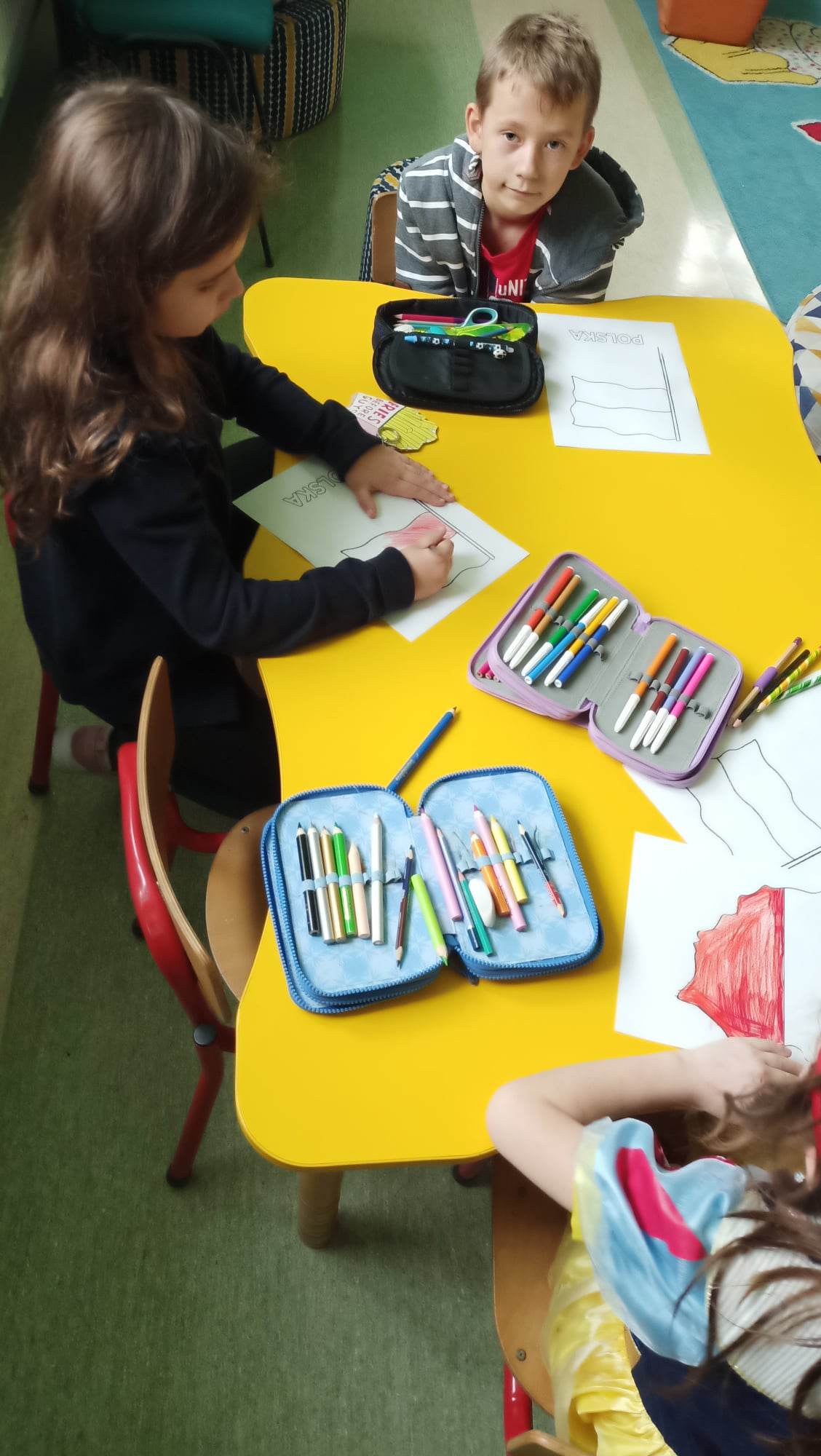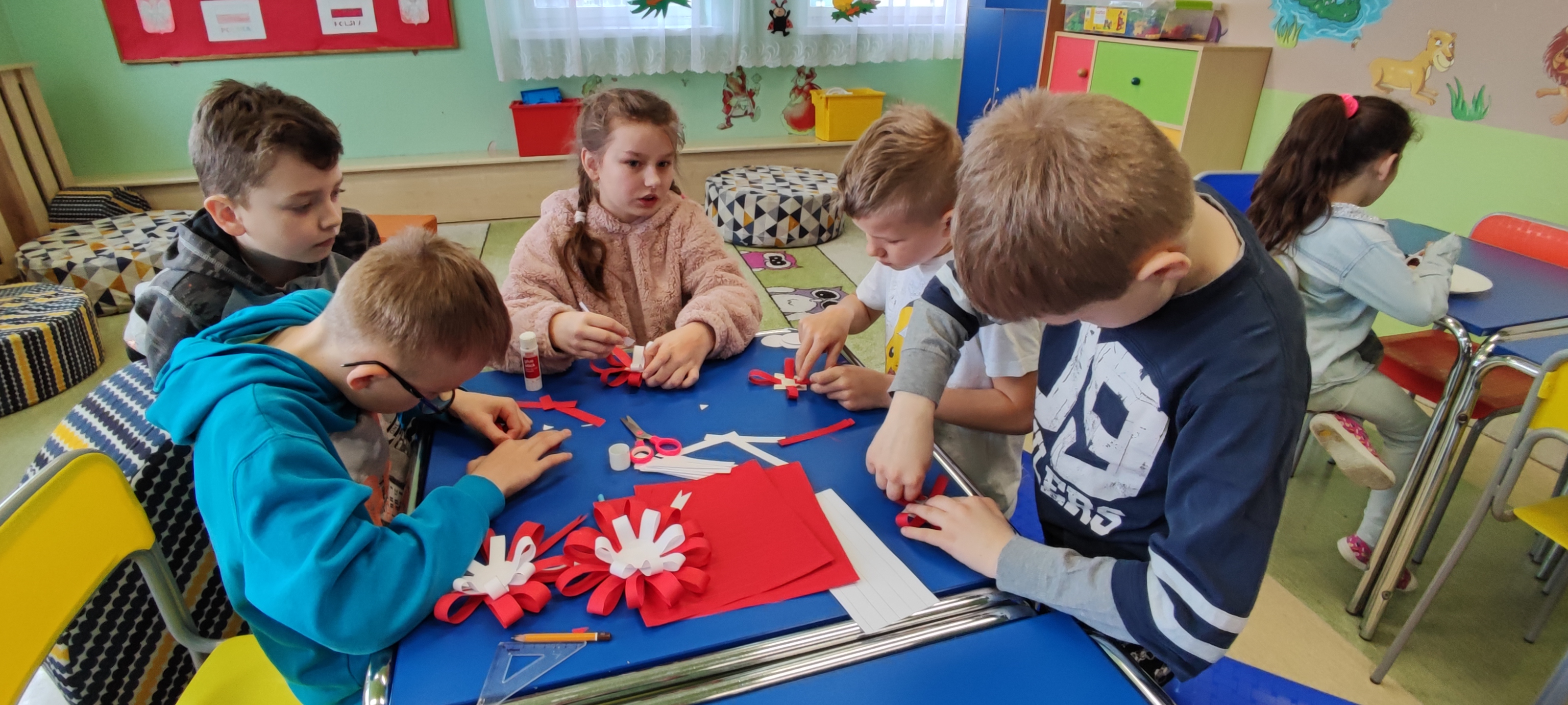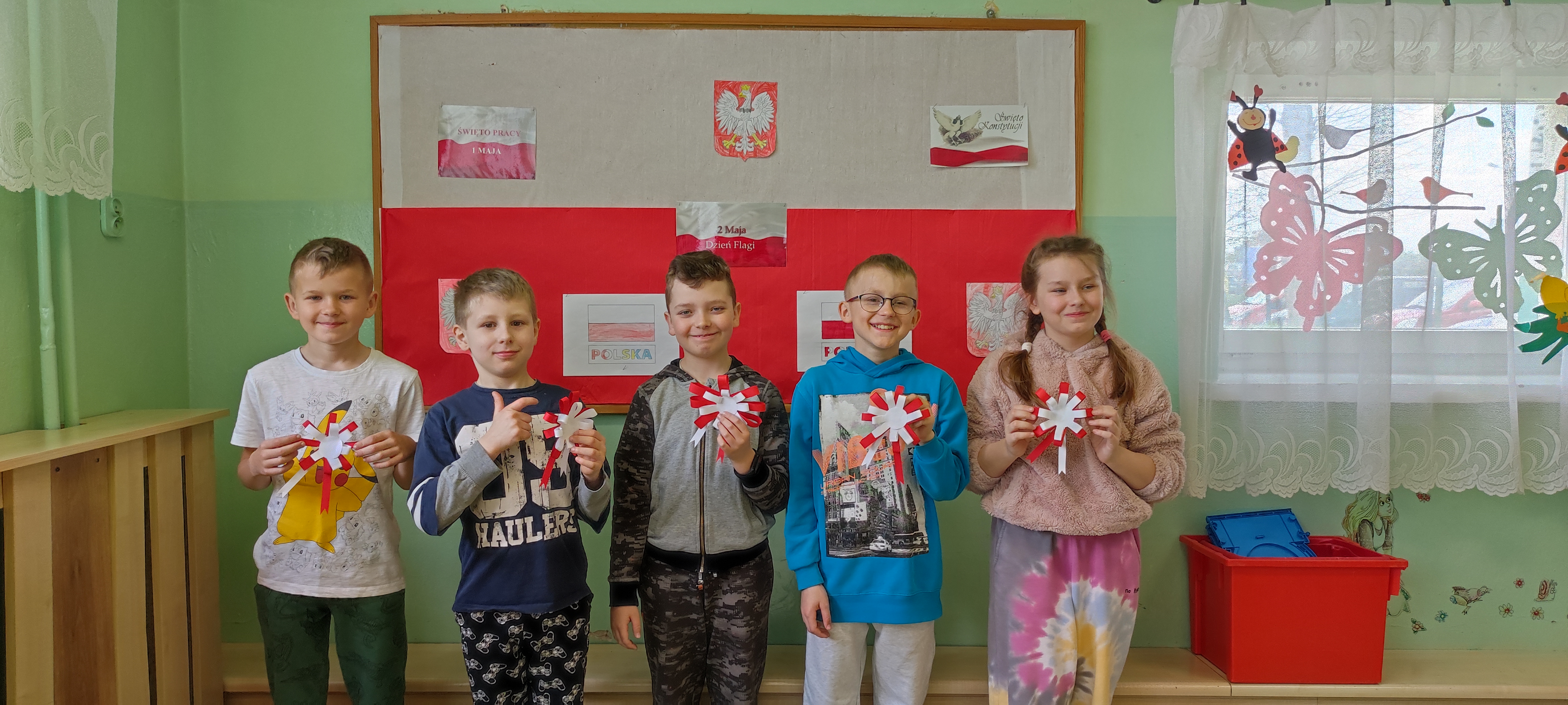 Dzieci w świetlicy szkolnej przygotowywały się do majowych świąt wyszukując w różnych książkach i w Internecie informacji na temat Święta Pracy, Dnia Flagi i Konstytucji 3 Maja. Rozwiązywały krzyżówki i rebusy, kolorowały tematyczne obrazki, wykonały okolicznościowe kotyliony i chorągiewki.