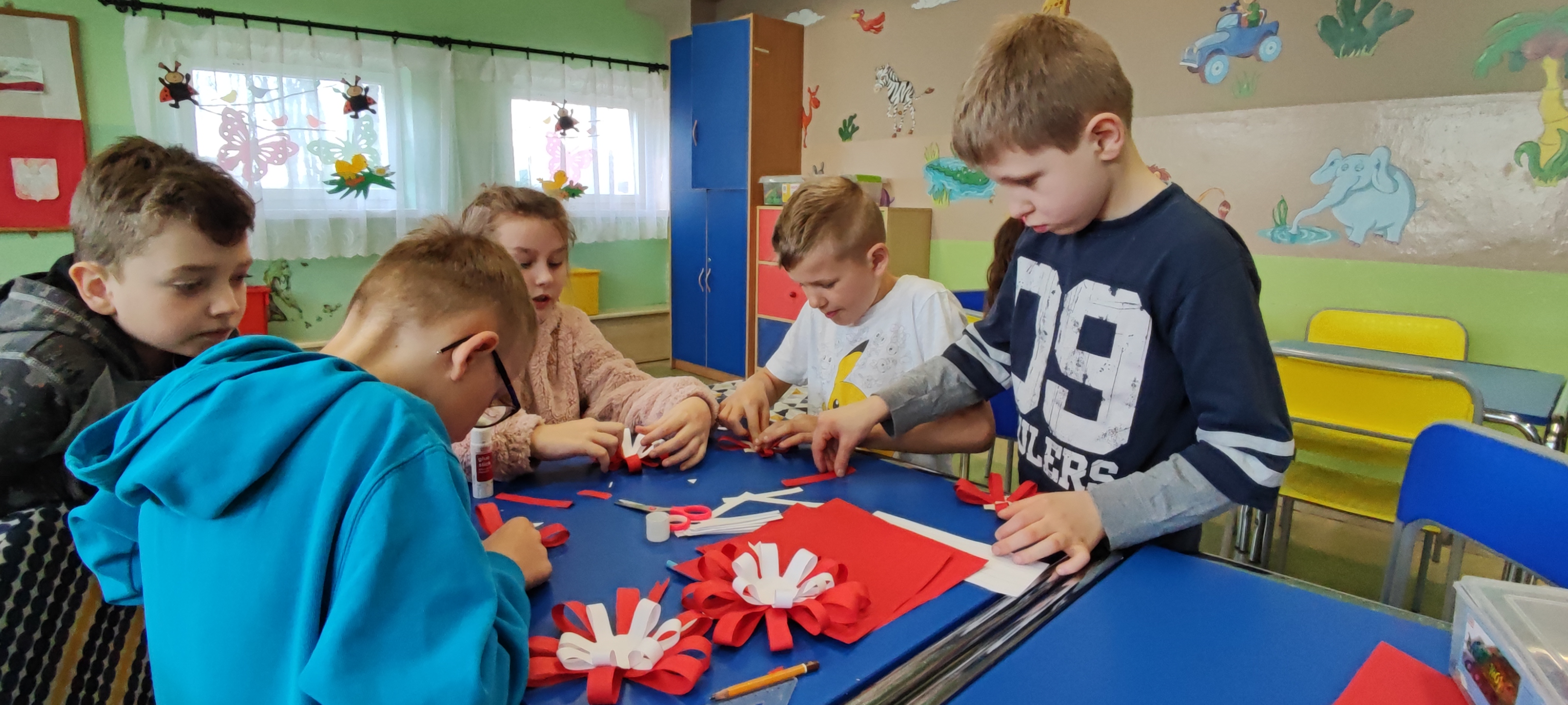 11 listopada to dla nas Polaków jedna z najważniejszych dat w historii. Uczniowie uczęszczający do świetlicy szkolnej przez cały tydzień przygotowywali się do uczczenia Święta Niepodległości. W czasie zajęć tematycznych dzieci poznawały historię Polski poprzez legendy o powstaniu naszego państwa oraz zapoznawały się z sylwetkami ważnych postaci historycznych. Podczas zajęć plastycznych dzieci wykonywały prace dotyczące symboli naszej państwowości, m.in. biało-czerwone flagi , godła z białym orłem w koronie oraz piękne kotyliony.
