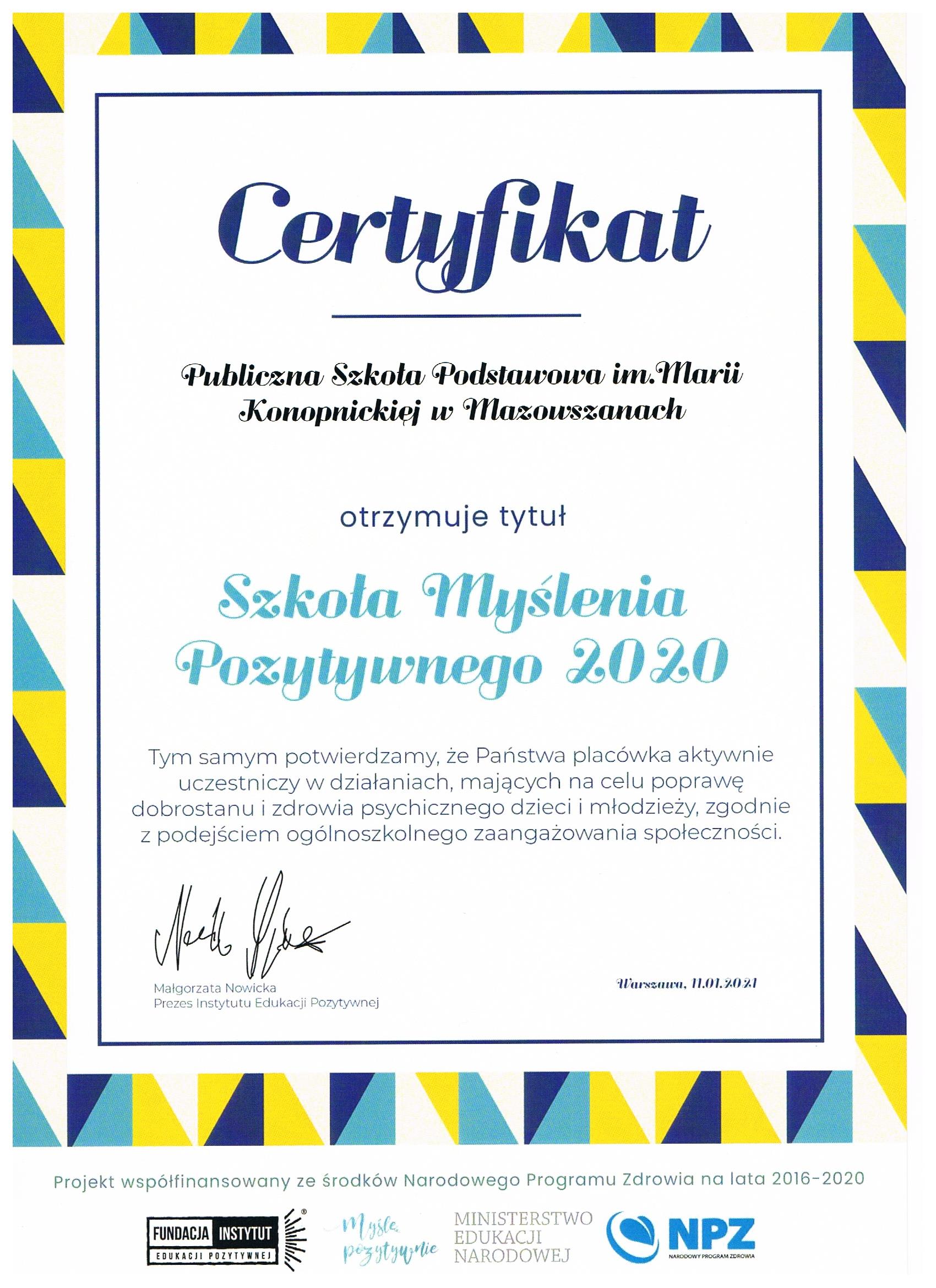 Od 1 stycznia 2020 do 31 grudnia 2020 nasza szkoła po raz kolejny brała udział w programie certyfikacyjnym „Szkoła Myślenia Pozytywnego”. Program ten realizowany był w ramach projektu „Myślę pozytywnie”, współfinansowanego ze środków Narodowego Programu Zdrowia na lata 2016 – 2020 na zlecenie Ministerstwa Edukacji Narodowej.