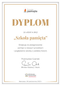 Nasza szkoła po raz kolejny włączyła się w akcję zorganizowaną przez Ministerstwo Edukacji i Nauki Szkoła Pamięta.  Celem tej inicjatywy jest zwrócenie uwagi młodych ludzi na potrzebę pielęgnowania pamięci o zmarłych, a także o historii i bohaterach naszego kraju oraz regionu.