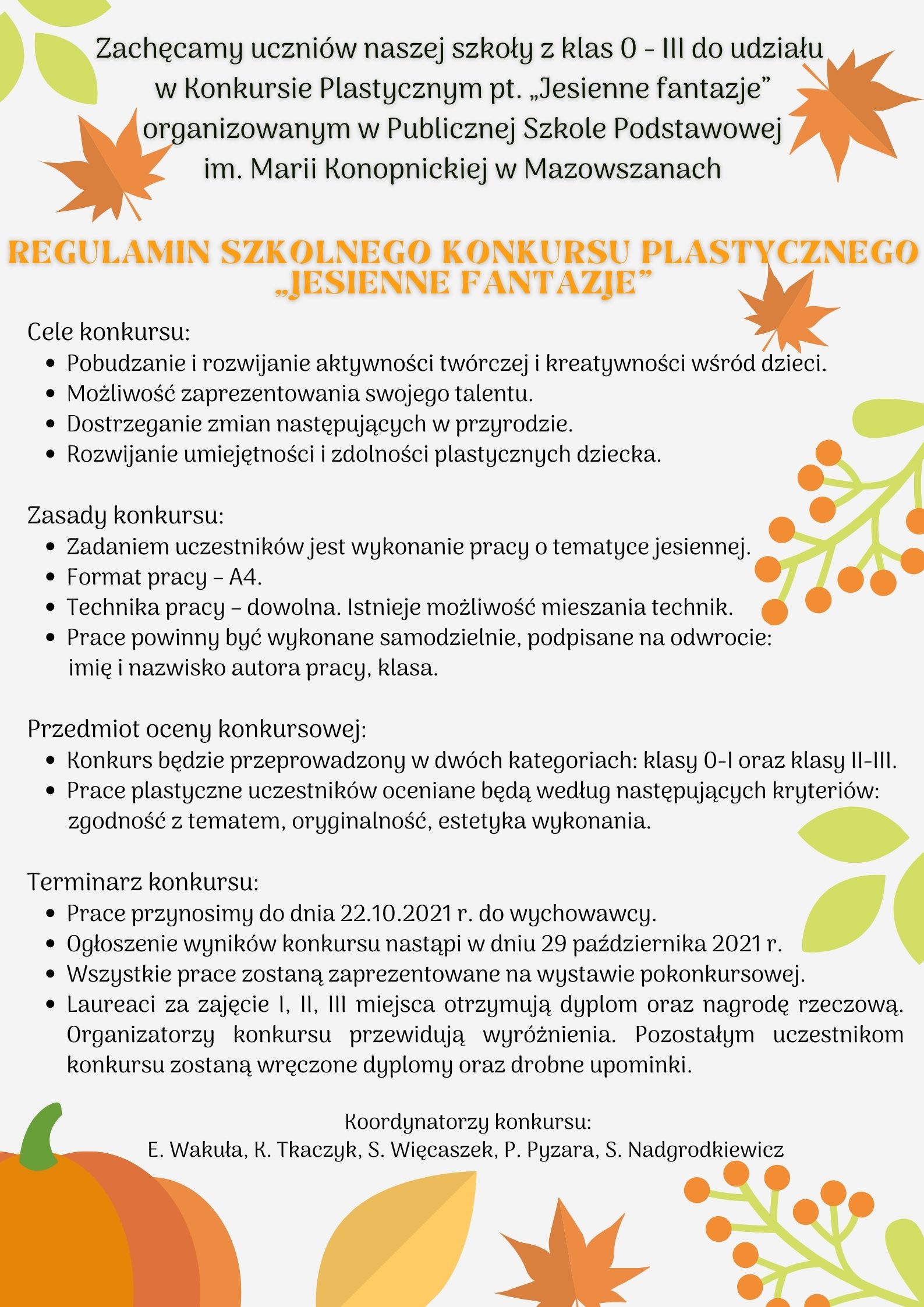 Zachęcamy uczniów naszej szkoły z klas 0 – III do udziału w Konkursie Plastycznym pt. „Jesienne fantazje” organizowanym w Publicznej Szkole Podstawowej im. Marii Konopnickiej w Mazowszanach.
