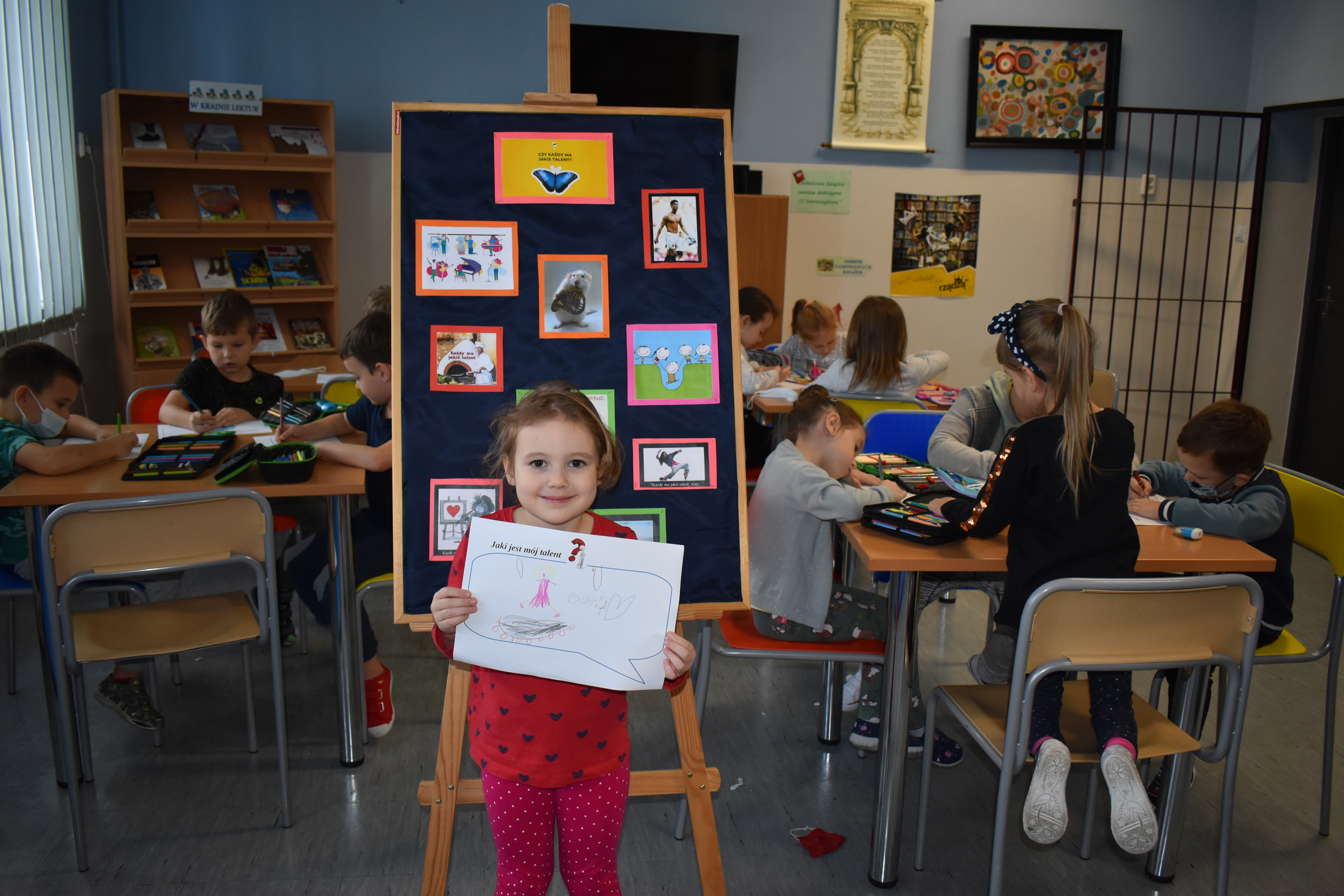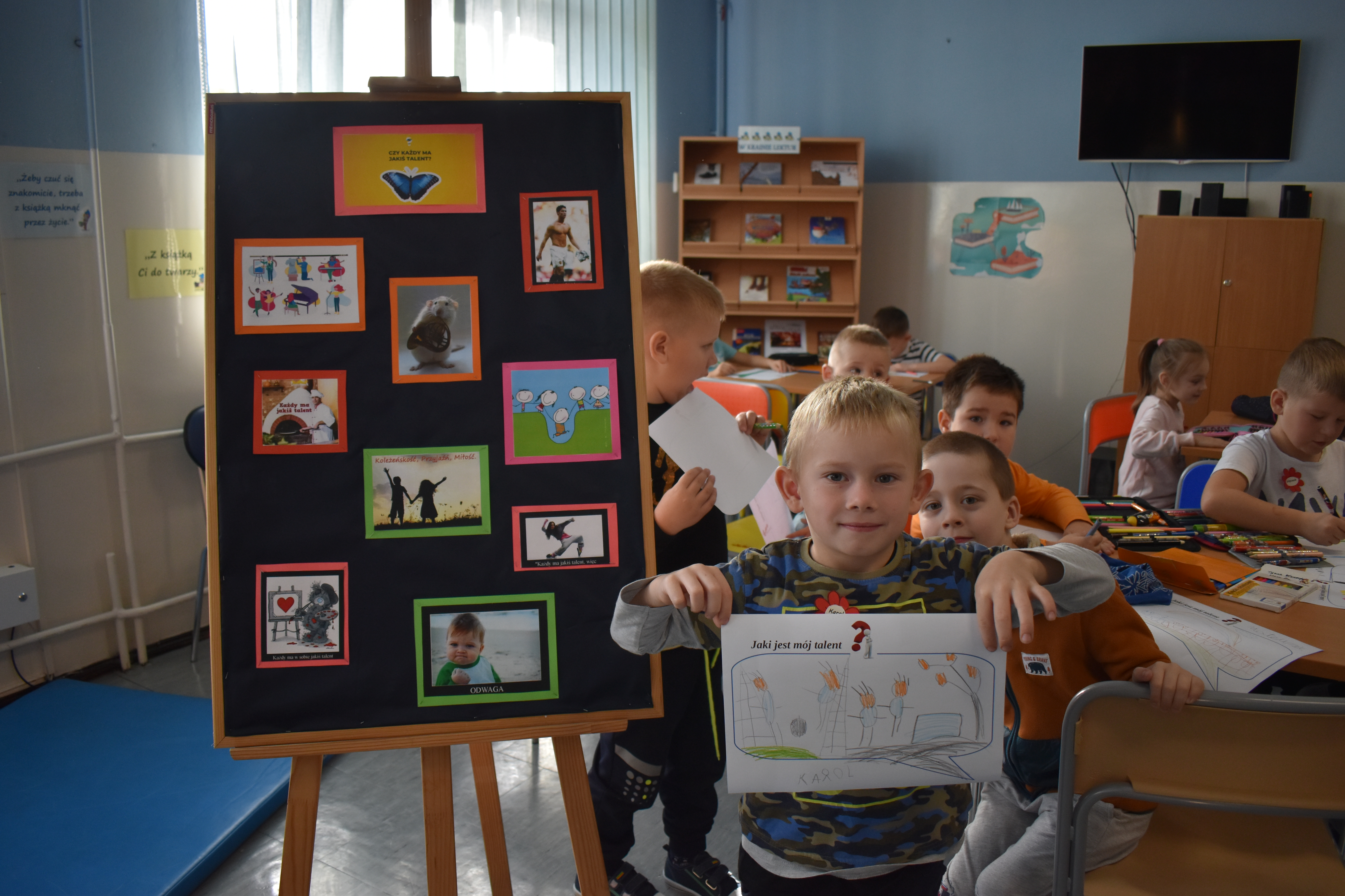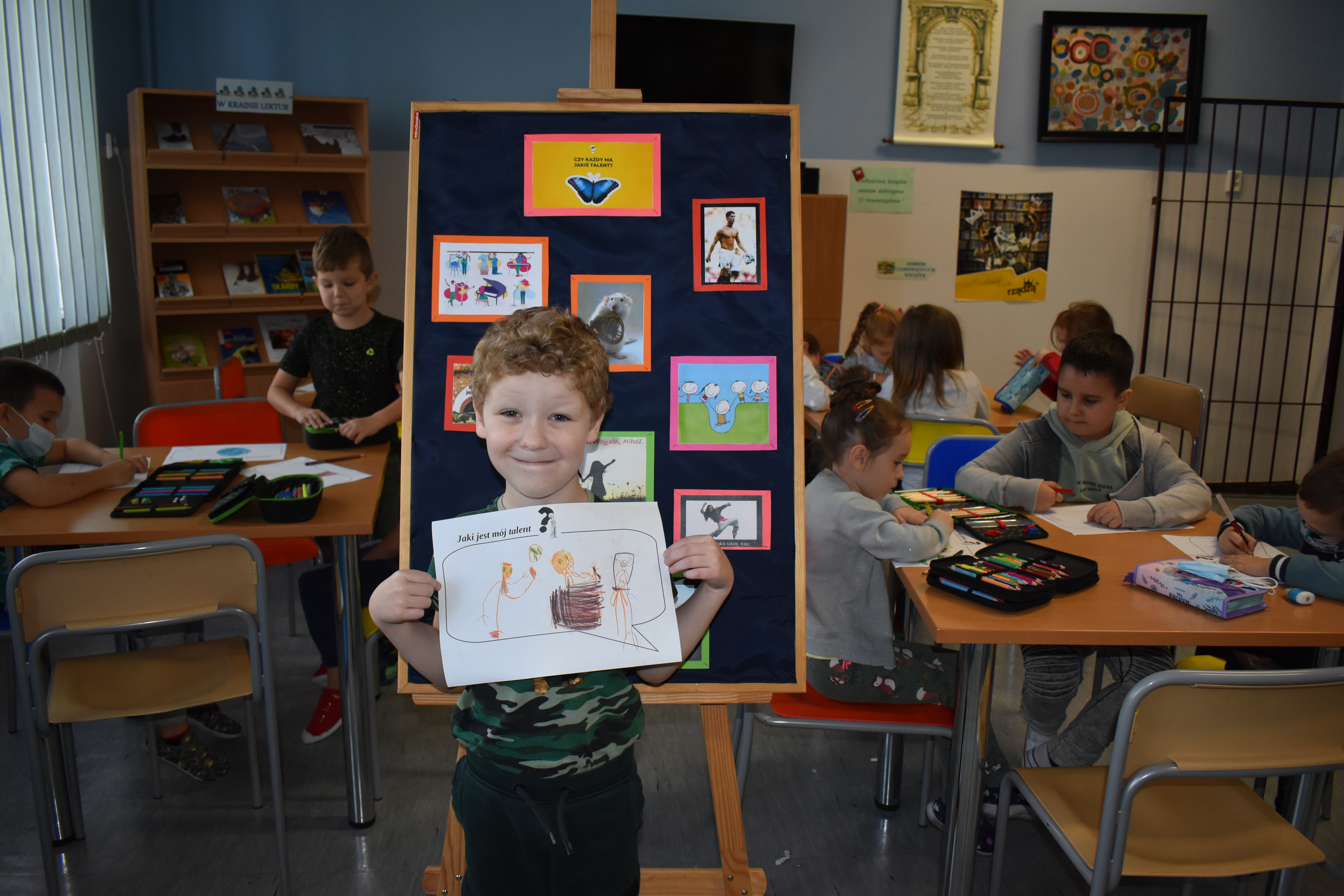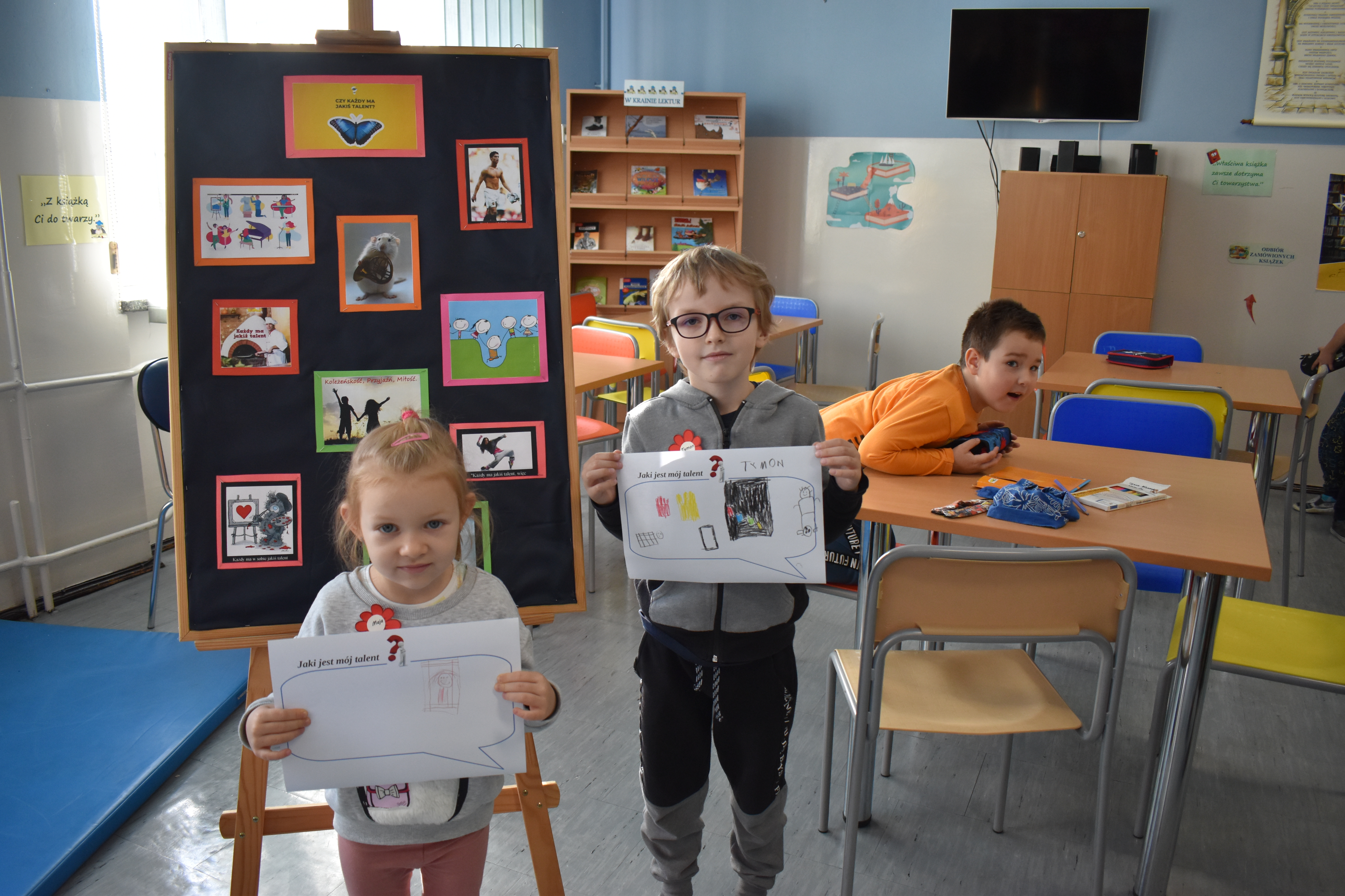 Podczas pierwszego spotkania, które odbyło się w bibliotece, dzieci miały możliwość rozmowy o talentach, jakie ma każdy z nas. Opowiedziały o swoich zdolnościach, umiejętnościach i swoich mocnych stronach. Wysłuchały bajeczki terapeutycznej – „Nie potrafię” i narysowały ilustracje prezentujące ich „talenty” lub mocne strony. Przygotowane przez dzieci prace plastyczne znalazły się na wystawie bibliotecznej.