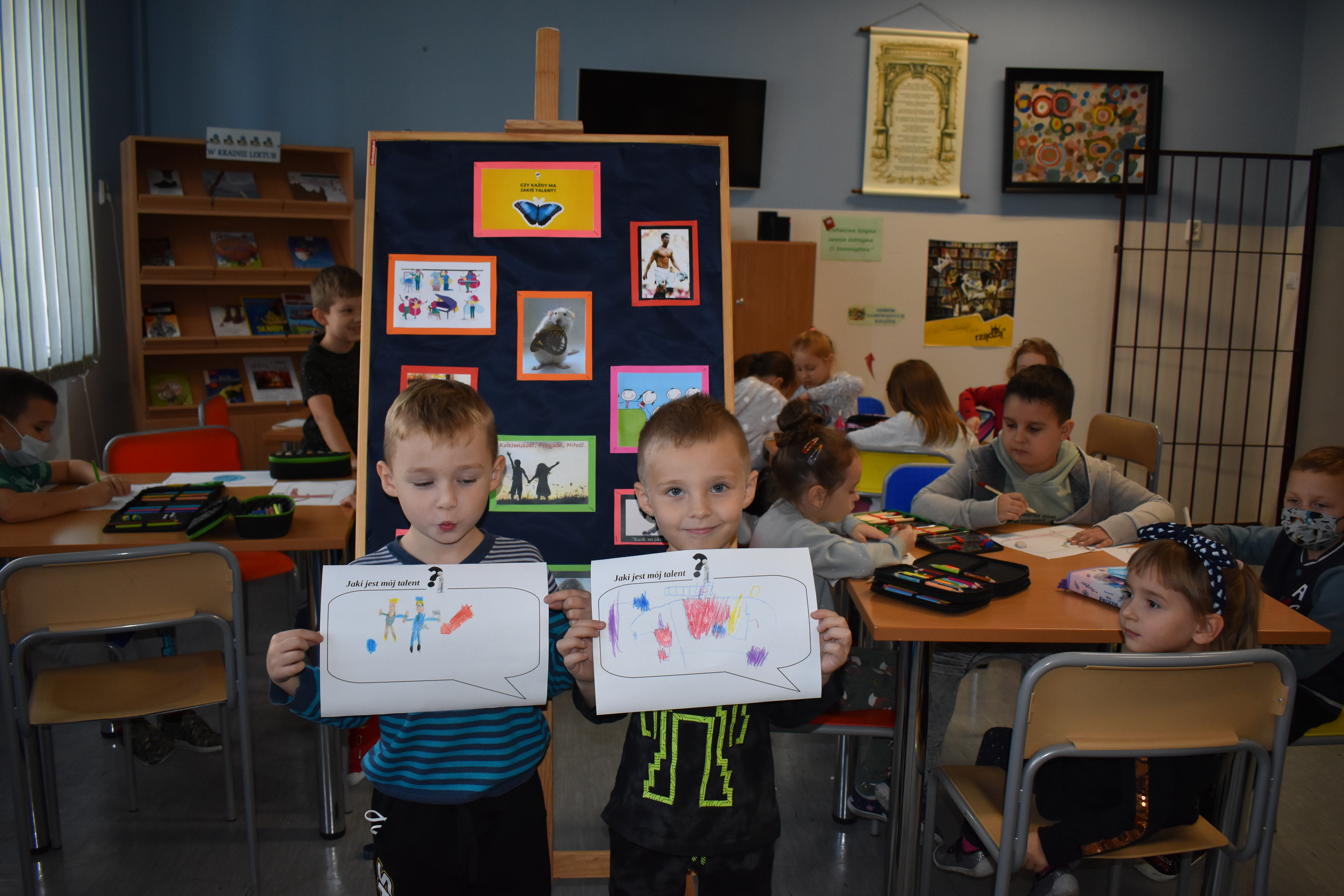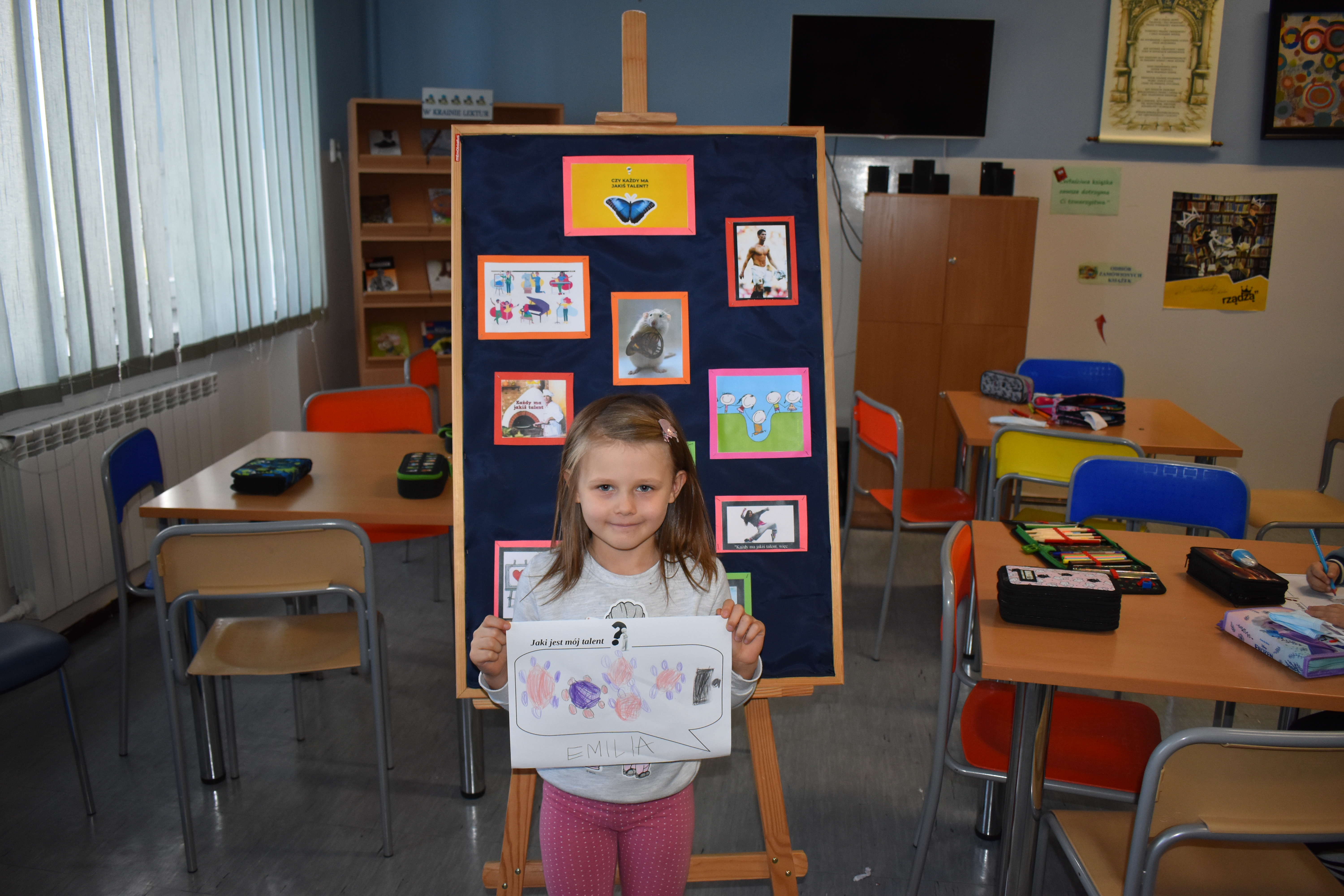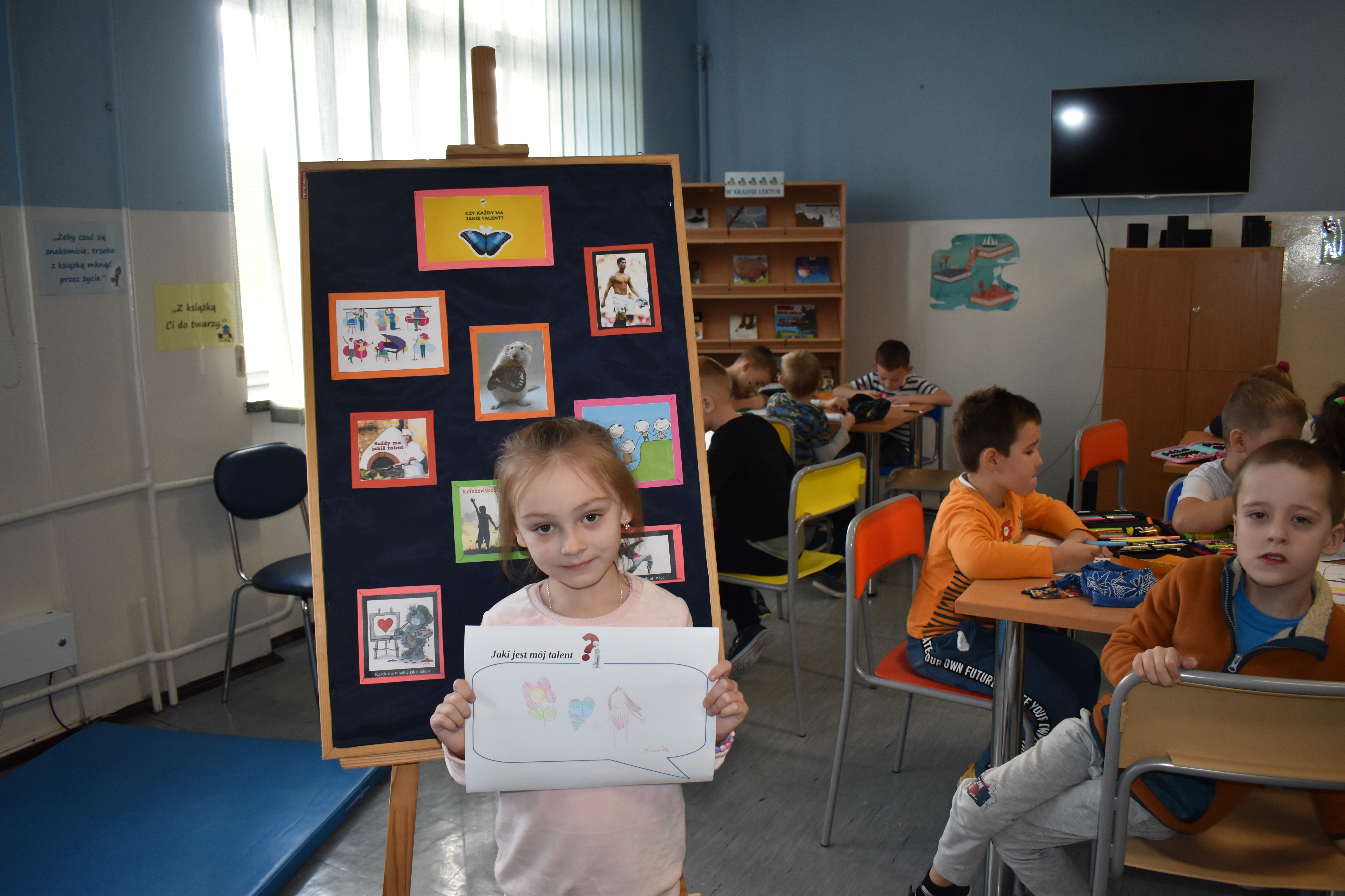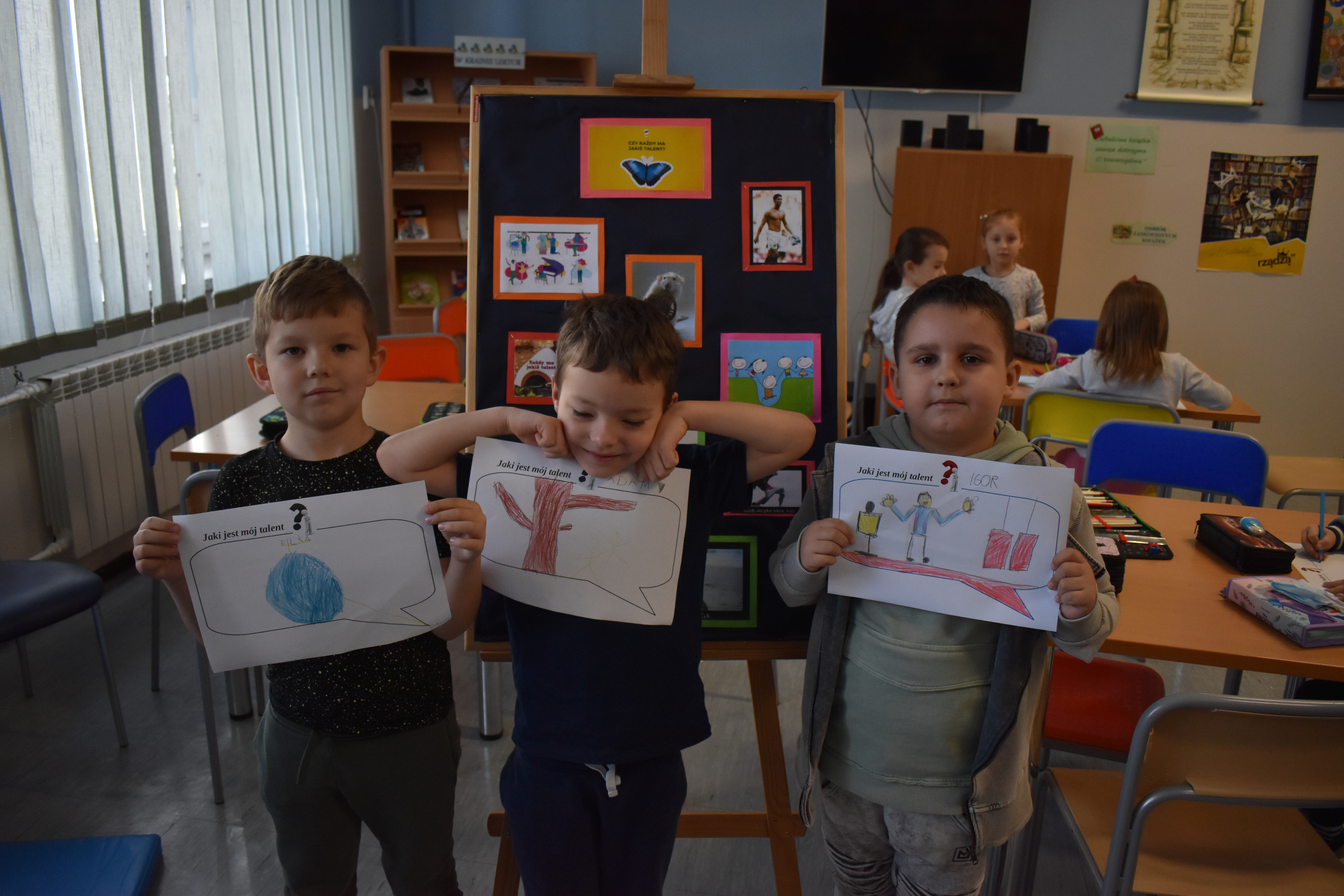 Podczas pierwszego spotkania, które odbyło się w bibliotece, dzieci miały możliwość rozmowy o talentach, jakie ma każdy z nas. Opowiedziały o swoich zdolnościach, umiejętnościach i swoich mocnych stronach. Wysłuchały bajeczki terapeutycznej – „Nie potrafię” i narysowały ilustracje prezentujące ich „talenty” lub mocne strony. Przygotowane przez dzieci prace plastyczne znalazły się na wystawie bibliotecznej.