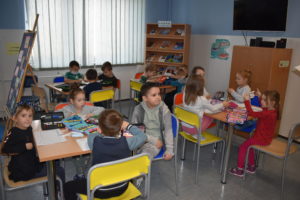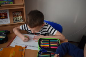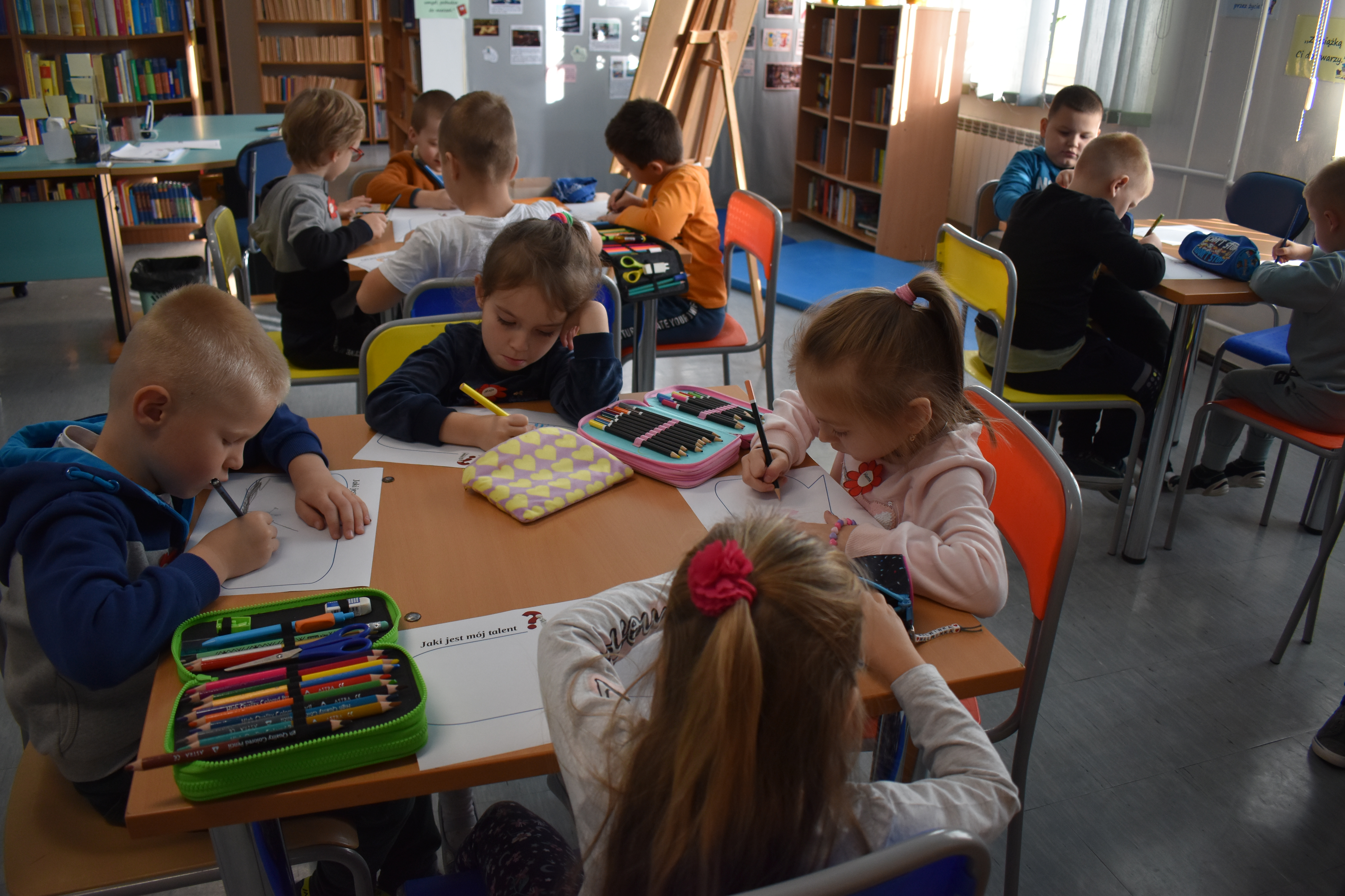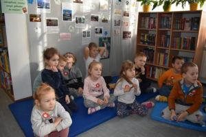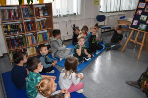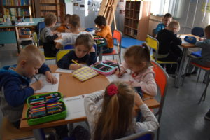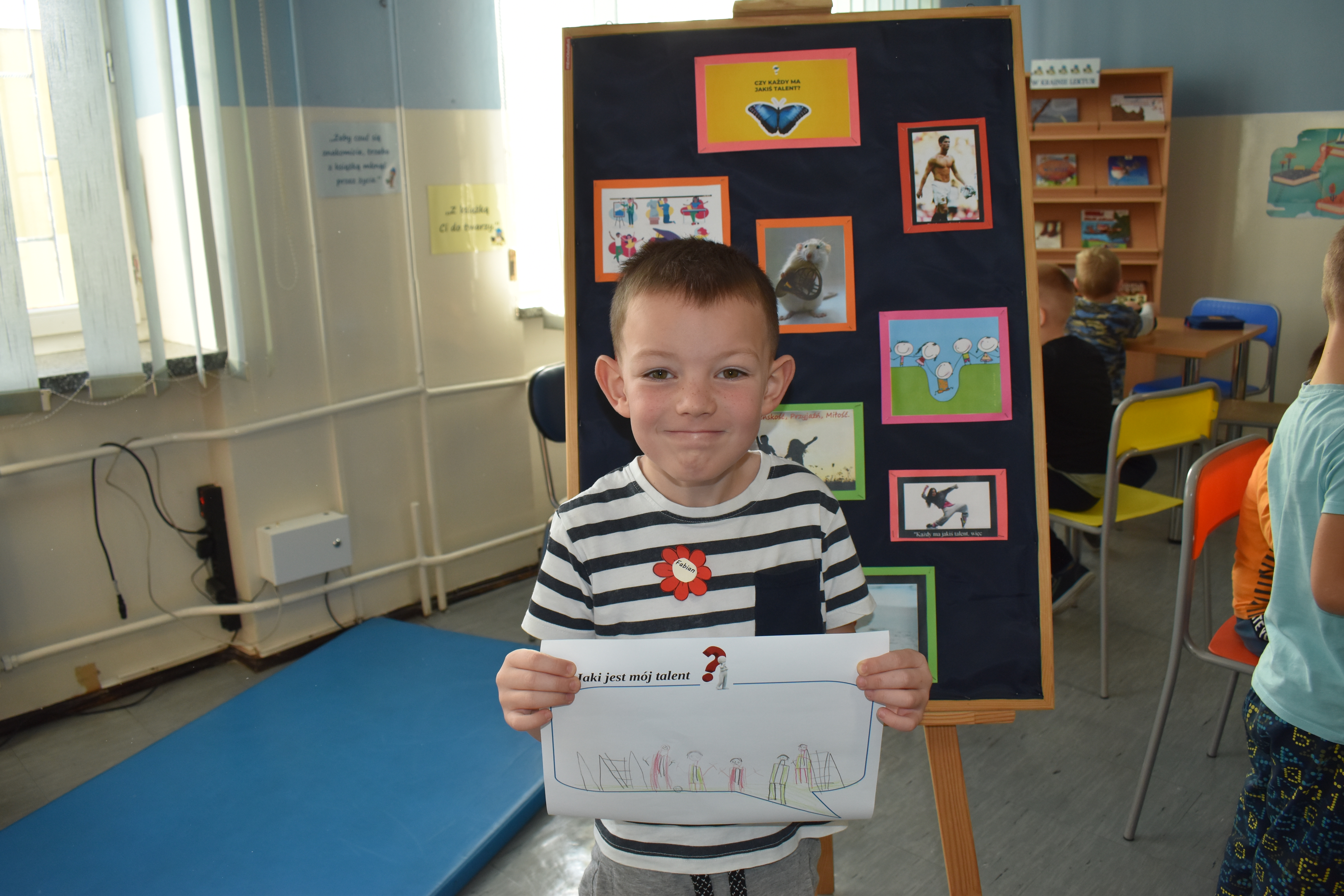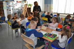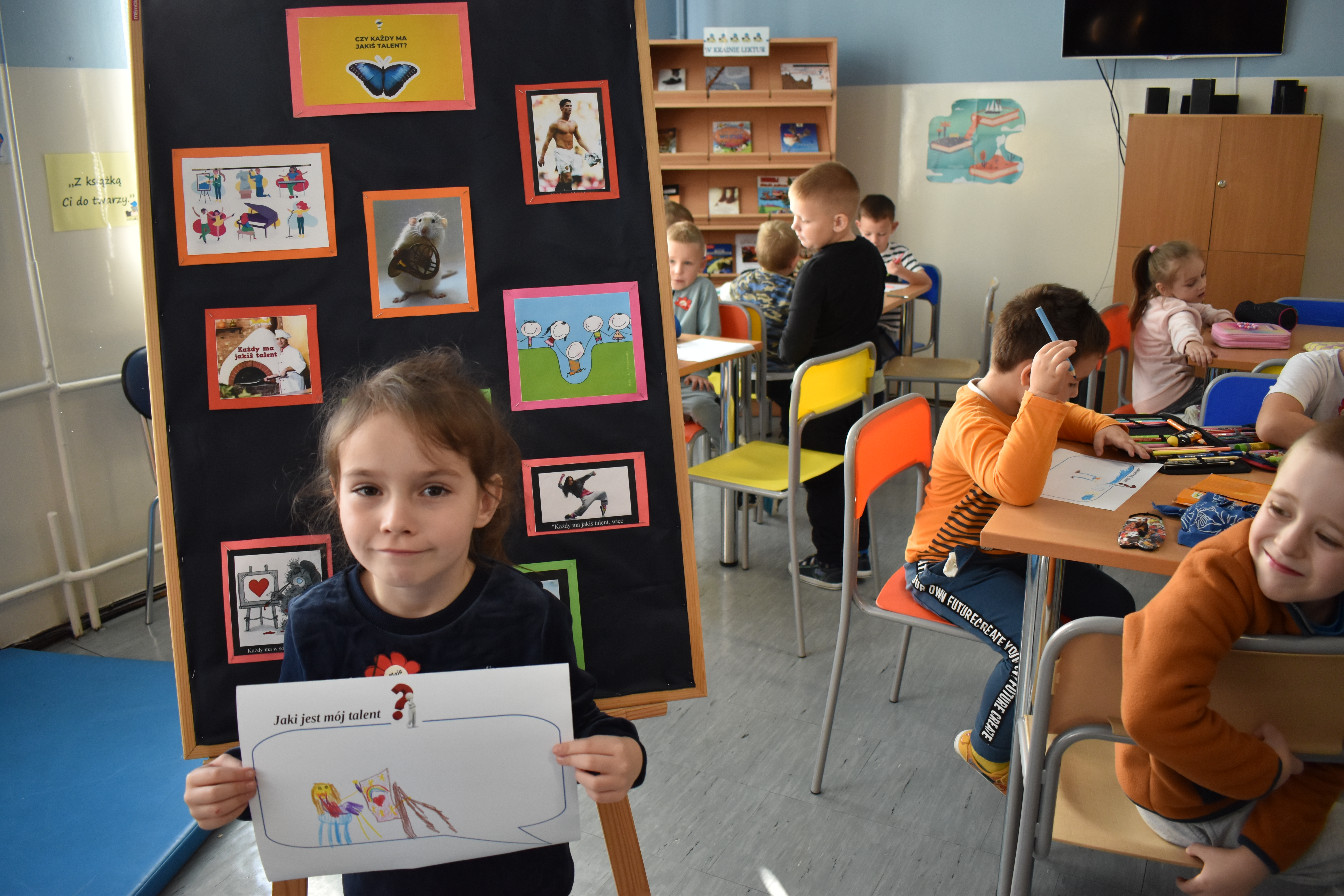 Podczas pierwszego spotkania, które odbyło się w bibliotece, dzieci miały możliwość rozmowy o talentach, jakie ma każdy z nas. Opowiedziały o swoich zdolnościach, umiejętnościach i swoich mocnych stronach. Wysłuchały bajeczki terapeutycznej – „Nie potrafię” i narysowały ilustracje prezentujące ich „talenty” lub mocne strony. Przygotowane przez dzieci prace plastyczne znalazły się na wystawie bibliotecznej.