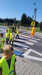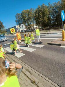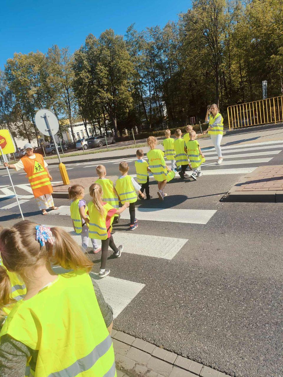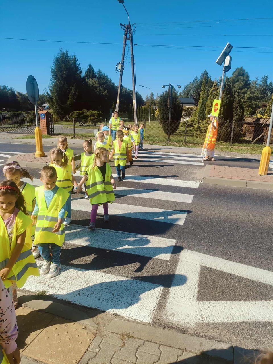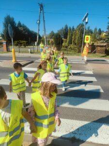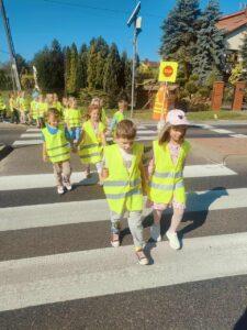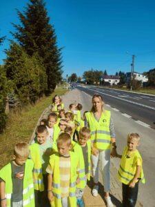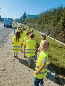 Dzieci uczyły się, jak prawidłowo przechodzić przez ulicę, na co zwrócić uwagę podczas spaceru oraz jak zachowywać się w pobliżu jezdni. Spacer był świetną okazją do praktycznego zastosowania wiedzy zdobytej na zajęciach.