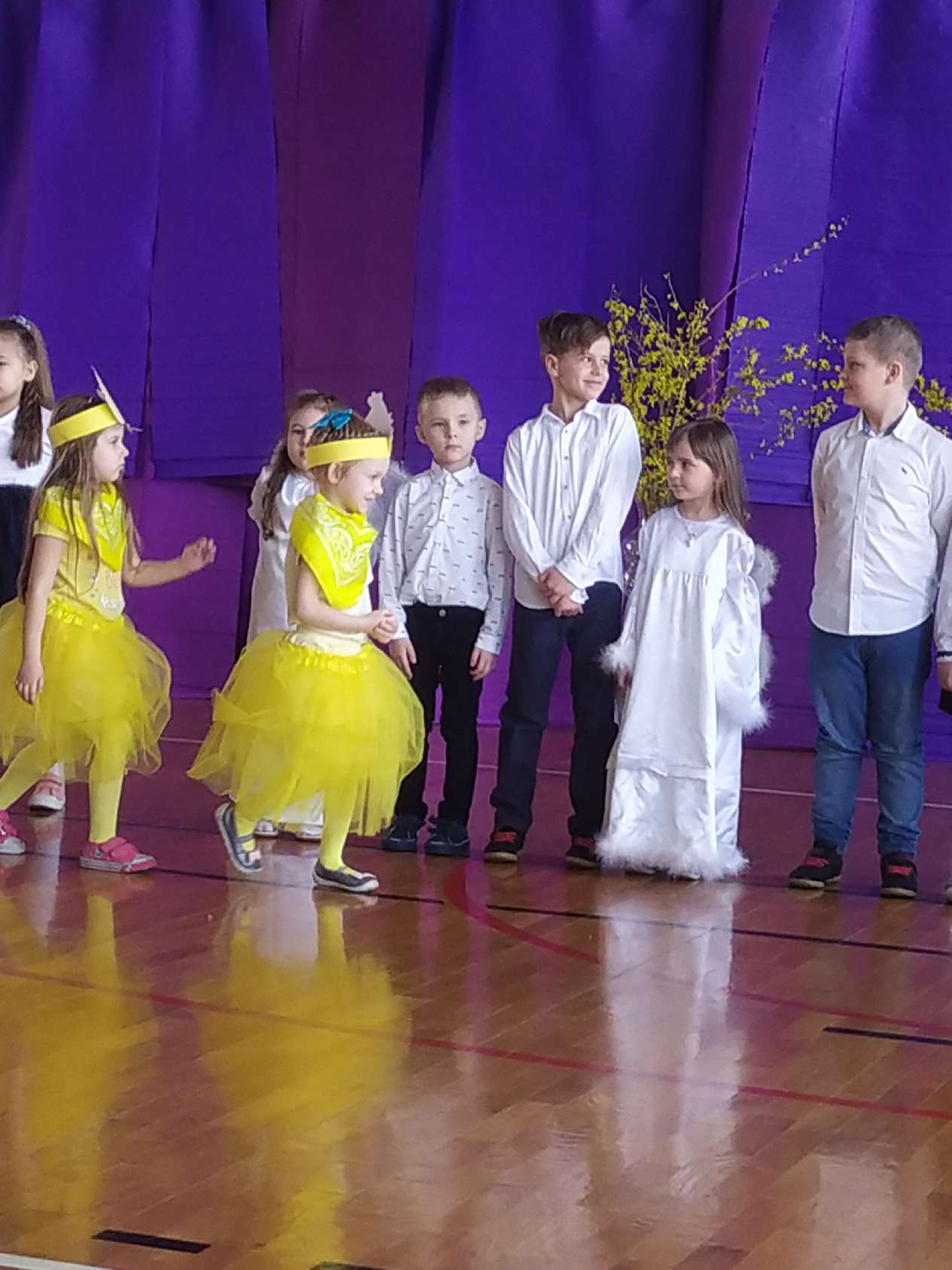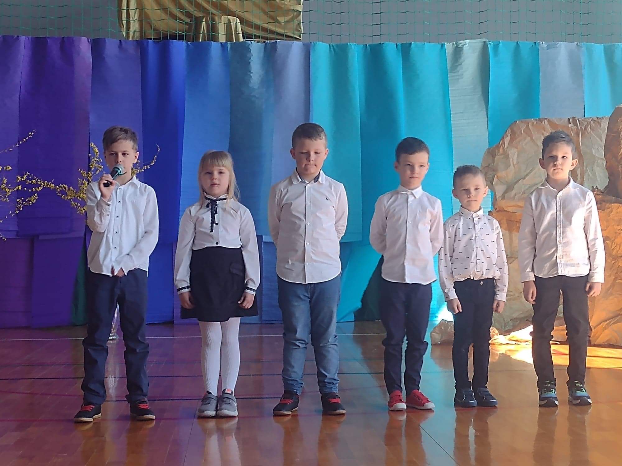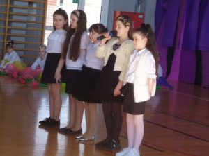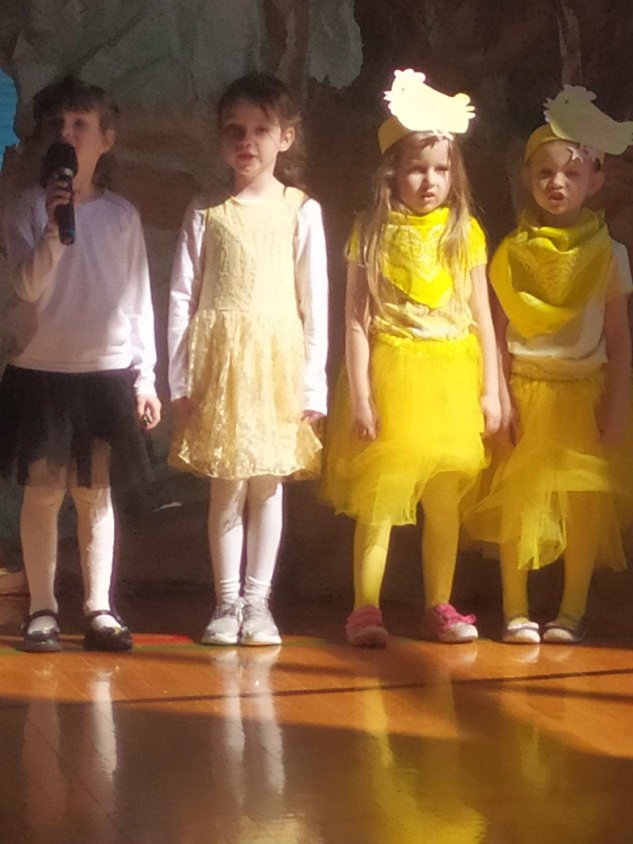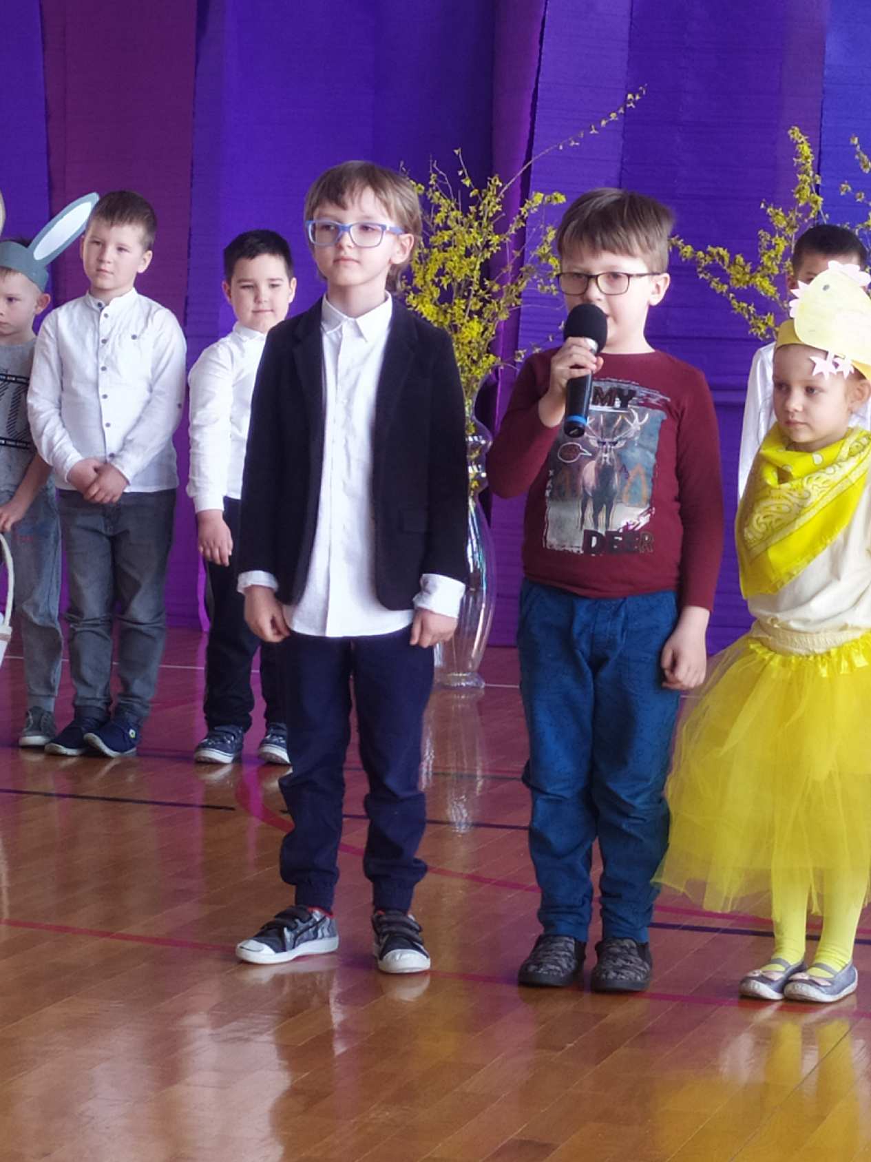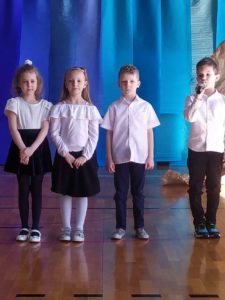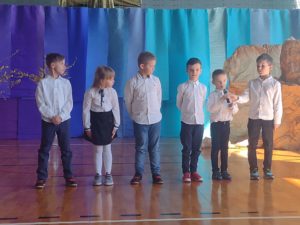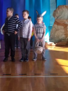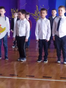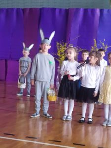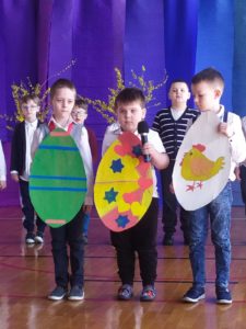 13 kwietnia w naszej szkole odbyło się uroczyste przedstawienie z okazji zbliżających się Świąt Wielkanocnych. W programie artystycznym przygotowanym przez panie: Ewelinę Wakułę i Katarzynę Tkaczyk wystąpiły dzieci z klas zerowych oraz uczniowie klas 0-3. Spektakularna dekoracja, przygotowana przez Panią Ewę Banaszczyk, nastorojowe piosenki w wykonaniu szkolnego chóru pod opieką Pani Izabeli Tracz, przepiękny taniec dziewcząt z zespołu „Gracja”, który przygotowała Pani Paulina Pyzara oraz bogate stroje i duże zaangażowanie małych aktorów sprawiły, że występ został nagrodzony gromkimi brawami przez publiczność.