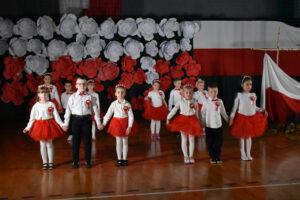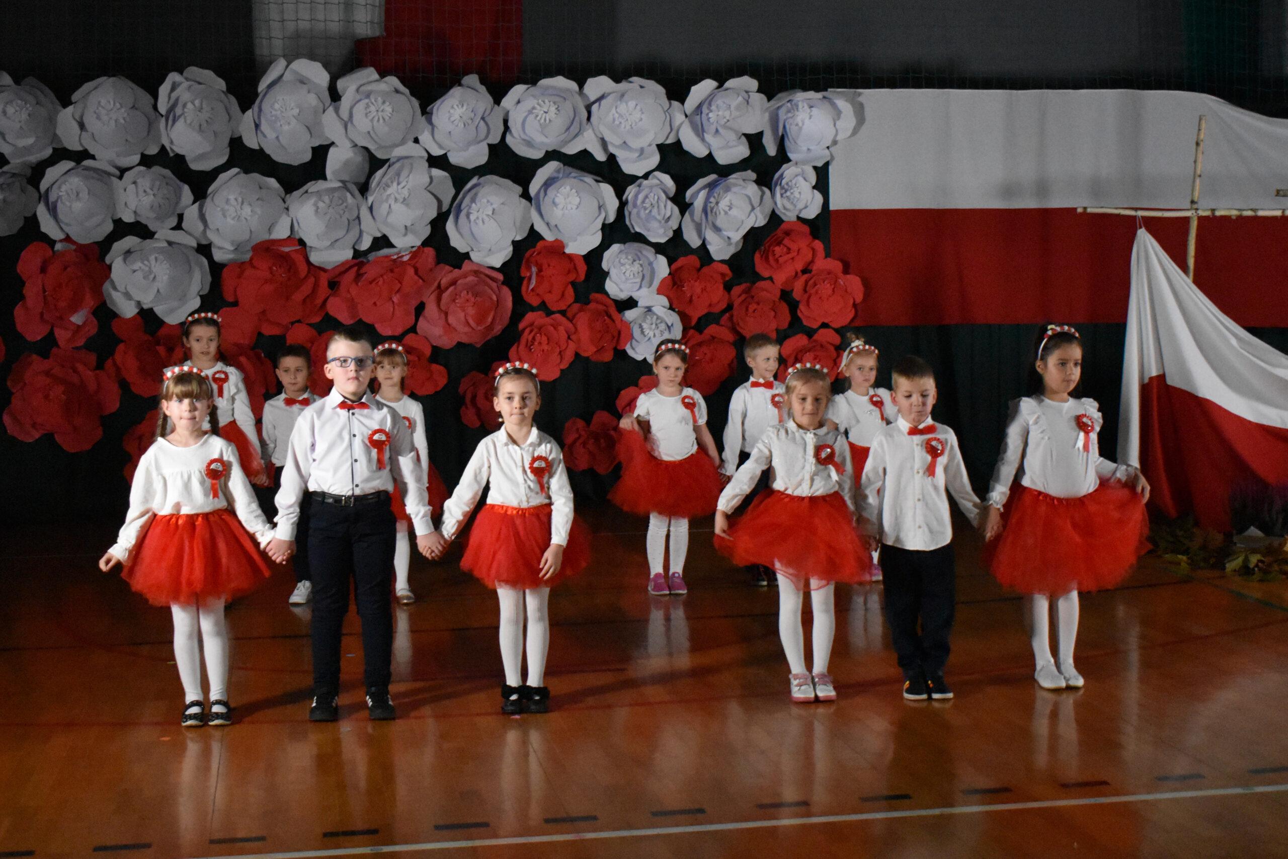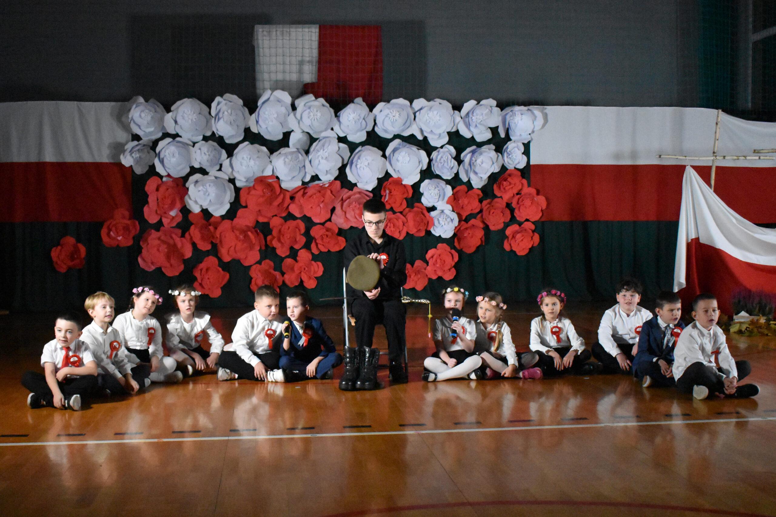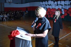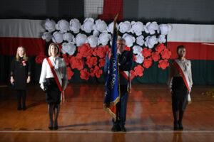 Dalsza część uroczystości miała miejsce na terenie szkoły. Aby podkreślić patriotyczny charakter wydarzenia i poczuć atmosferę tego święta, wprowadzony został sztandar szkoły przez poczet sztandarowy oraz wspólnie odśpiewany hymn państwowy. Część oficjalną rozpoczęła Pani Dyrektor Małgorzata Trelka, która powitała przybyłych gości, a następnie przypomniała, że 106 lata temu spełniło się najpiękniejsze marzenie pokoleń Polaków. Po 123 latach niewoli, przelanej krwi, czekania, nadziei, walki i cierpienia odrodziła się wolna i niepodległa Rzeczpospolita. Dodała, że tak liczny udział w dzisiejszym wydarzeniu jest potwierdzeniem wielkiego szacunku i wdzięczności wobec Polaków, którzy walczyli o wolną, niepodległą Ojczyznę, którzy w walce poświęcili to, co najcenniejsze dla każdego człowieka – oddali swoje życie z miłości do kraju i wiary w zwycięstwo. Pani Dyrektor podkreśliła, że dzisiejsza uroczystość ma jeszcze jedno szczególne znaczenie, jakim jest otwarcie nowego przedszkola – symbol naszej troski o przyszłość kolejnych pokoleń.