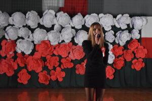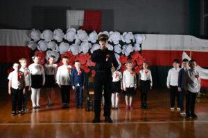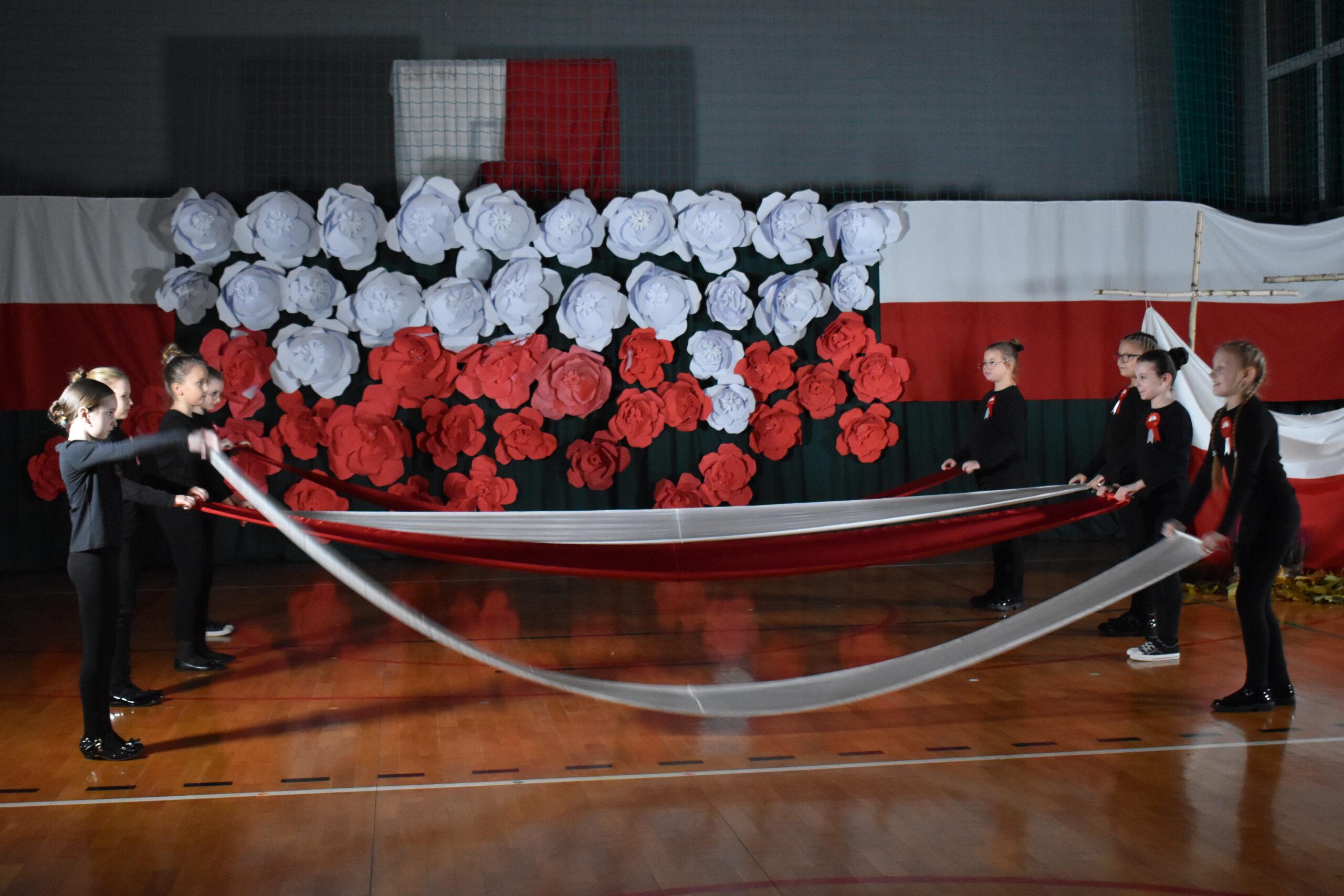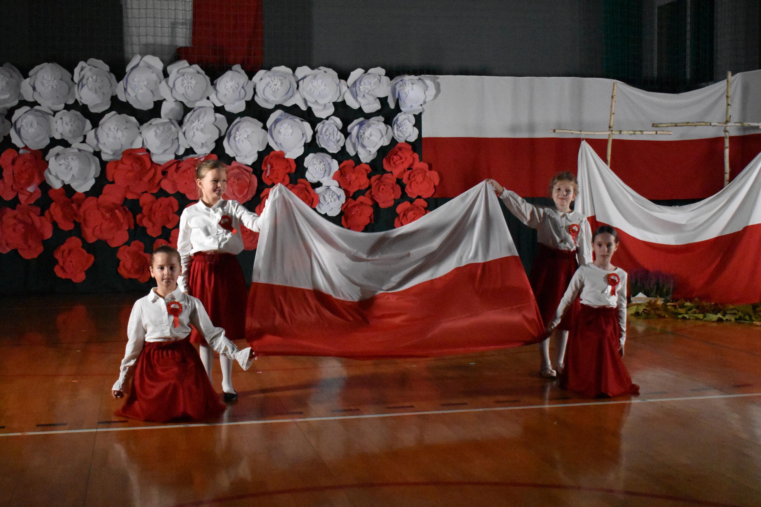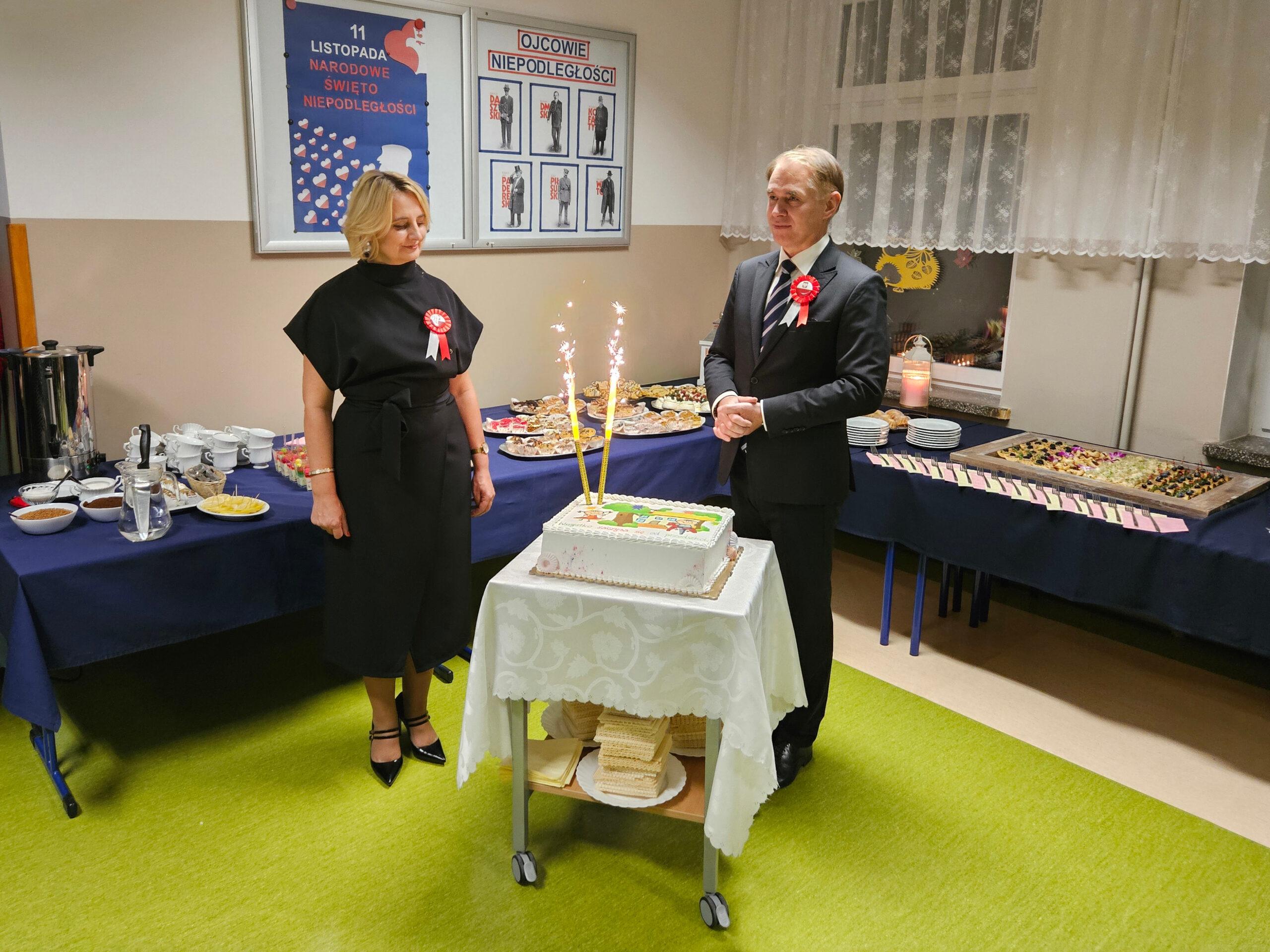 Dalsza część uroczystości miała miejsce na terenie szkoły. Aby podkreślić patriotyczny charakter wydarzenia i poczuć atmosferę tego święta, wprowadzony został sztandar szkoły przez poczet sztandarowy oraz wspólnie odśpiewany hymn państwowy. Część oficjalną rozpoczęła Pani Dyrektor Małgorzata Trelka, która powitała przybyłych gości, a następnie przypomniała, że 106 lata temu spełniło się najpiękniejsze marzenie pokoleń Polaków. Po 123 latach niewoli, przelanej krwi, czekania, nadziei, walki i cierpienia odrodziła się wolna i niepodległa Rzeczpospolita. Dodała, że tak liczny udział w dzisiejszym wydarzeniu jest potwierdzeniem wielkiego szacunku i wdzięczności wobec Polaków, którzy walczyli o wolną, niepodległą Ojczyznę, którzy w walce poświęcili to, co najcenniejsze dla każdego człowieka – oddali swoje życie z miłości do kraju i wiary w zwycięstwo. Pani Dyrektor podkreśliła, że dzisiejsza uroczystość ma jeszcze jedno szczególne znaczenie, jakim jest otwarcie nowego przedszkola – symbol naszej troski o przyszłość kolejnych pokoleń.