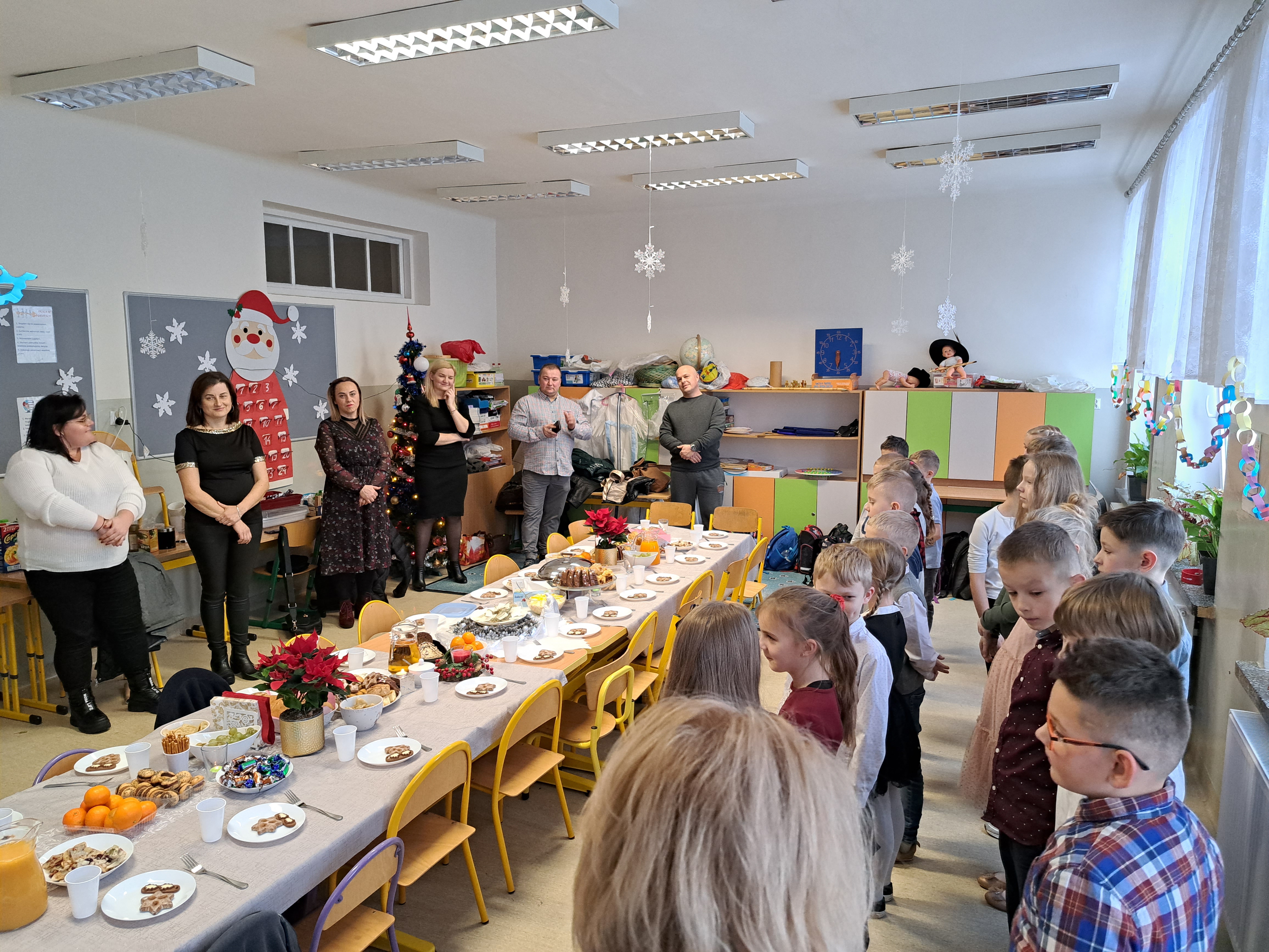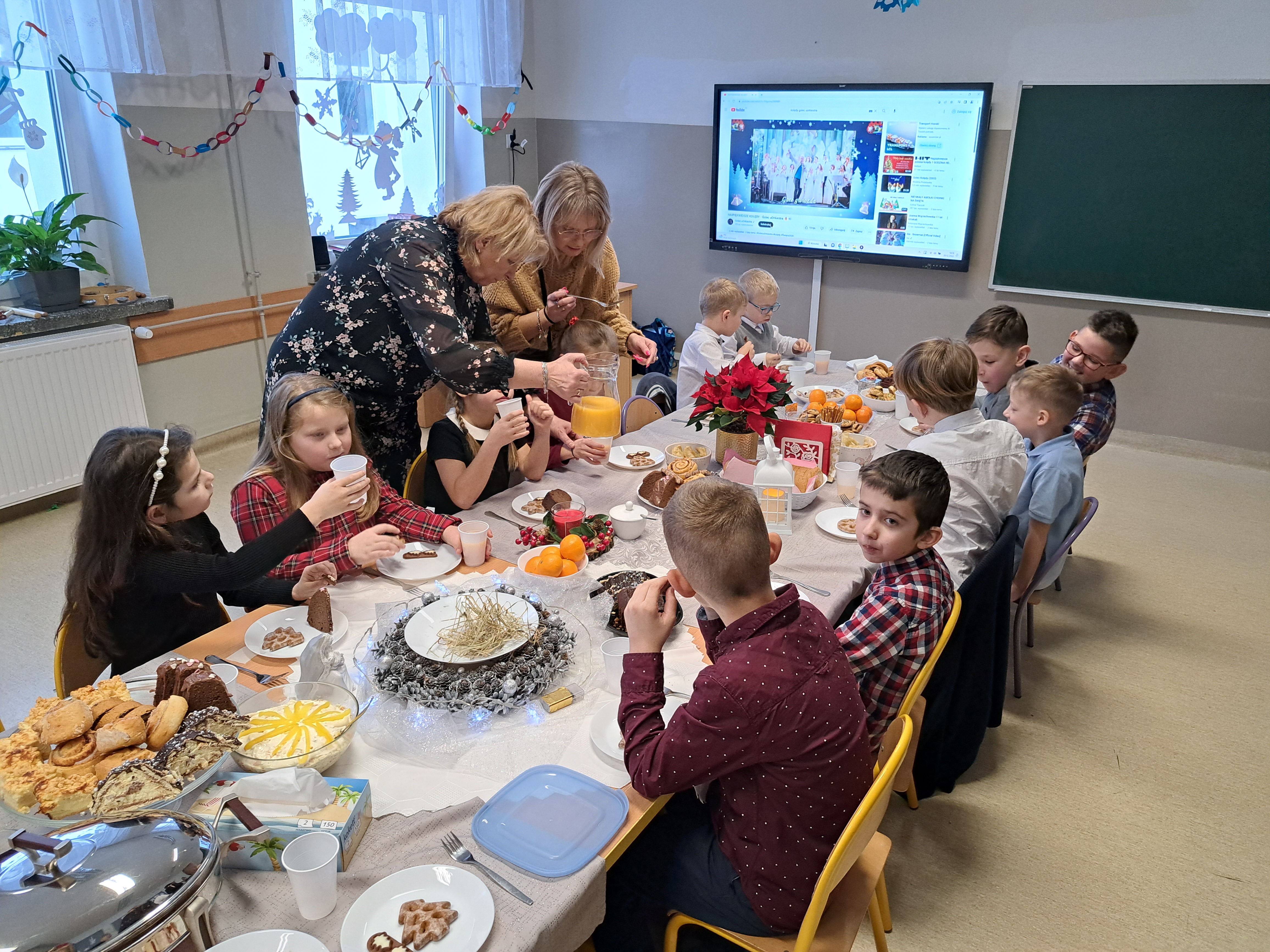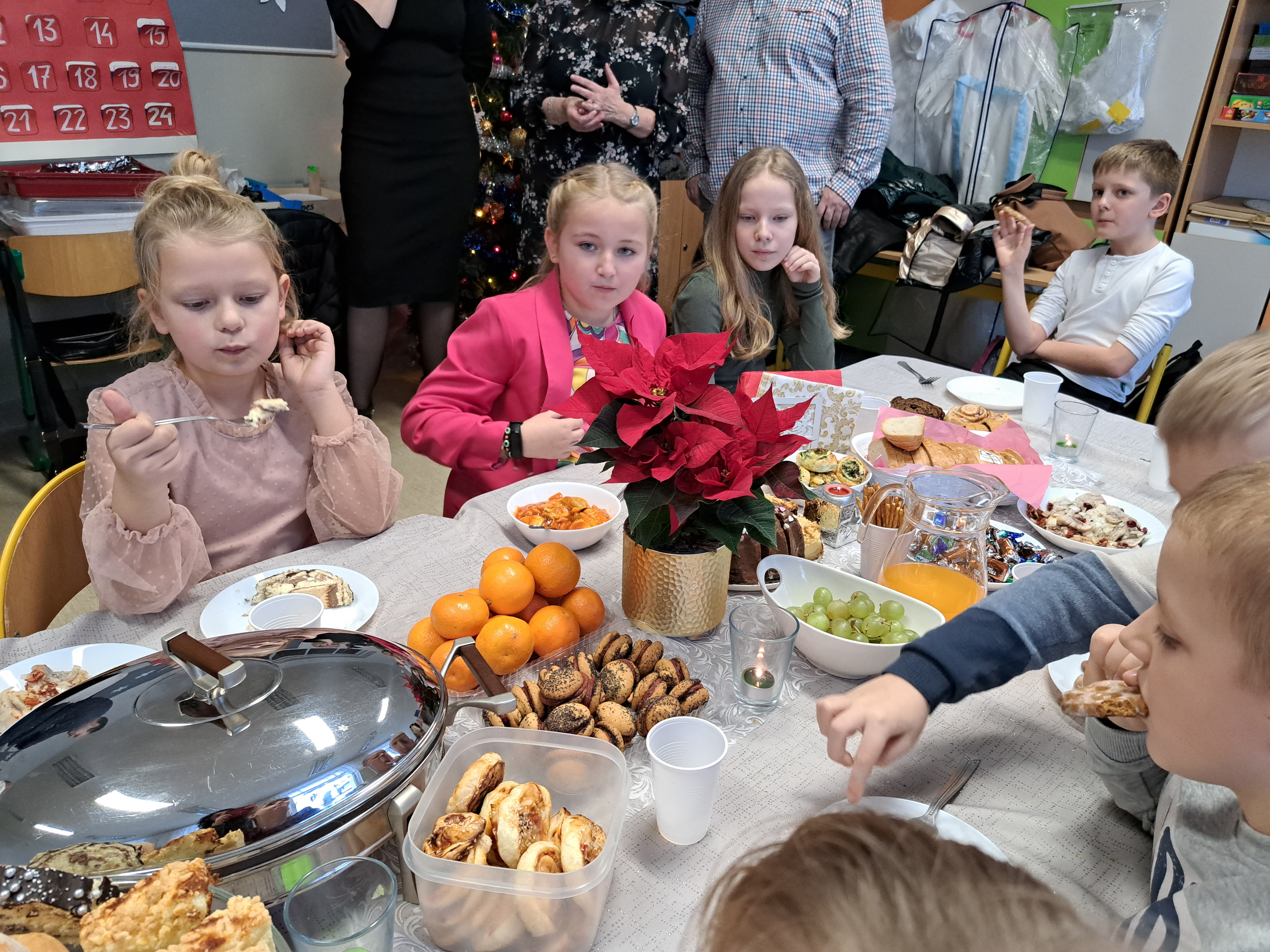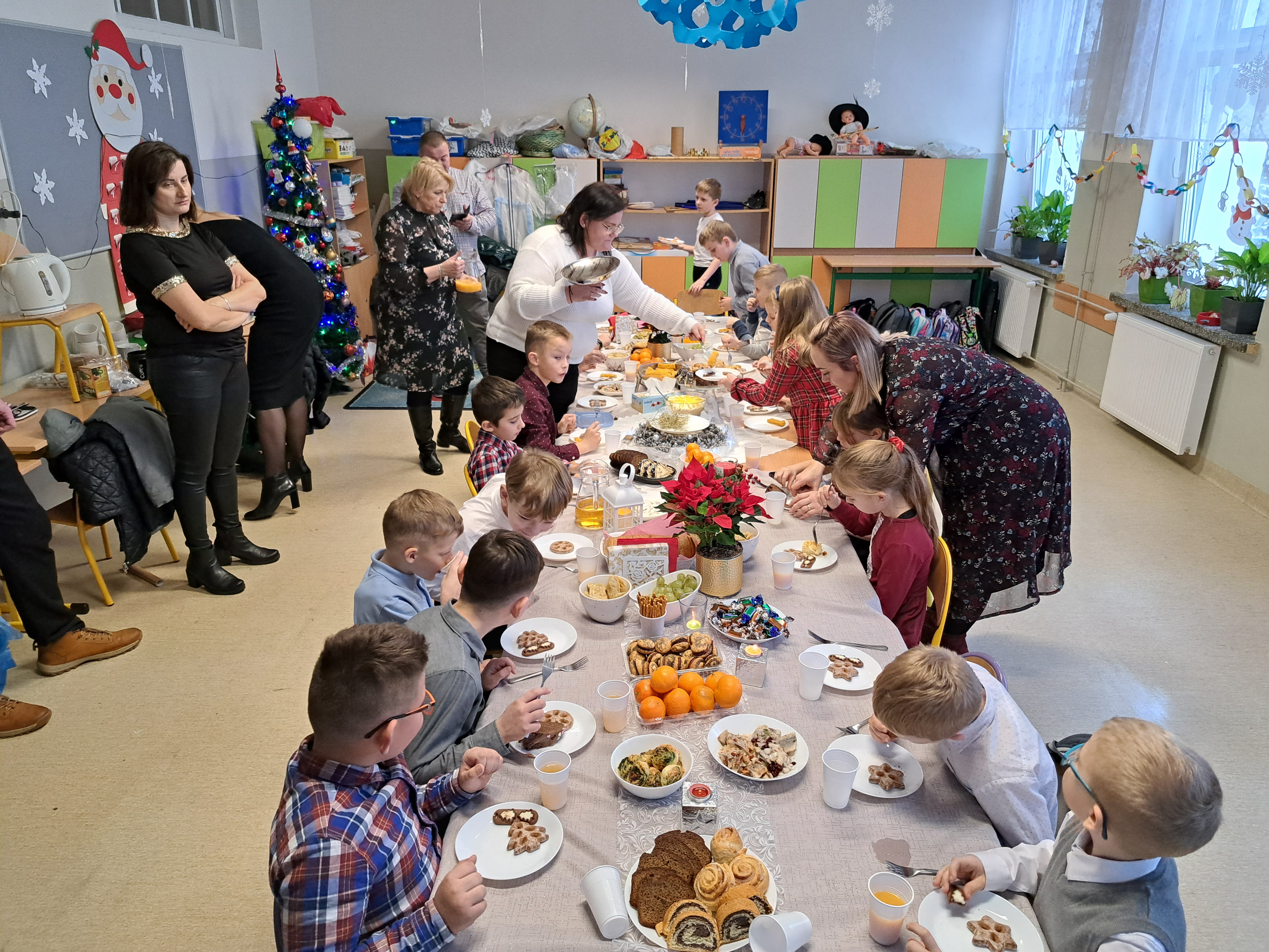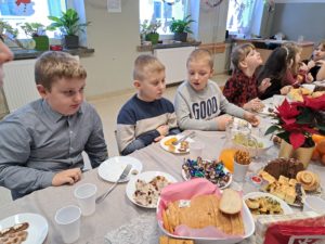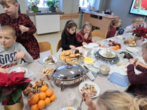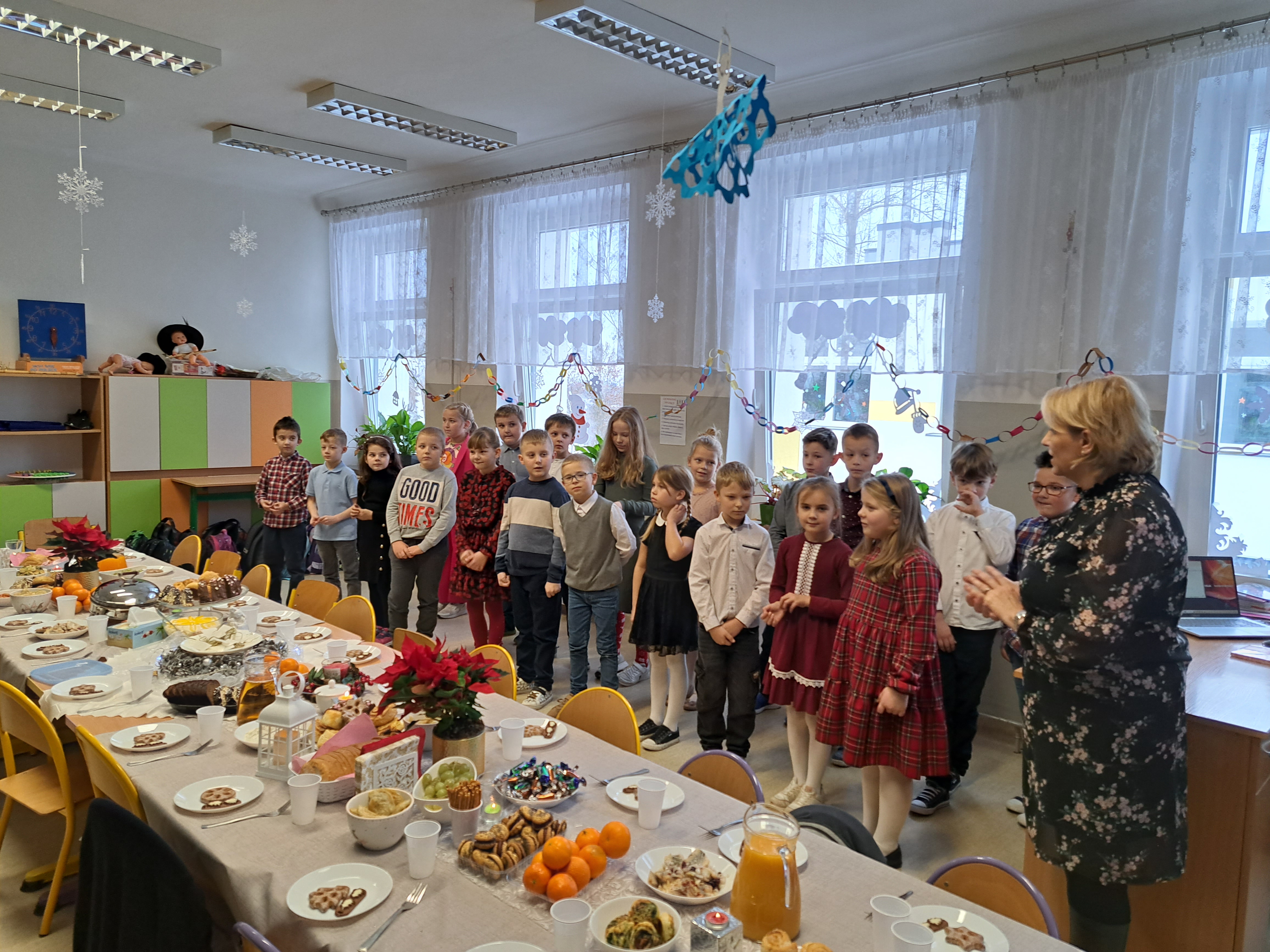 Zgodnie z tradycją naszej szkoły przed świętami Bożego Narodzenia spotykamy się na klasowych wigiliach. Dzięki pomocy rodziców w klasie 2a przygotowano uroczysty poczęstunek. Przy pięknie ustrojonym stole zasiedliśmy do wieczerzy wigilijnej. Dzieląc się opłatkiem i śpiewając kolędy złożyliśmy sobie życzenia świąteczne.