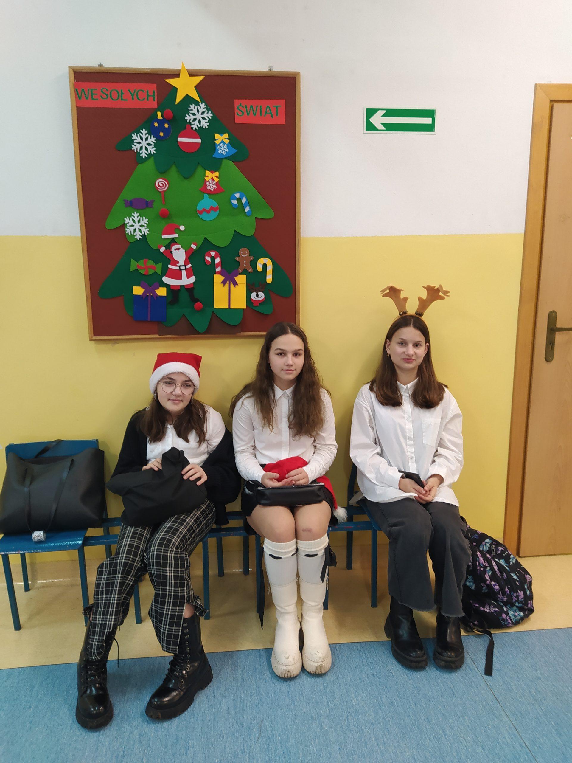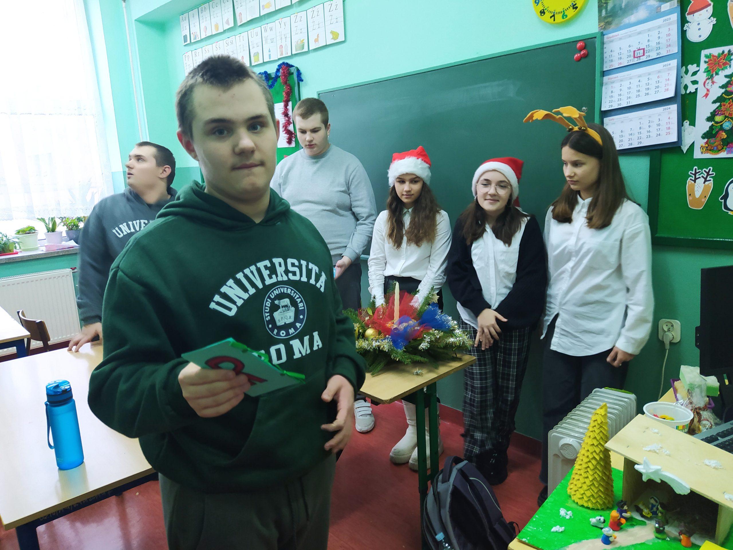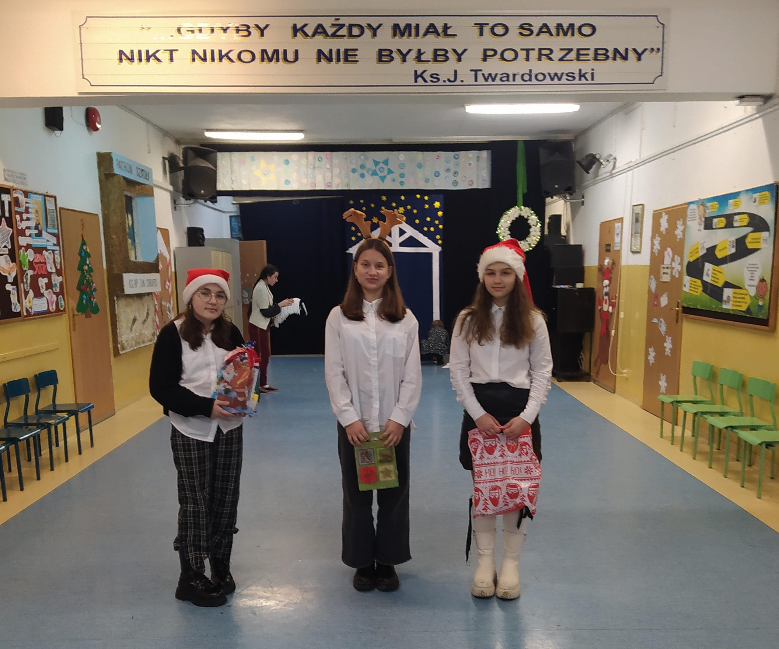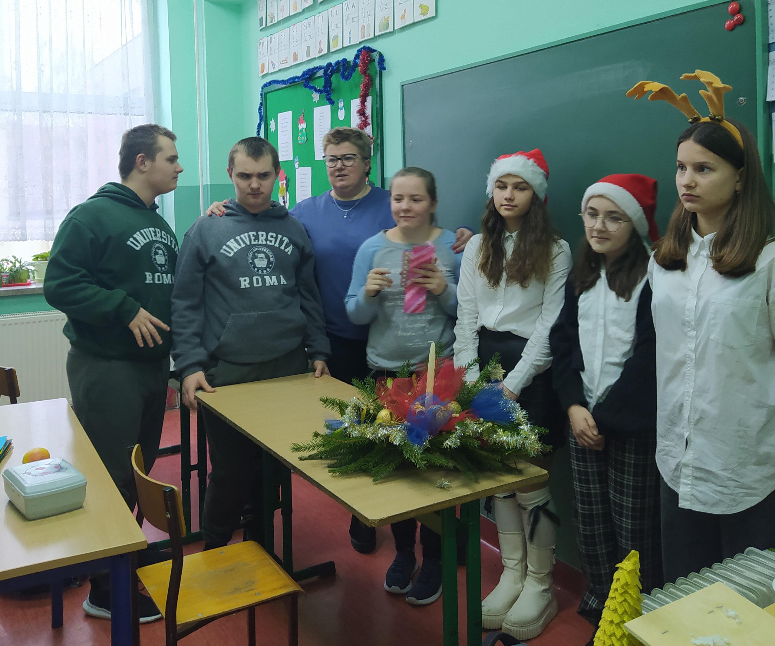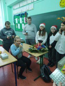 Wolontariuszki przygotowały sensoryczne książeczki dla dzieci ze spektrum autyzmu oraz bożonarodzeniową szopkę i stroik świąteczny do wystroju klasy 7 Cp. Podczas oczekiwania na lekcję w tej klasie, spotkaliśmy na korytarzu pana dyrektora, Krzysztofa Sońtę, który podziękował nam za przybycie i poczęstował bombonierką, zapraszając jednocześnie do kolejnych odwiedzin. W czasie wizyty w klasie dzieci częstowały się wzajemnie pierniczkami i innymi smakołykami świątecznymi. Wolontariusze mogli zobaczyć z bliska, jak wygląda praca z dziećmi niepełnosprawnymi. W tygodniu przedświątecznym odbywał się też kiermasz świąteczny, organizowany przez wolontariat z klasy 7b. Cała klasa przygotowała na lekcji z wychowawcą stroiki, oprócz tego w domach uczniów pieczone były ciasta i ciasteczka. Dochód z ich sprzedaży wyniósł ponad 500 zł. Zostanie on przeznaczony na doposażenie pracowni nr 20, a konkretnie na zakup rolet. Dziękujemy wszystkim, którzy przyłączyli się do naszej akcji i życzymy zdrowych i wesołych Świąt Bożego Narodzenia oraz szczęśliwego Nowego Roku!