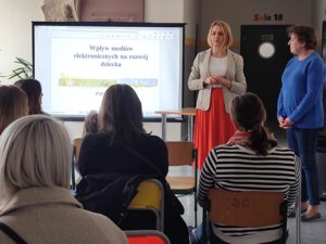 Dnia 26.04.22r. o godzinie 15.30 odbyła się prelekcja dla rodziców dzieci z oddziałów przedszkolnych oraz edukacji wczesnoszkolnej pt. “Wpływ mediów elektronicznych na rozwój dziecka”. Szkolenie poprowadziła pani psycholog Małgorzata Zaręba z Poradni Psychologiczno – Pedagogicznej w Radomiu, ul. Kolejowa 15.