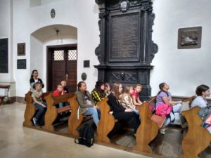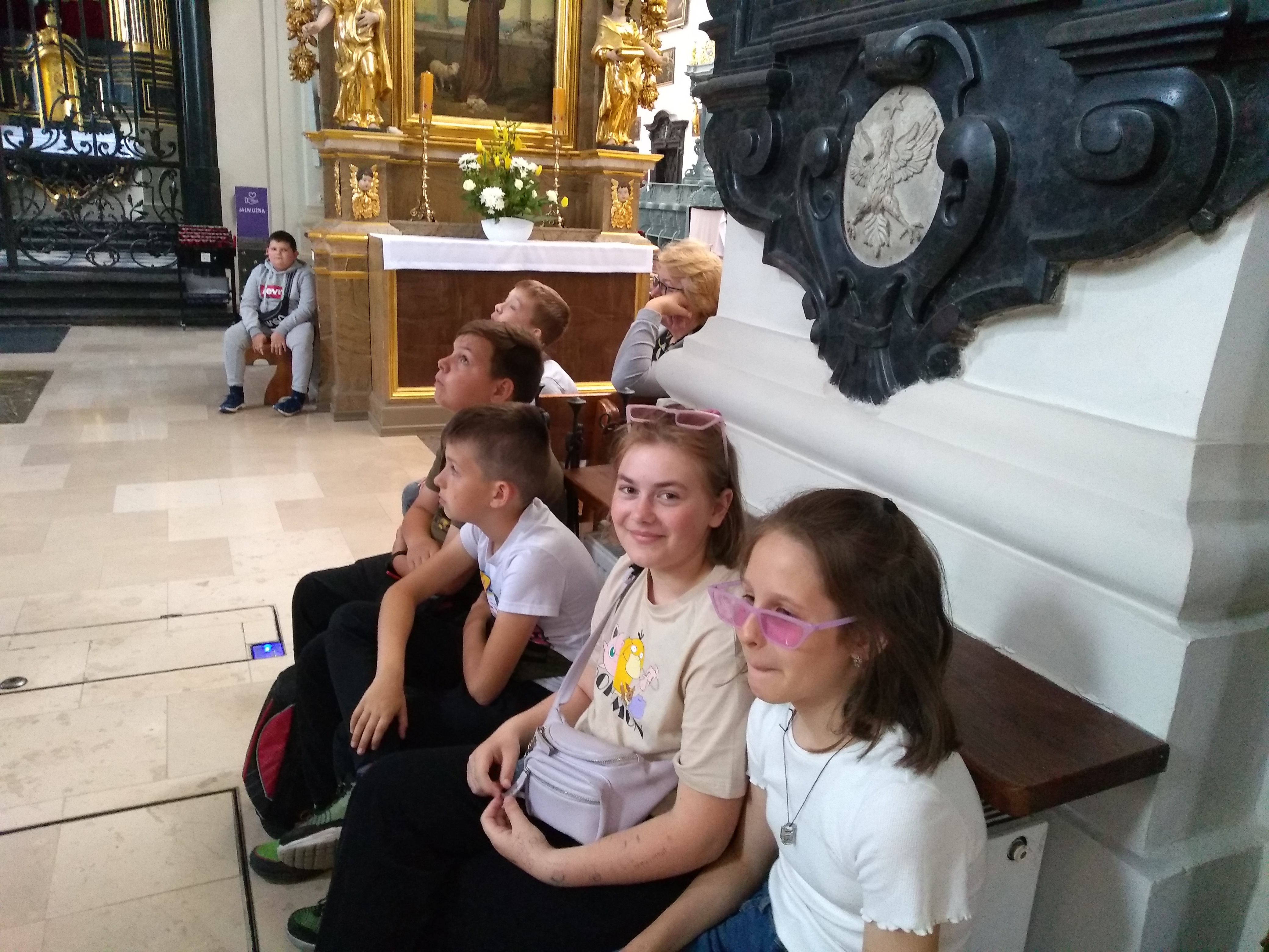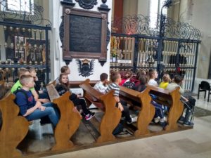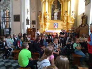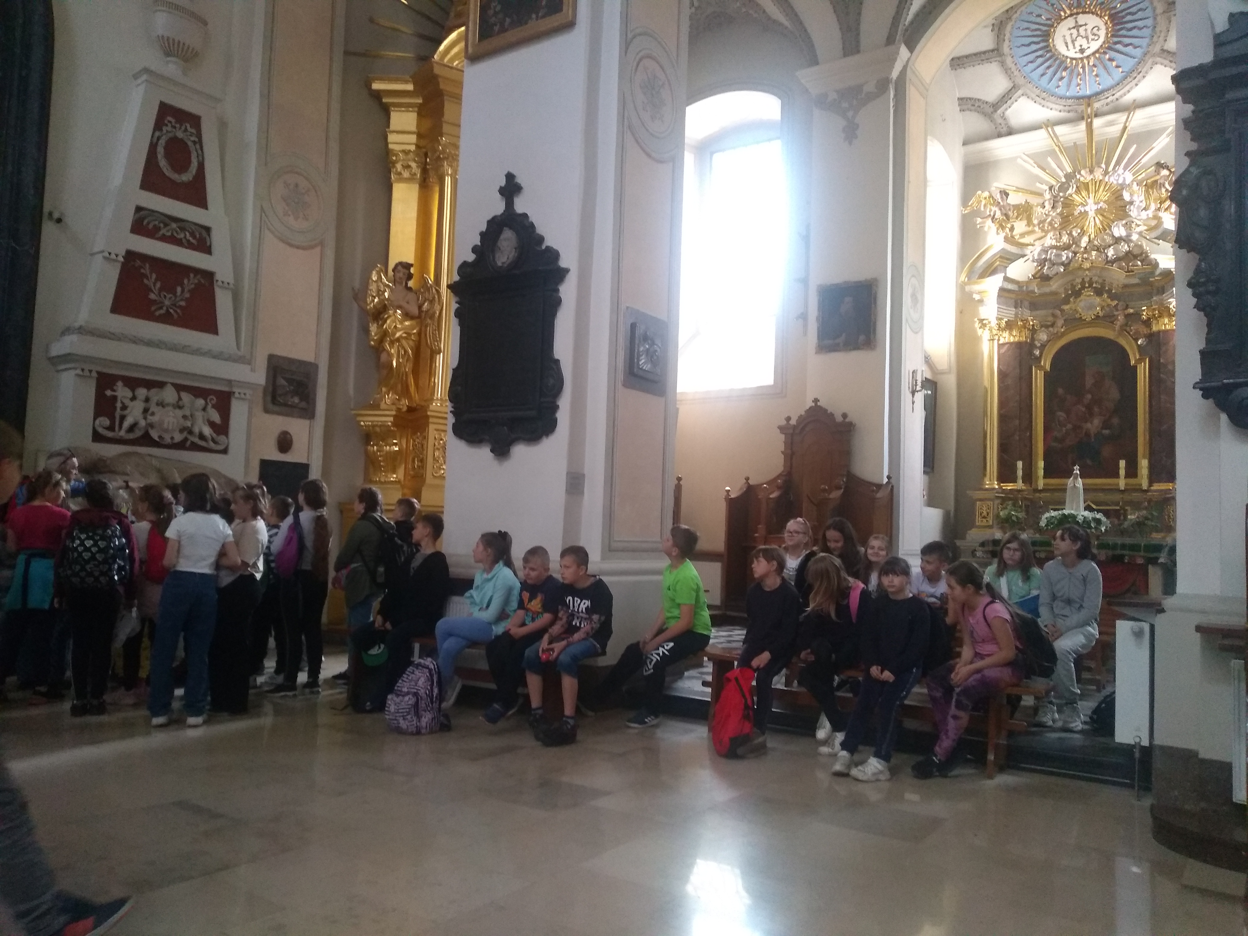 Następnie przejechaliśmy do Łowicza, gdzie zwiedziliśmy przepiękną bazylikę łowicką nazywaną sakralną perłą. Pan przewodnik zapoznał uczniów z jej ciekawą historię i zwrócił uwagę na interesujące elementy wystroju. Po zwiedzeniu bazyliki mniejszej przeszliśmy do Muzeum Guzików oraz sklepu z pamiątkami, gdzie nasi podopieczni dokonali zakupów – głównie tych, które miały związek z malowniczą kulturą łowicką.